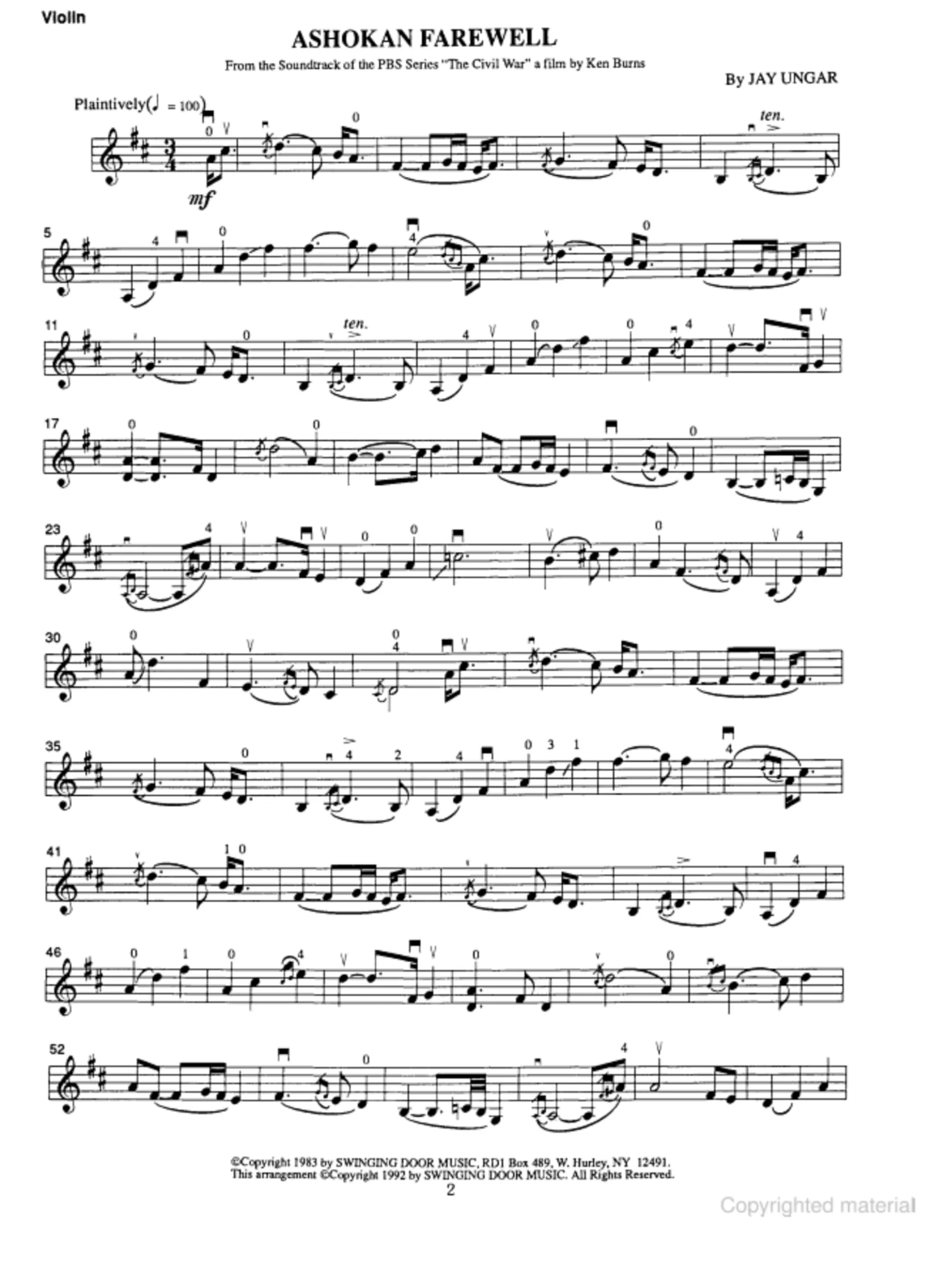 Ashokan Farewell is best known as the plaintive theme from Kenneth Burns’ highly acclaimed Civil War television documentary. In addition to Jay Ungar’s authorized solo edition as performed in the documentary series, this folio contains the touching Civil War era Sullivan Ballou Letter and Lincoln’s famed Gettysburg Address. Arranged for violin with piano accompaniment and suggested chord symbols for optional guitar and bass.