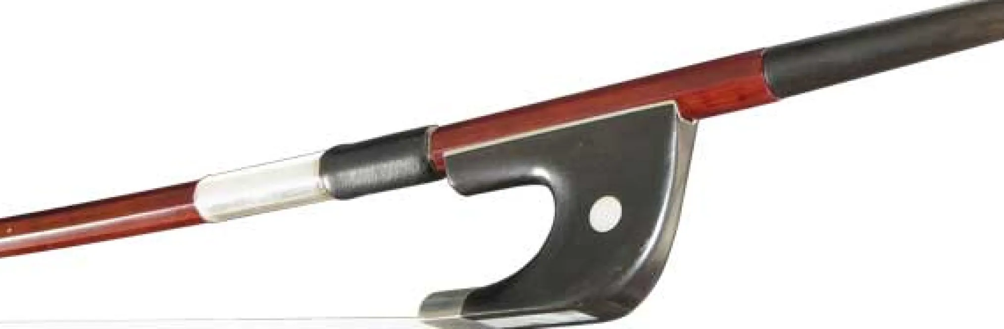 This Brazilwood bass bow has a round stick with a silver grip. The German model ebony frog is half-lined with an eye. It comes in 3/4, 1/2. or 1/4 sizes.