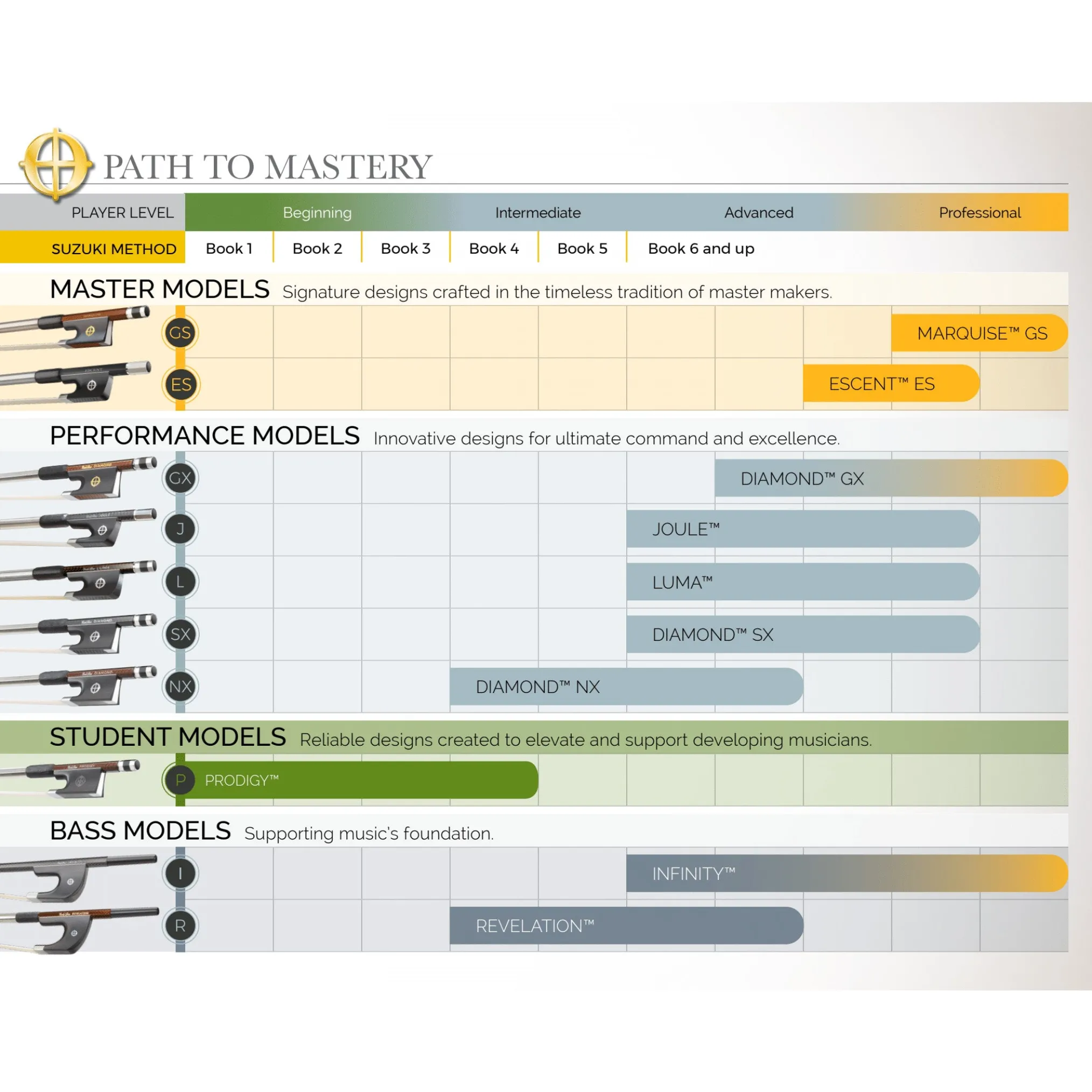 The all new carbon fiber Escent from CodaBow combines the supple response of a fine Pernambuco bow with the lively articulation oftheperformance line. The result gives the CodaBow Escent a modern energy unprecedented in bow making.