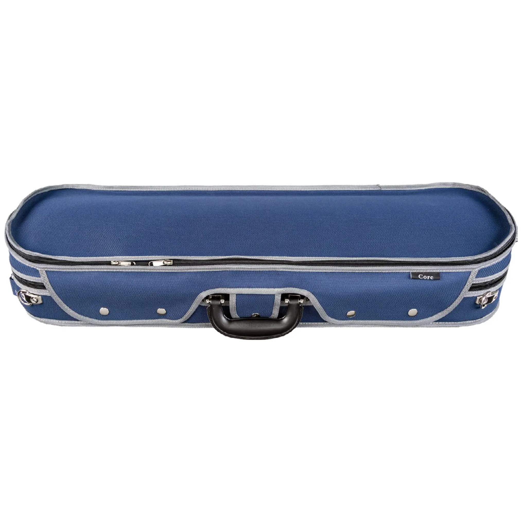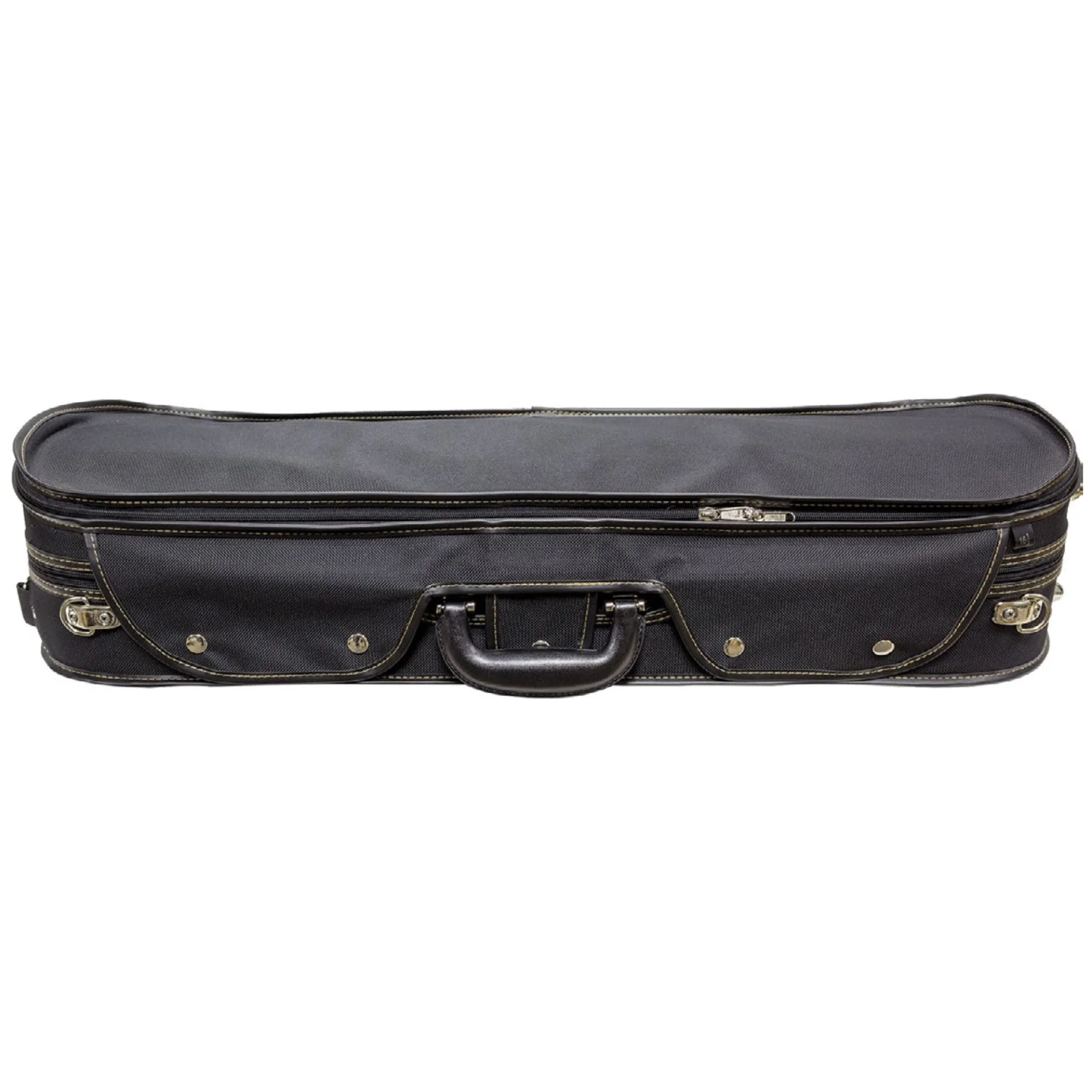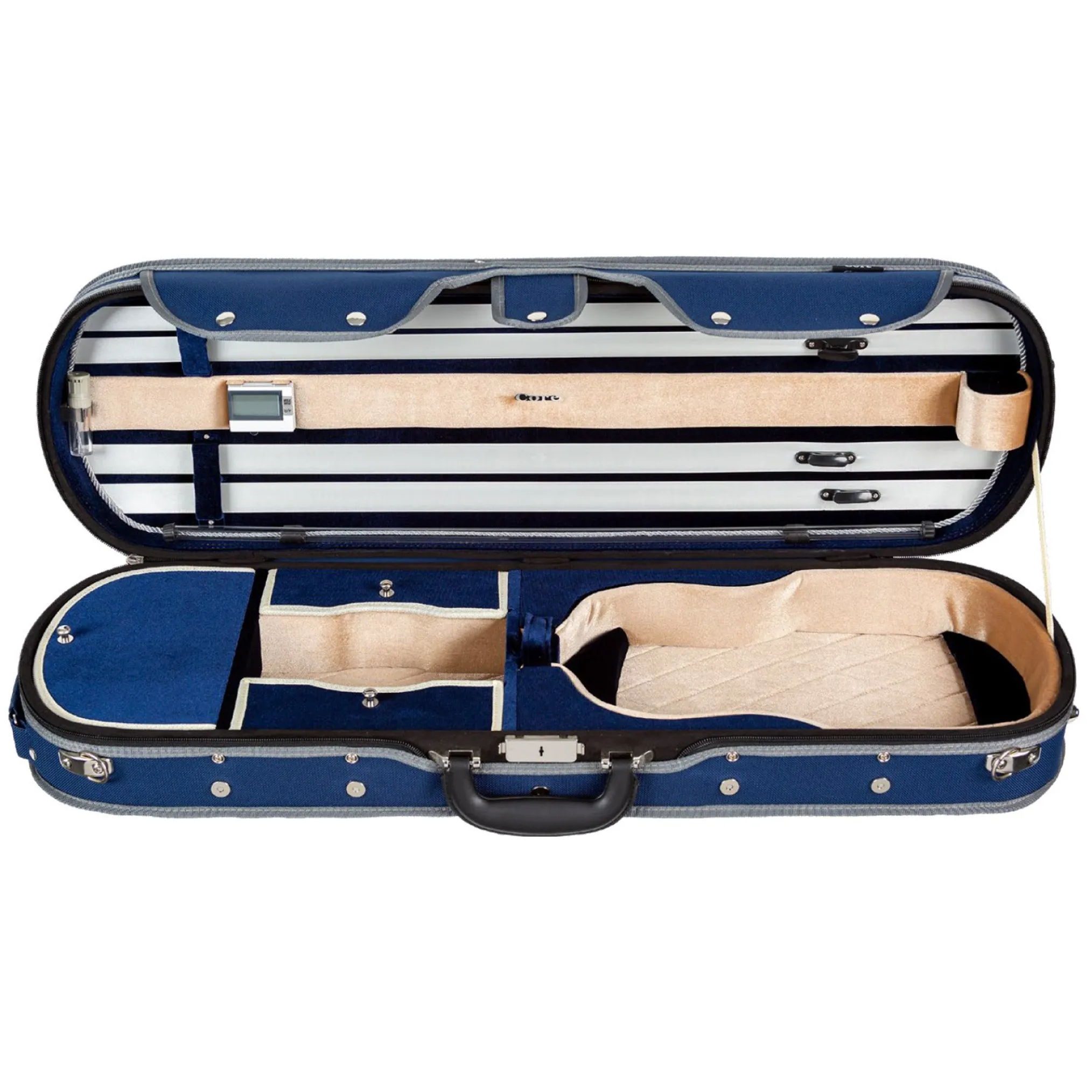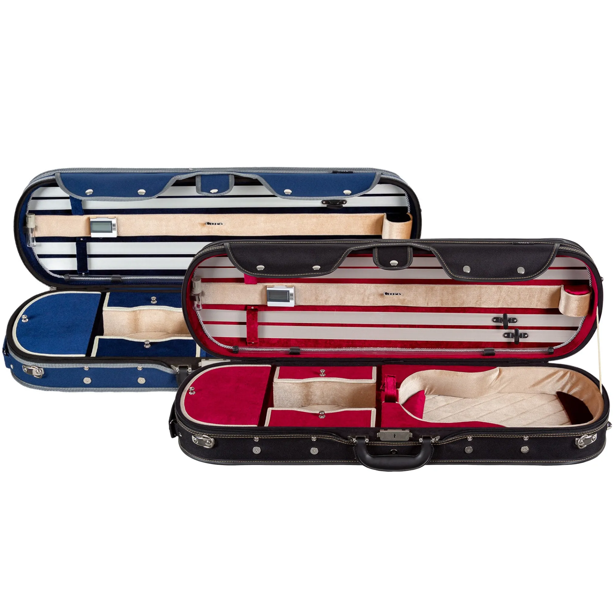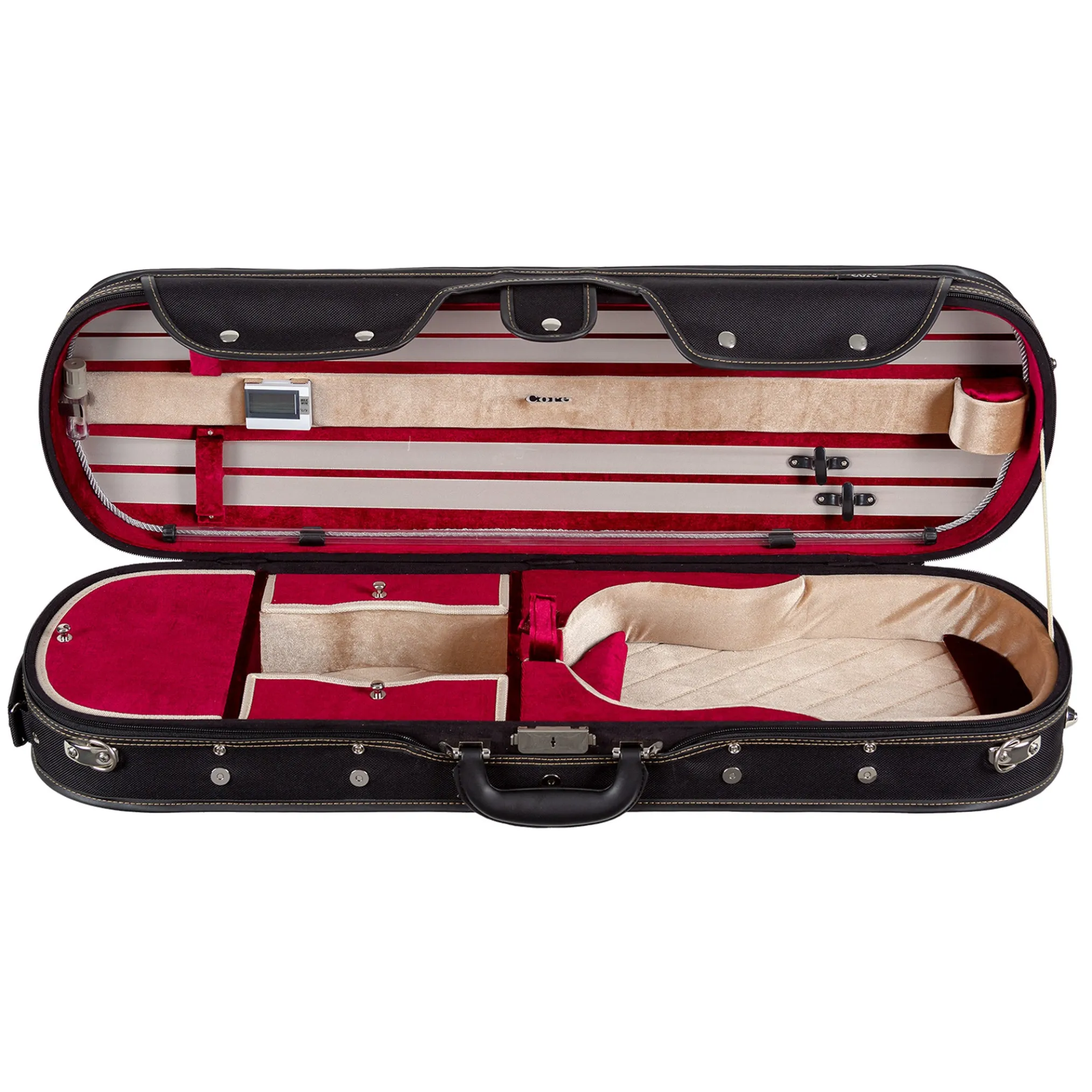Sturdy wood construction suspension case. Exterior features screw-attached cover with full-length music pocket, rain flap, comfortable leather carry handle, & pull handle. Attractive two-tone interior with quilt-stitched padded instrument bed, three large accessory pockets with metal pulls, electronic multi-function hygrometer, humidifier, and rope accents. Four bow holders.