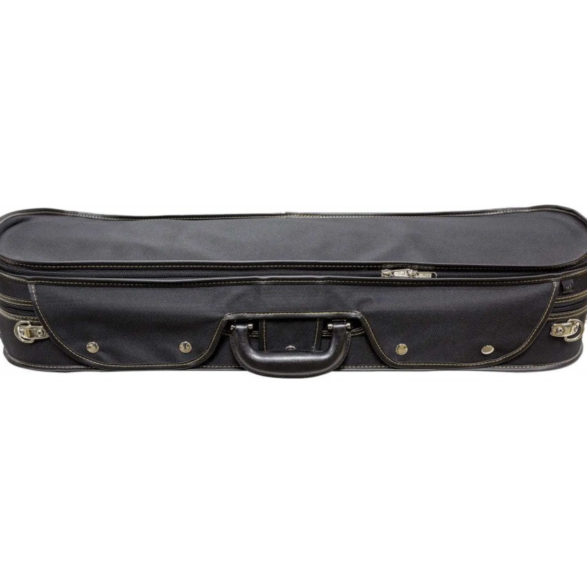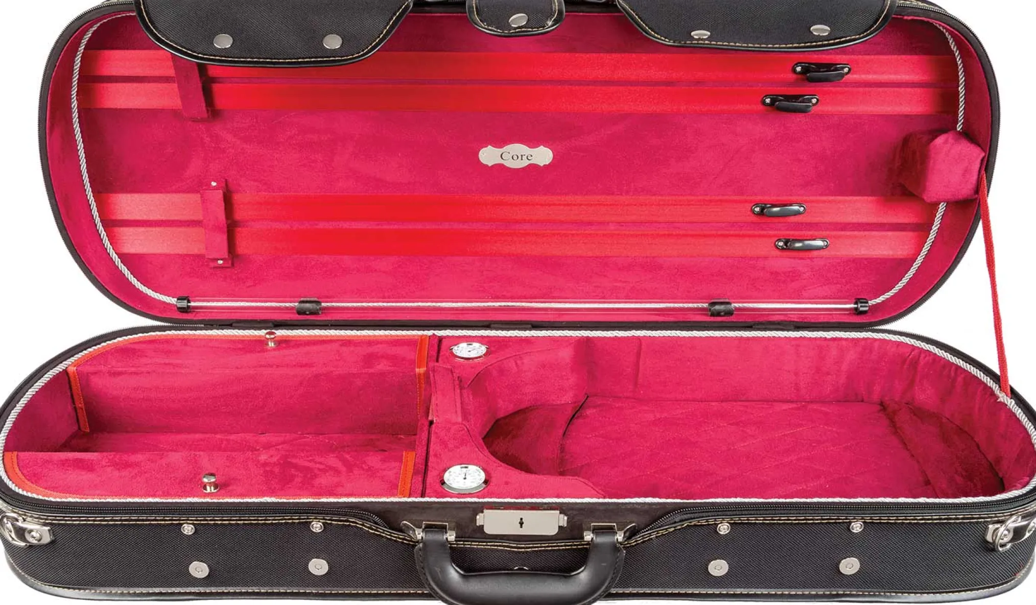 Sturdy wood construction. Exterior features screw-attached cover with full-length music pocket, rain flap, comfortable leather carry handle, and pull handle. Solid wine interior with two large accessory pockets with metal pulls, hygrometer, humidifier, and rope accents. Four bow holders.