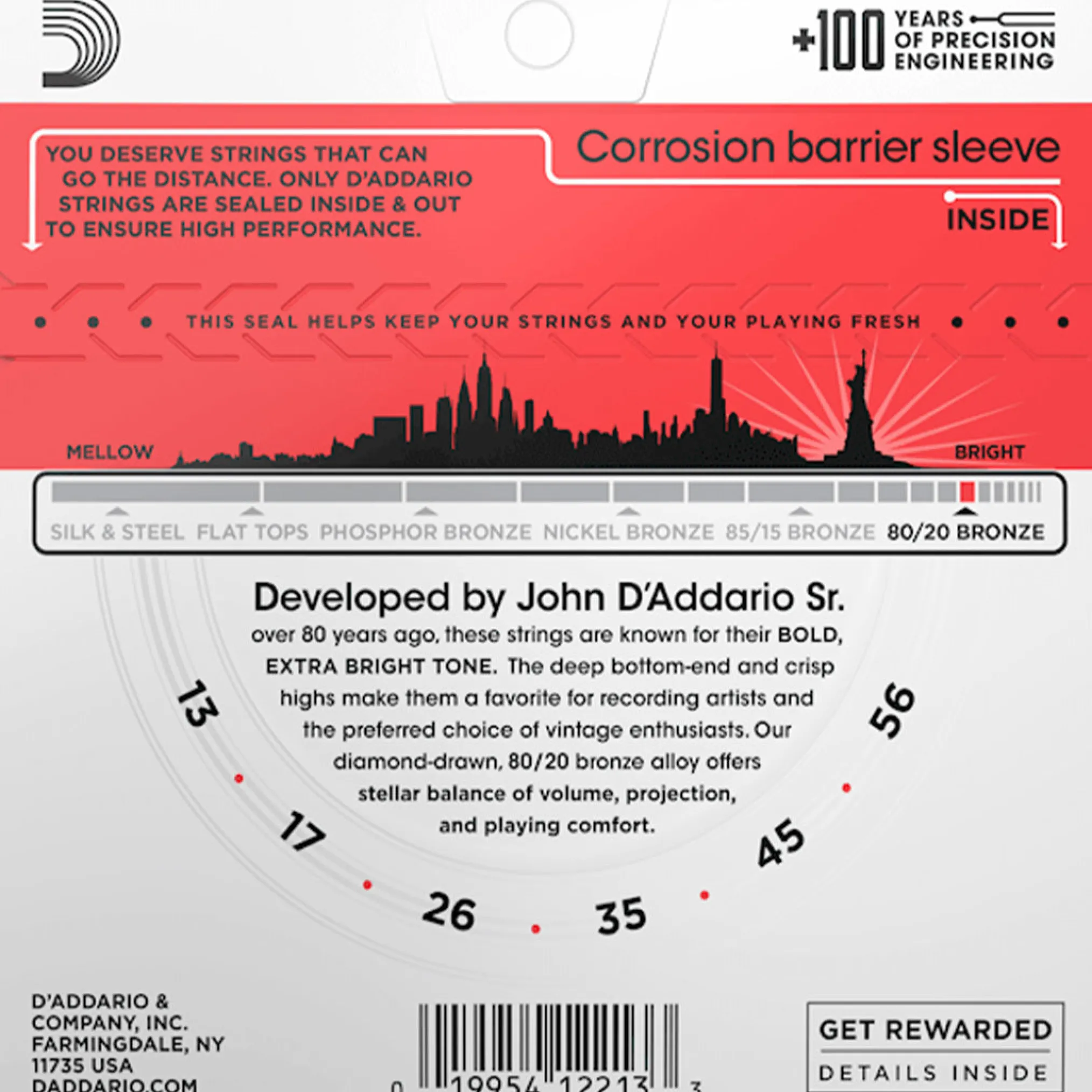 EJ12 is a medium gauge 80/20 Bronze set that offers heavier gauges for increased volume and projection. 80/20 Bronze, the original acoustic alloy introduced by John D’Addario Sr. and John D’Angelico in the 1930s is a popular alloy for recording due to their crisp, deep and projecting tone and appeal to many traditionalists and vintage enthusiasts for their historical significance.