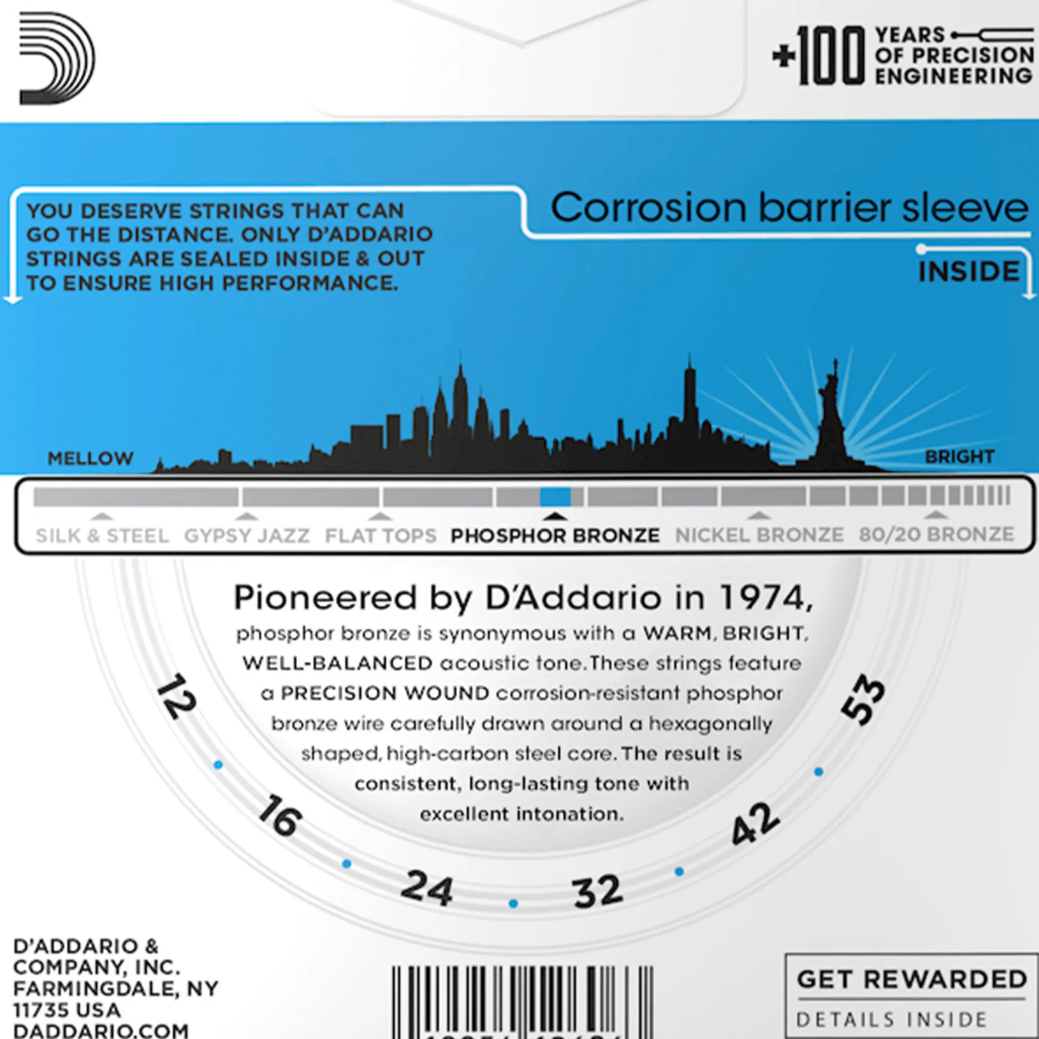 D’Addario’s pioneering Phosphor Bronze acoustic guitar strings are precision wound with phosphor bronze wrap wire over a high-carbon steel core, providing tonal versatility suitable for all acoustic styles and musical genres.