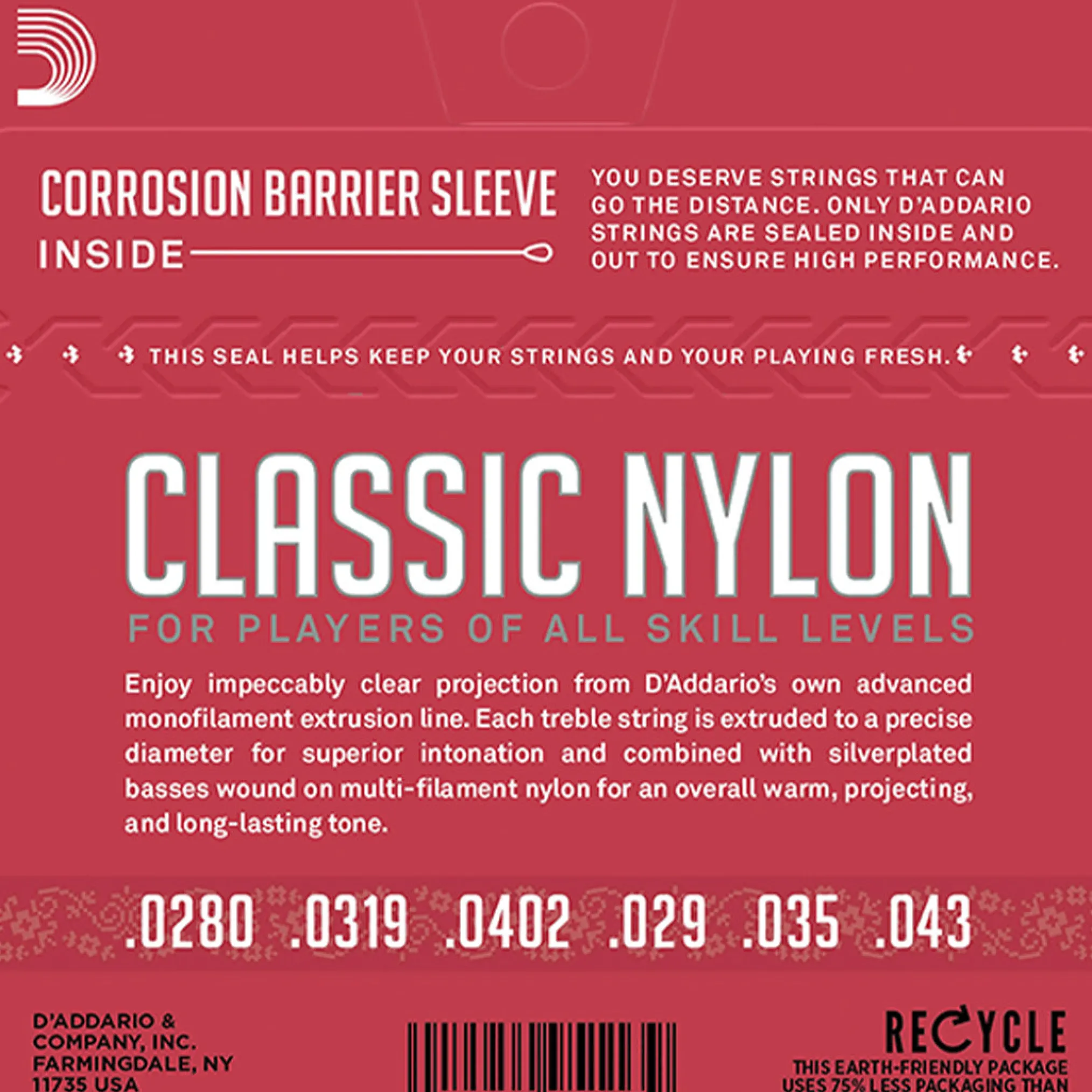 D’Addario’s EJ27N Classic Nylon guitar strings are great for beginners, students, and professionals alike. This normal tension set contains 3 clear nylon trebles and 3 silver-plated copper wound basses for the optimal balance of warm and projecting, long-lasting tone.