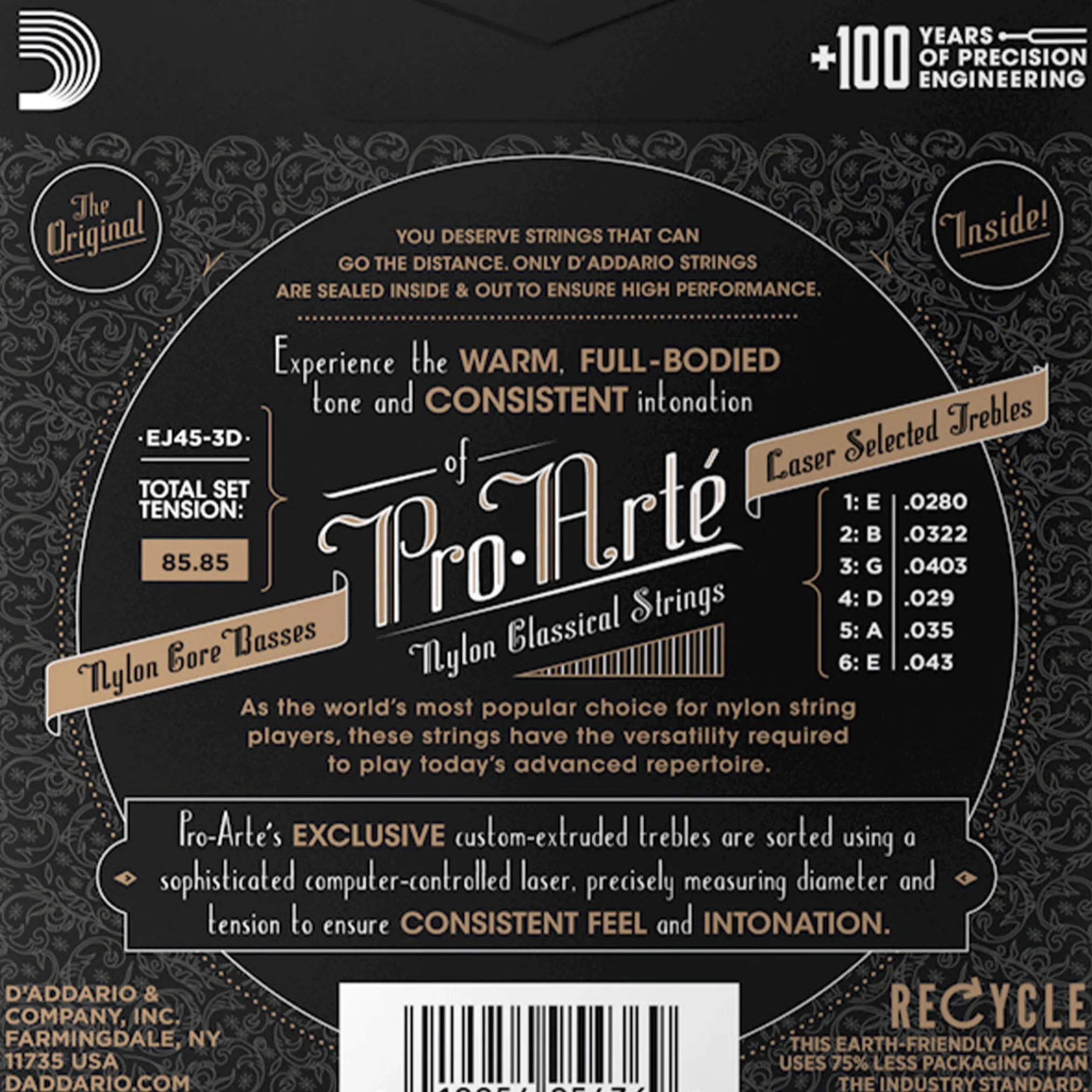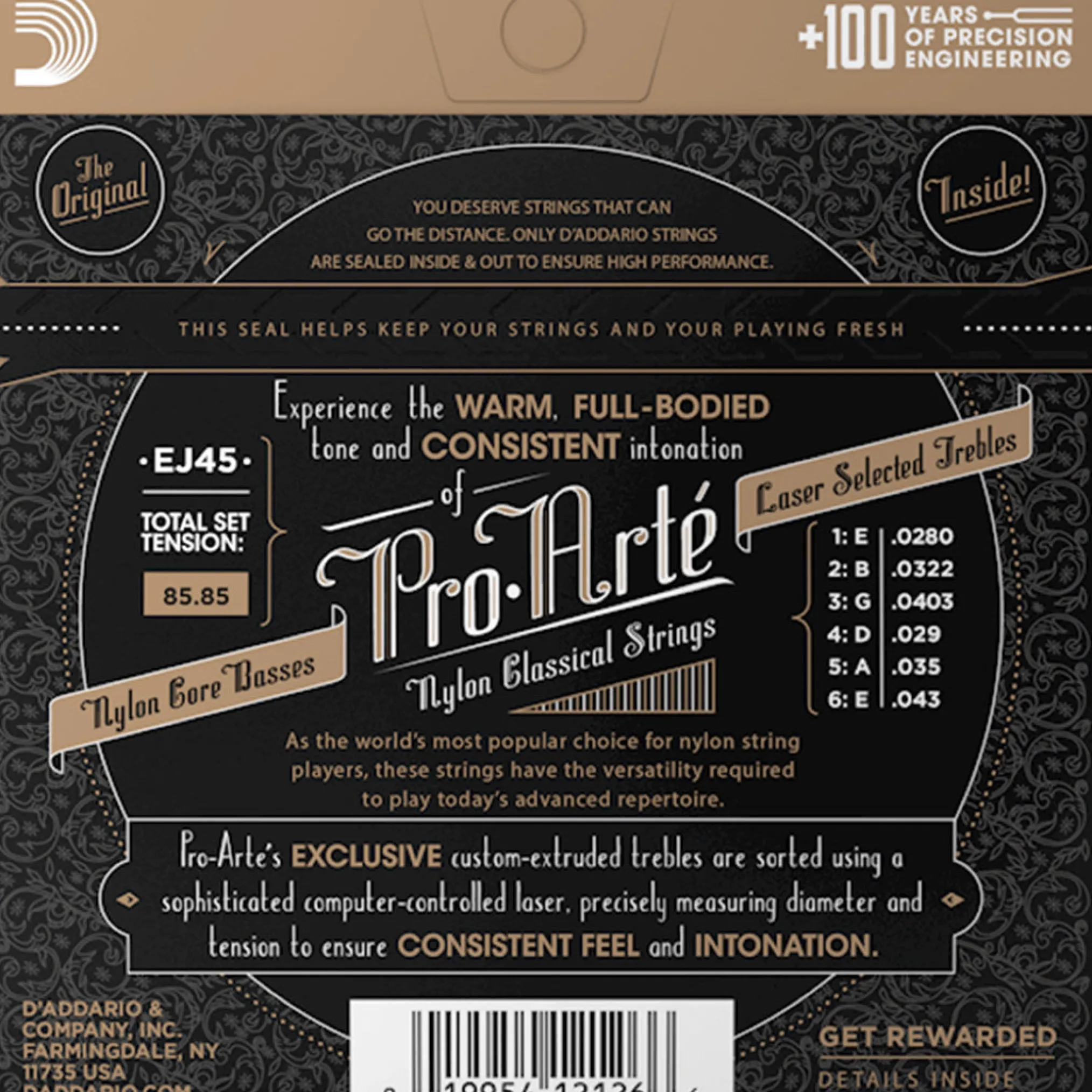 EJ45, normal tension, is D’Addario’s best-selling classical set, preferred for its balance of rich tone, comfortable feel, and dynamic projection. All Pro-Arté treble strings are computer-controlled by an X-Y laser micrometer which performs diameter and tension measurements, ensuring true-sounding, precise trebles in every set. Pro-Arté basses are wound using silver-plated copper on a multi-filament nylon core for a consistent and warm, yet projecting tone.