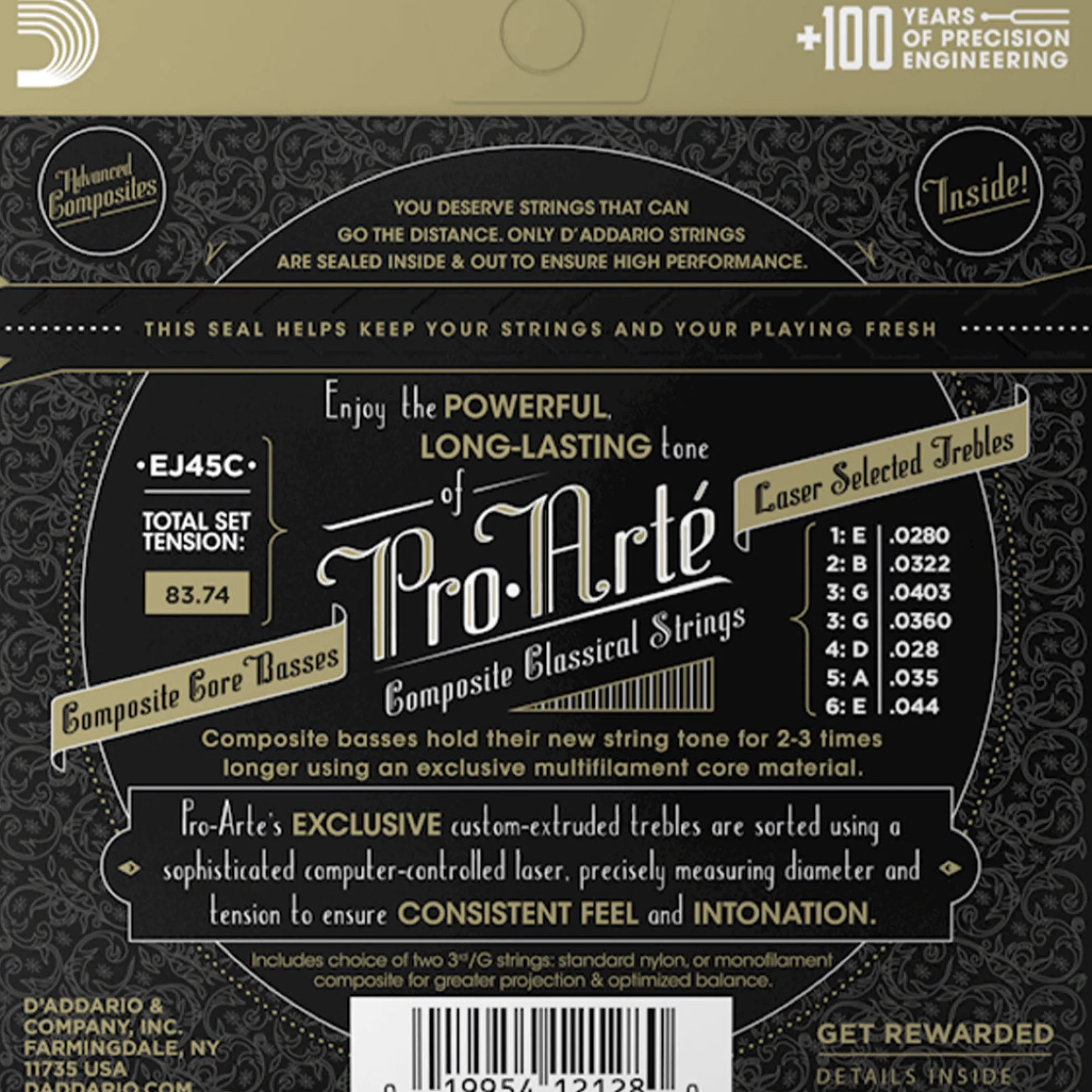 EJ45C is D’Addario’s best-selling composite set, preferred for its balance of bold, yet warm tone, comfortable feel, and dynamic projection. This string set is silver-plated copper wound on an exclusive composite core material for a powerful, long-lasting tone. Includes alternate composite 3rd string for increased projection.
