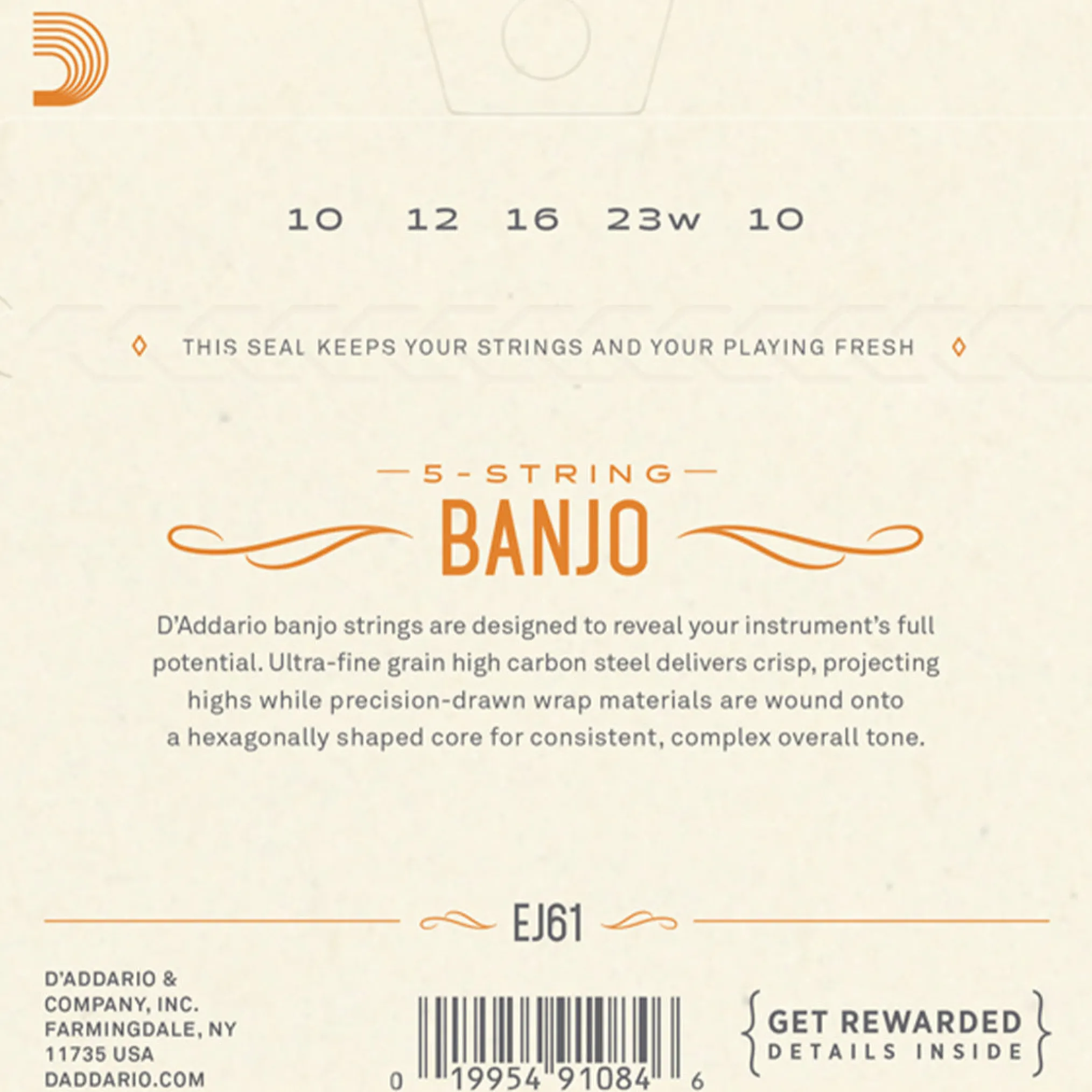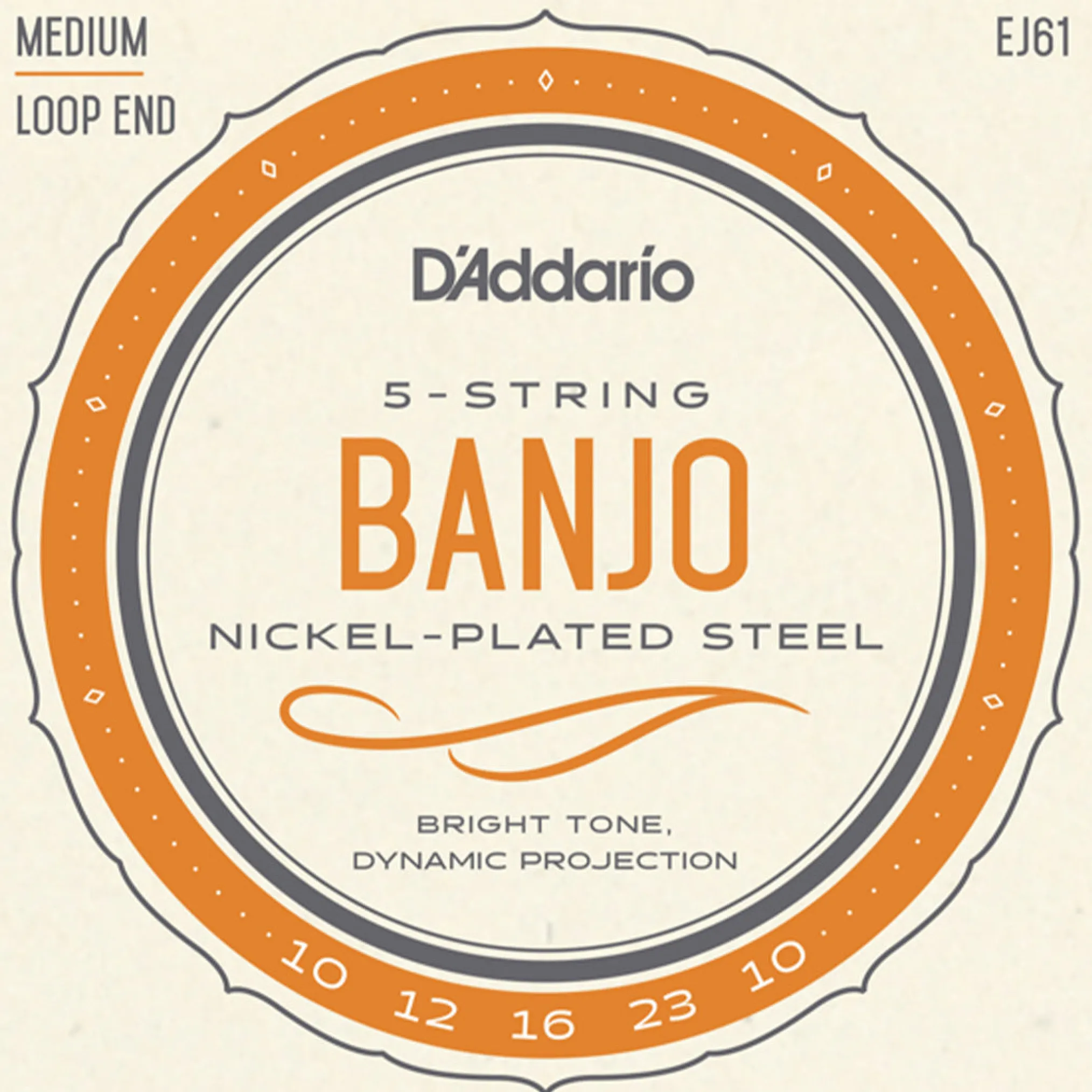 EJ61 is a medium gauge string set for a 5-string banjo, utilizing high carbon, tin-plated steel wire with a nickel-plated steel wound string.