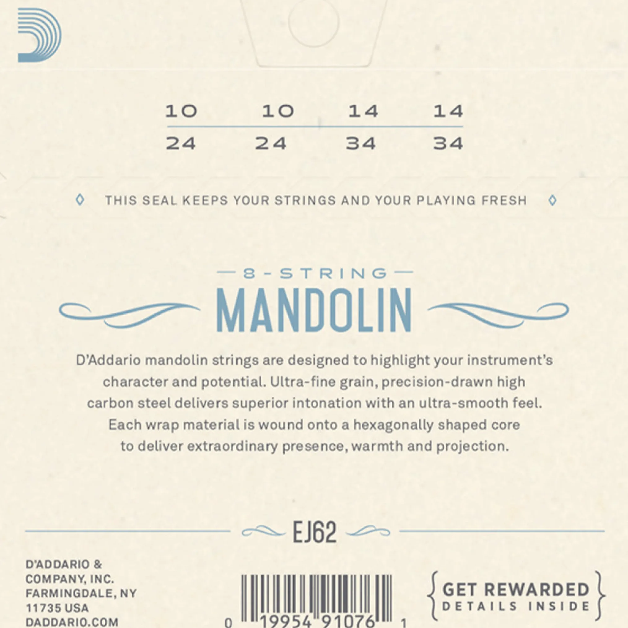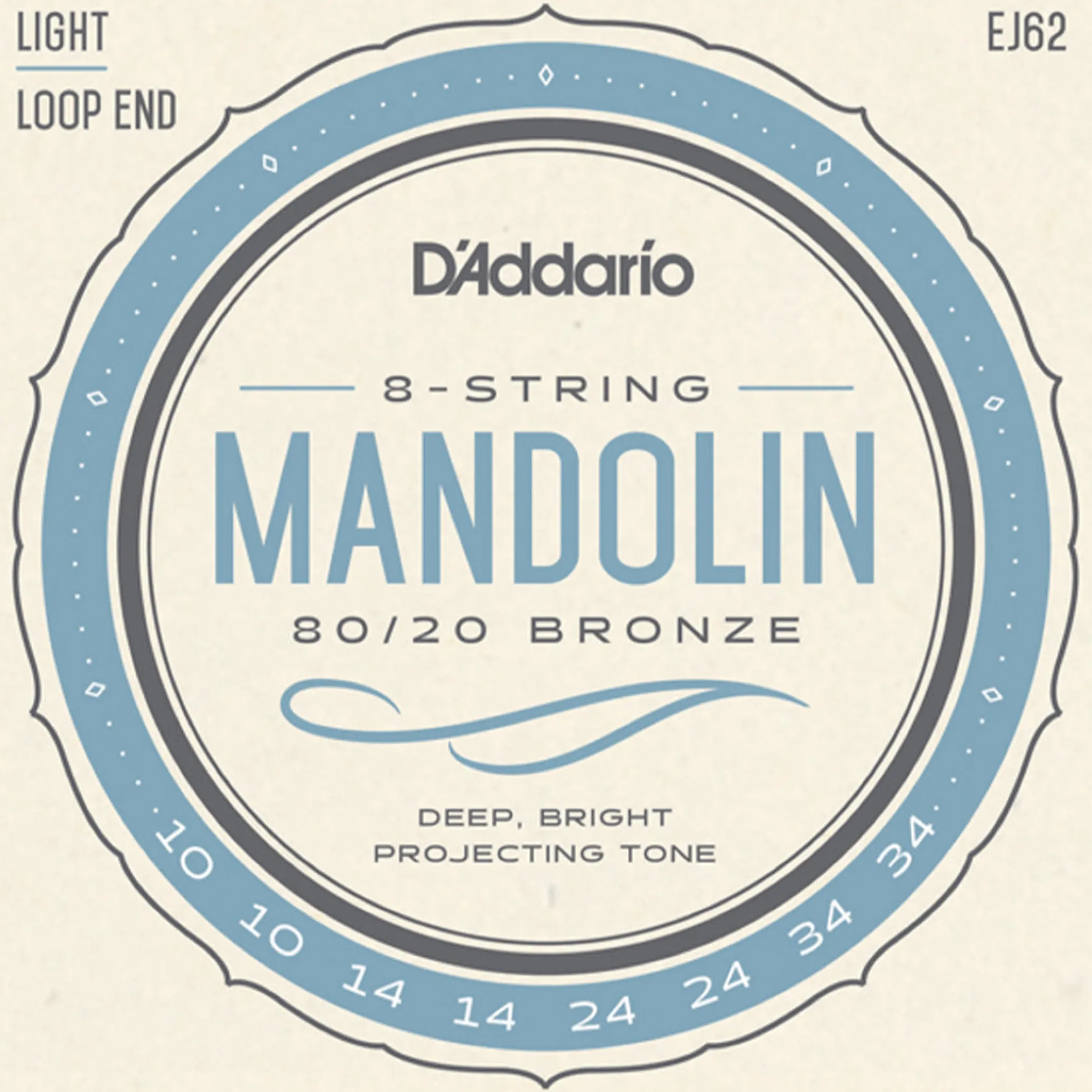 EJ62 is a set of light gauge 80/20 bronze strings for mandolin. 80/20 Bronze, the original acoustic alloy introduced by John D’Addario Sr. and John D’Angelico in the 1930s is a popular alloy for recording due to their crisp, deep and projecting tone and appeal to many traditionalists and vintage enthusiasts for their historical significance.