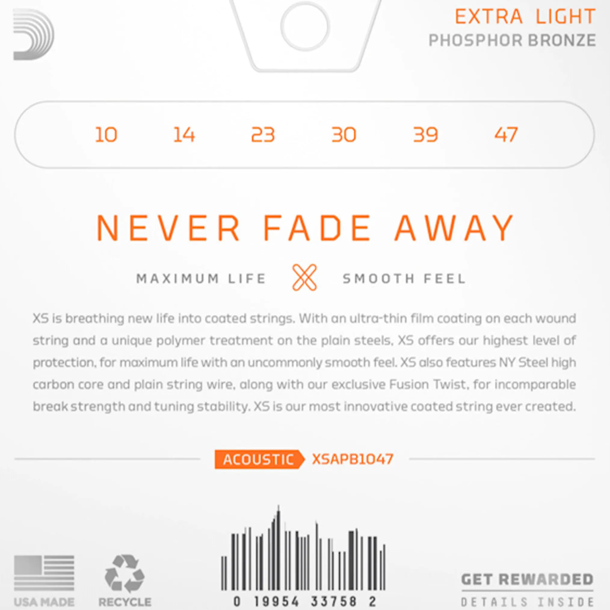 Born from our greatest breakthrough in string innovation, XS Phosphor Bronze strings have the longest life of any D’Addario acoustic guitar string.