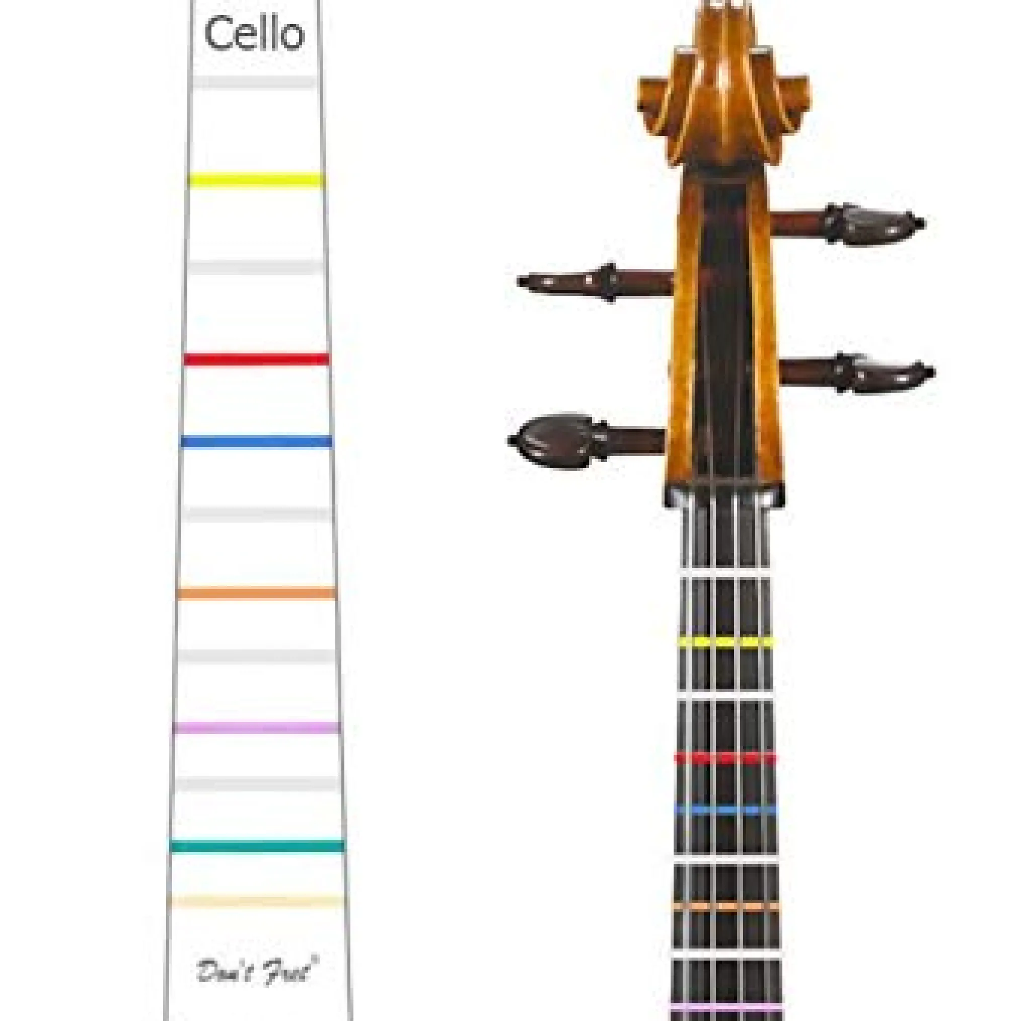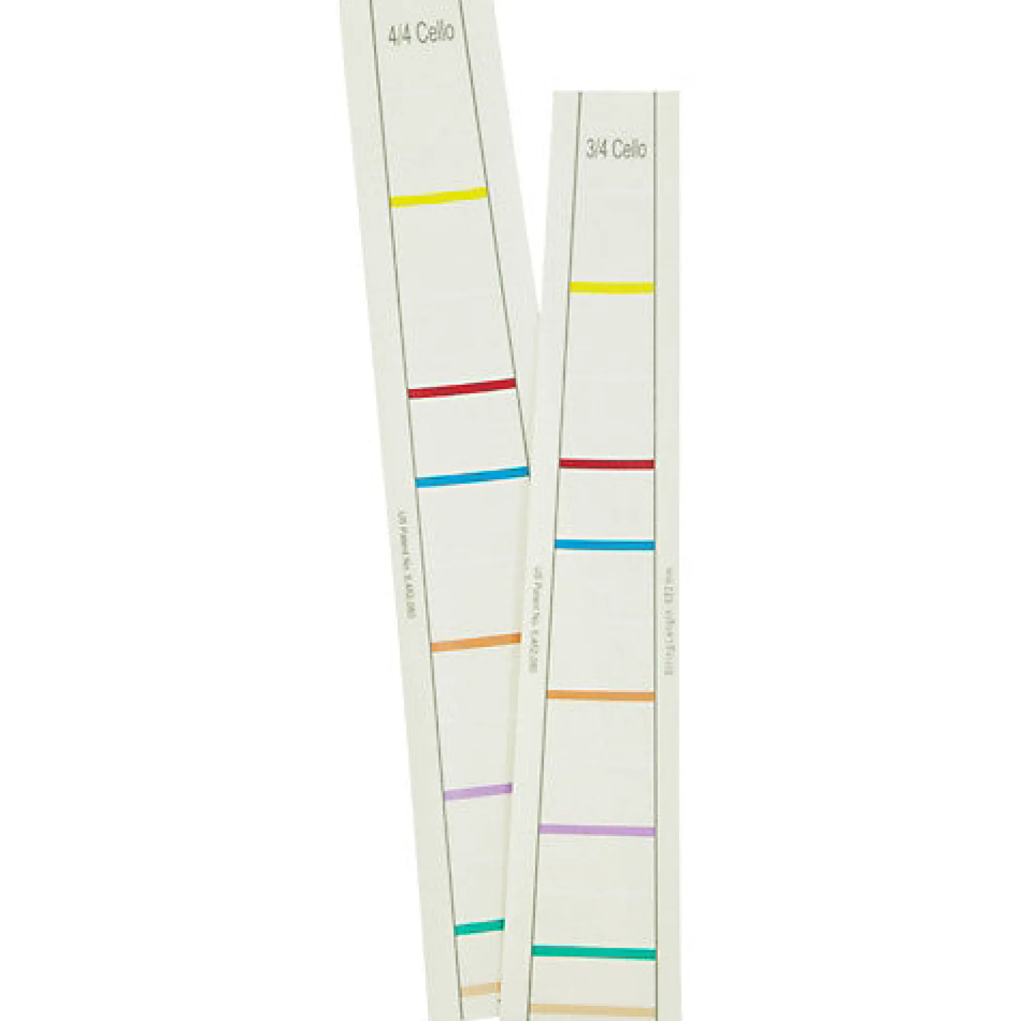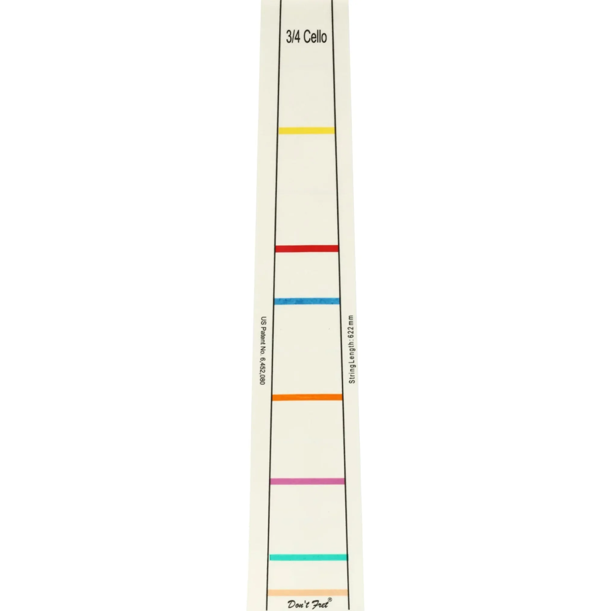 The Don’t Fret® decal has 12 lines indicating a complete chromatic scale of one octave. The lines—5 white, and 7 in other colors —are arranged in the same pattern as that of the piano keyboard, with its 5 black and 7 white keys. With the full set of lines it is easier to teach finger patterns, keys (tonalities), and intervals such as whole- and half-steps.