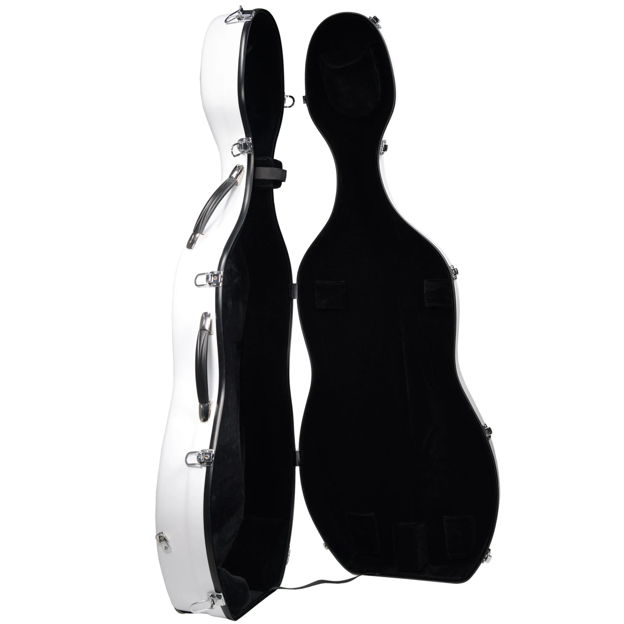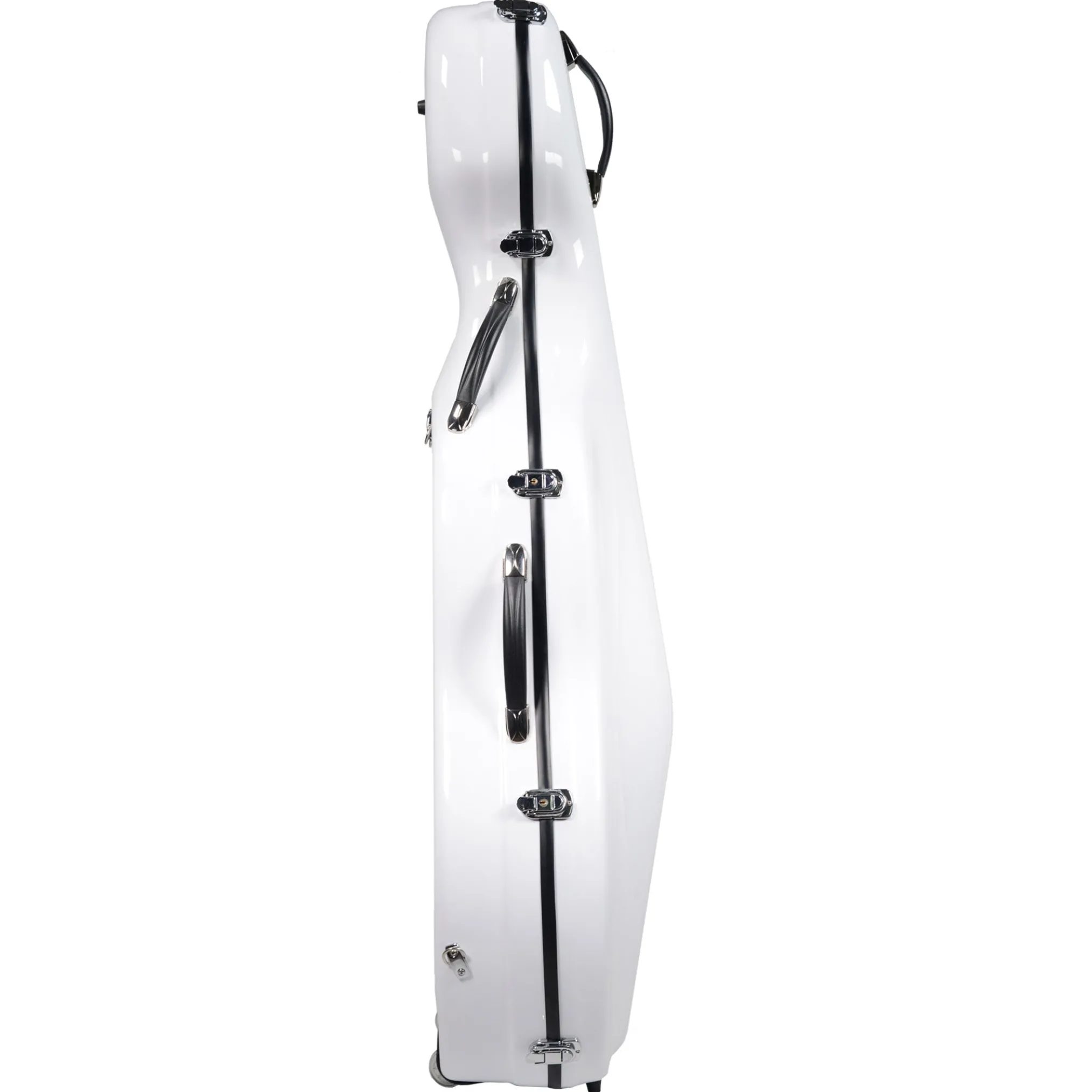 The Fiddlerman Cello Case FC1200 is a strong and durable fiberglass shell cello case with wheels. It’s available in a glossy white and glossy black finishes, with chrome fittings and black interior. This case is featuring two carrying handles, a subway handle, backpack straps, and wheels for easy transportation. Interior features suspension system, two bowholders, and accessory pocket.