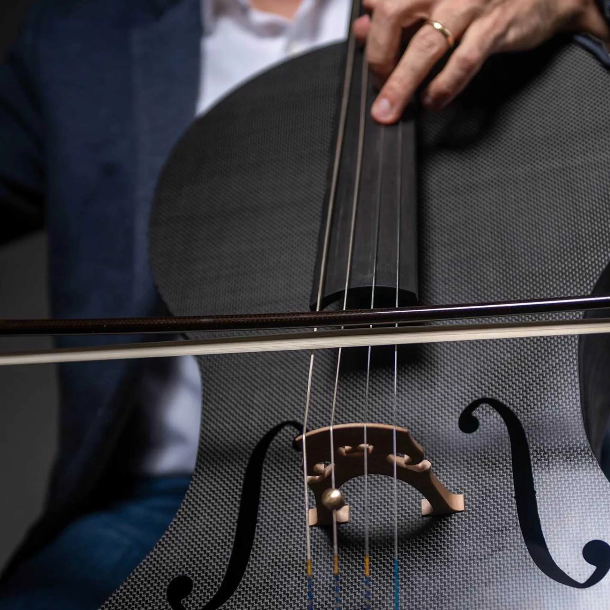 The international patent-pending design uses novel physics to allow the tops of the cellos to act more like the cone of a speaker. Instead of using a rigid arched shape akin to traditional cellos, the tops use tensile strength to support the bridge, more like the surface of a trampoline. The unique hybrid design incorporates two flat CNC-cut pieces of carbon fiber serving as the top and back of the instrument. This entirely new design allows the vibrations and sound to travel more freely through the instrument to emit a robust, yet polished sound.