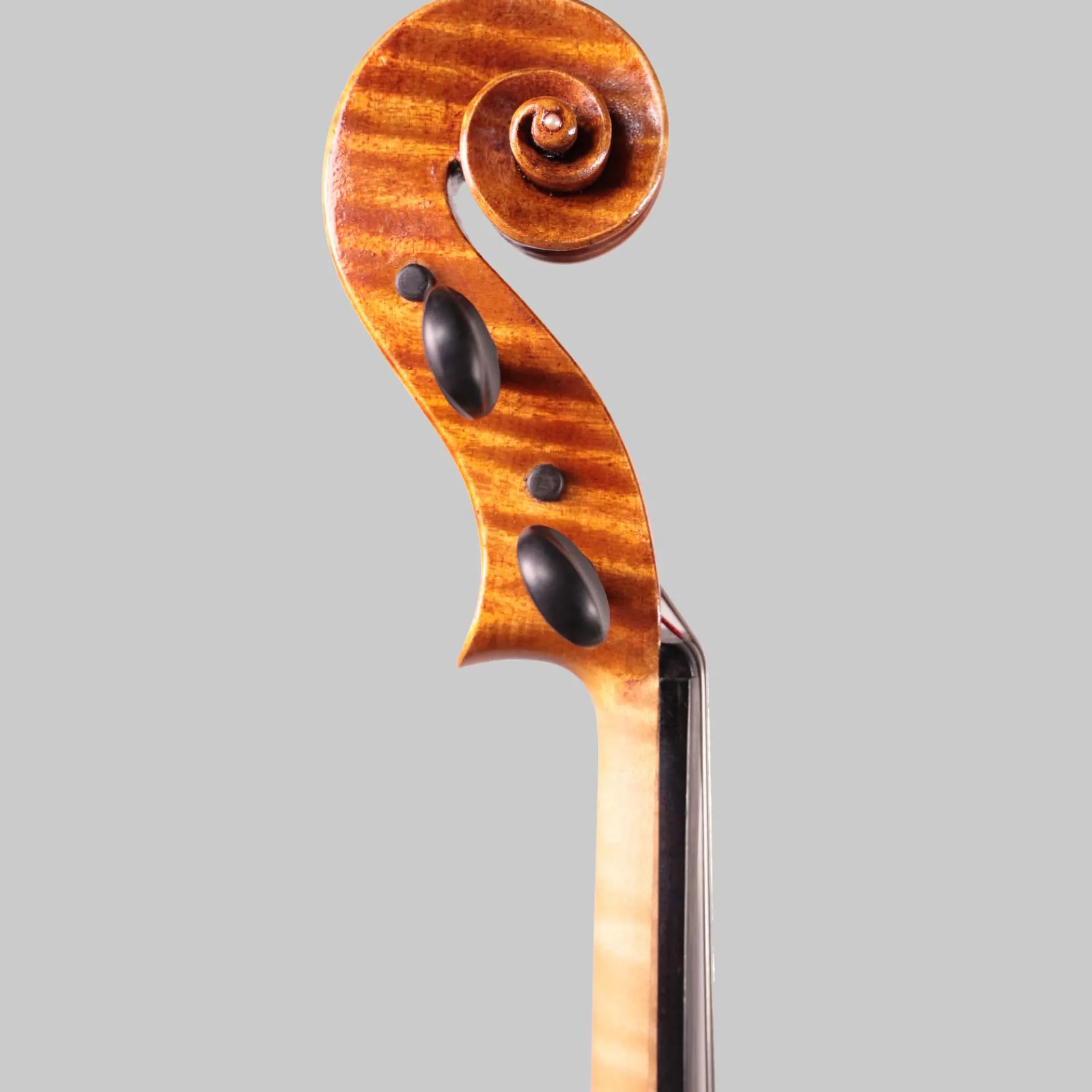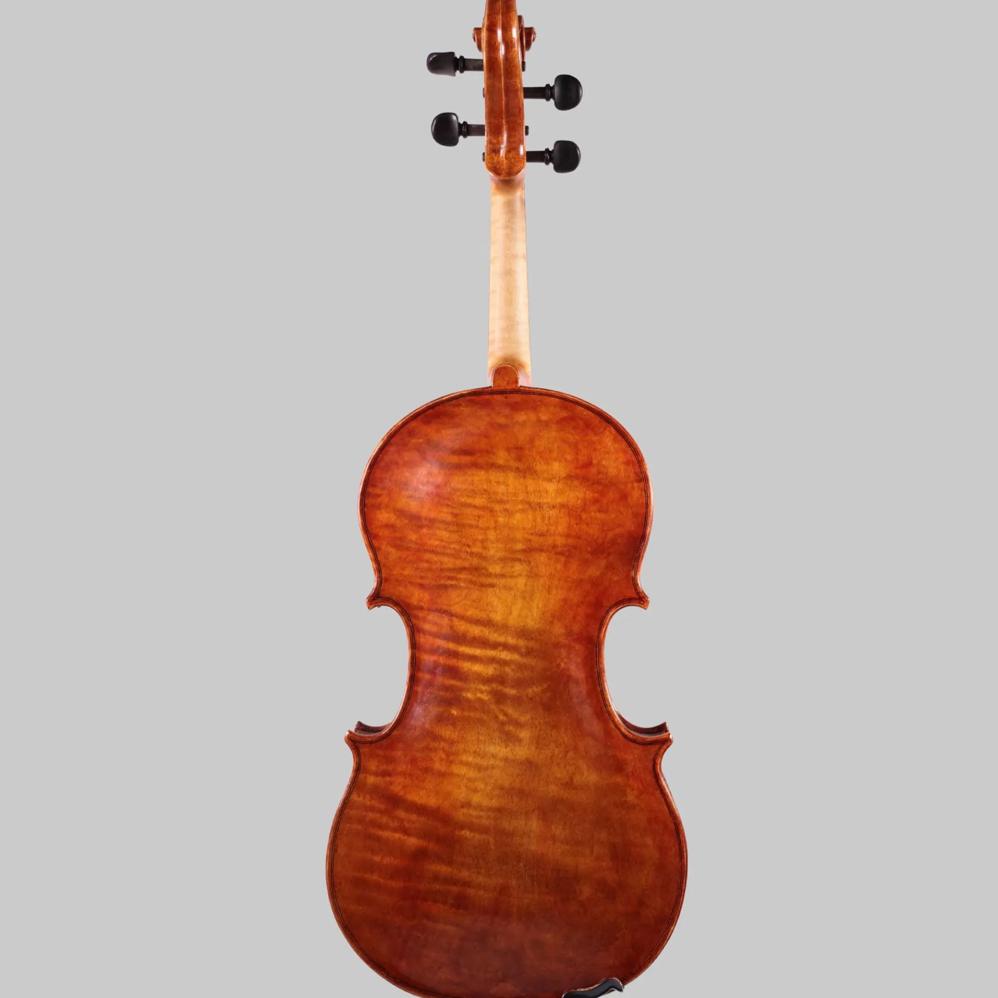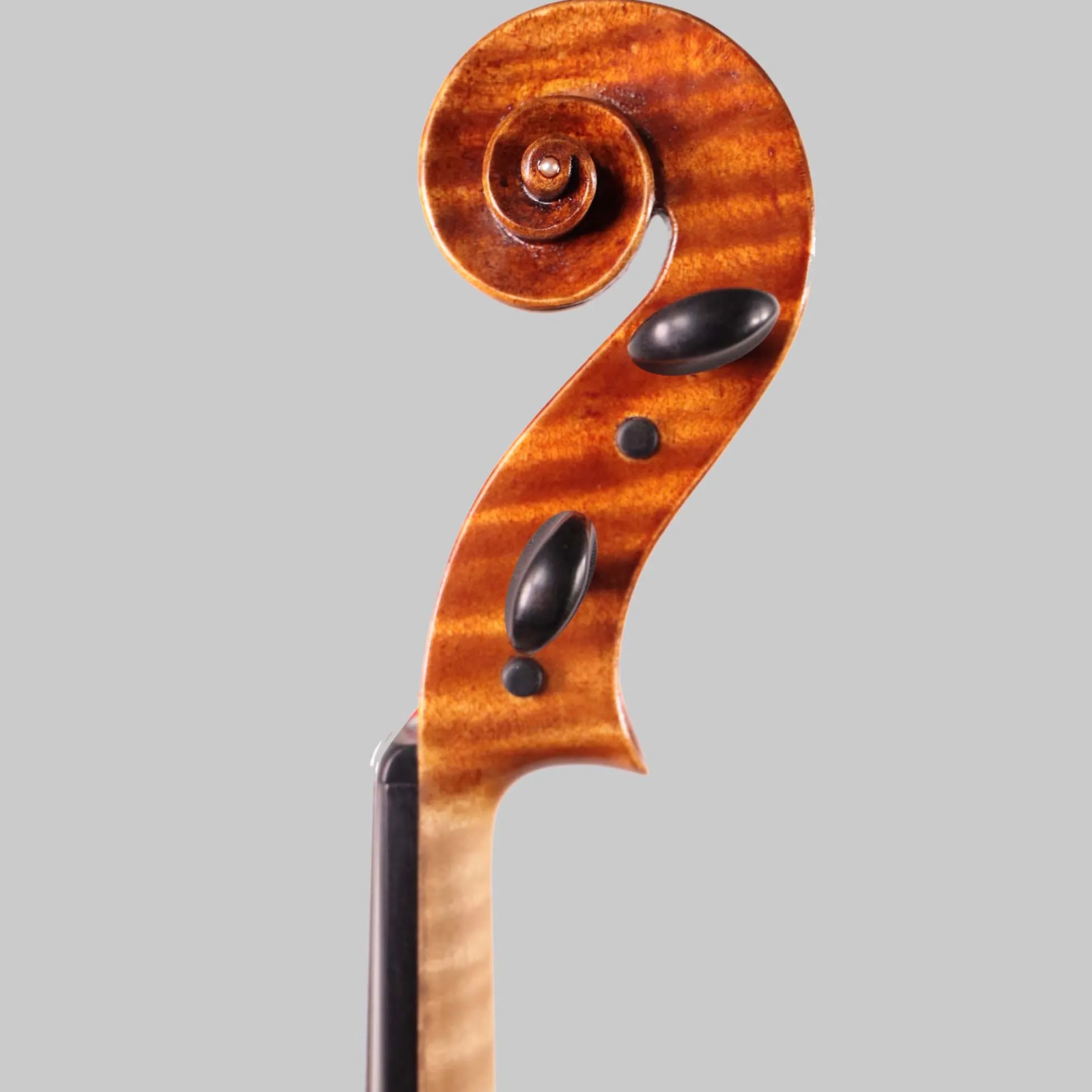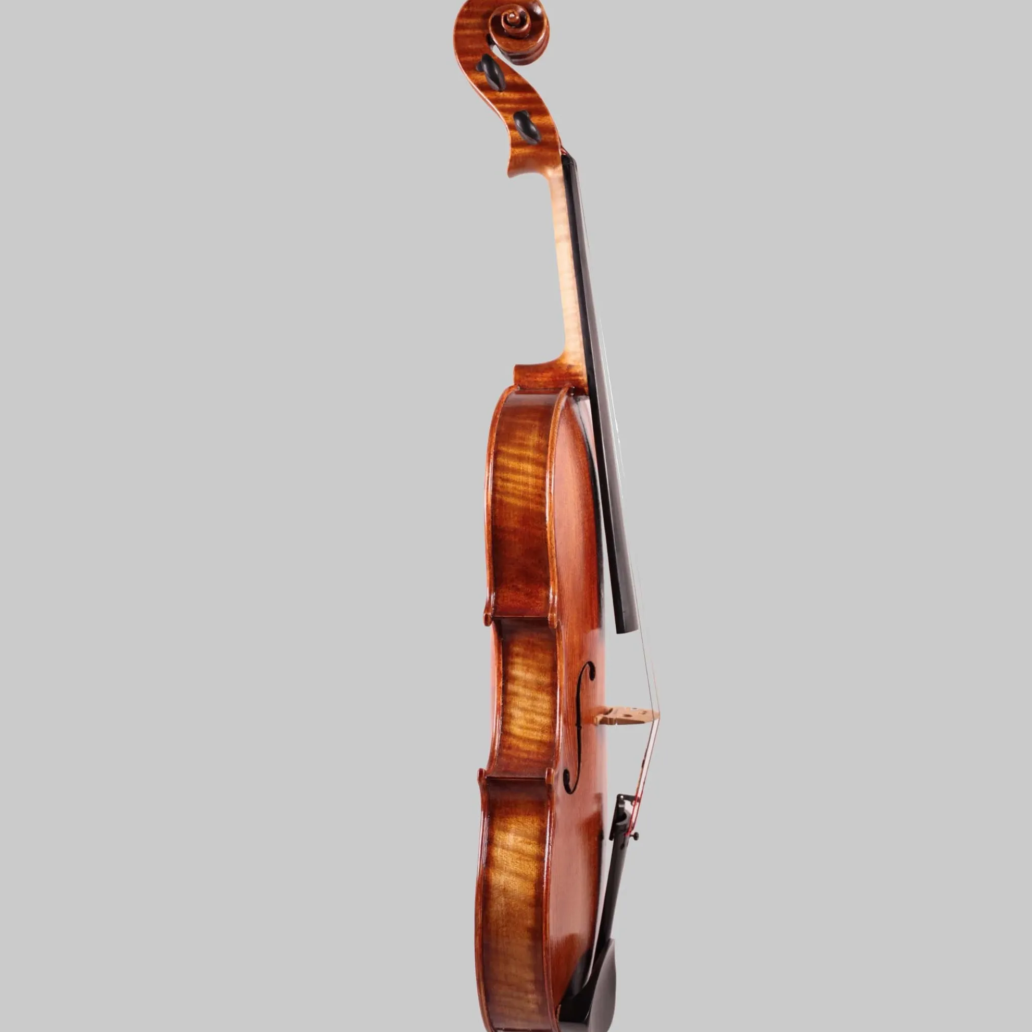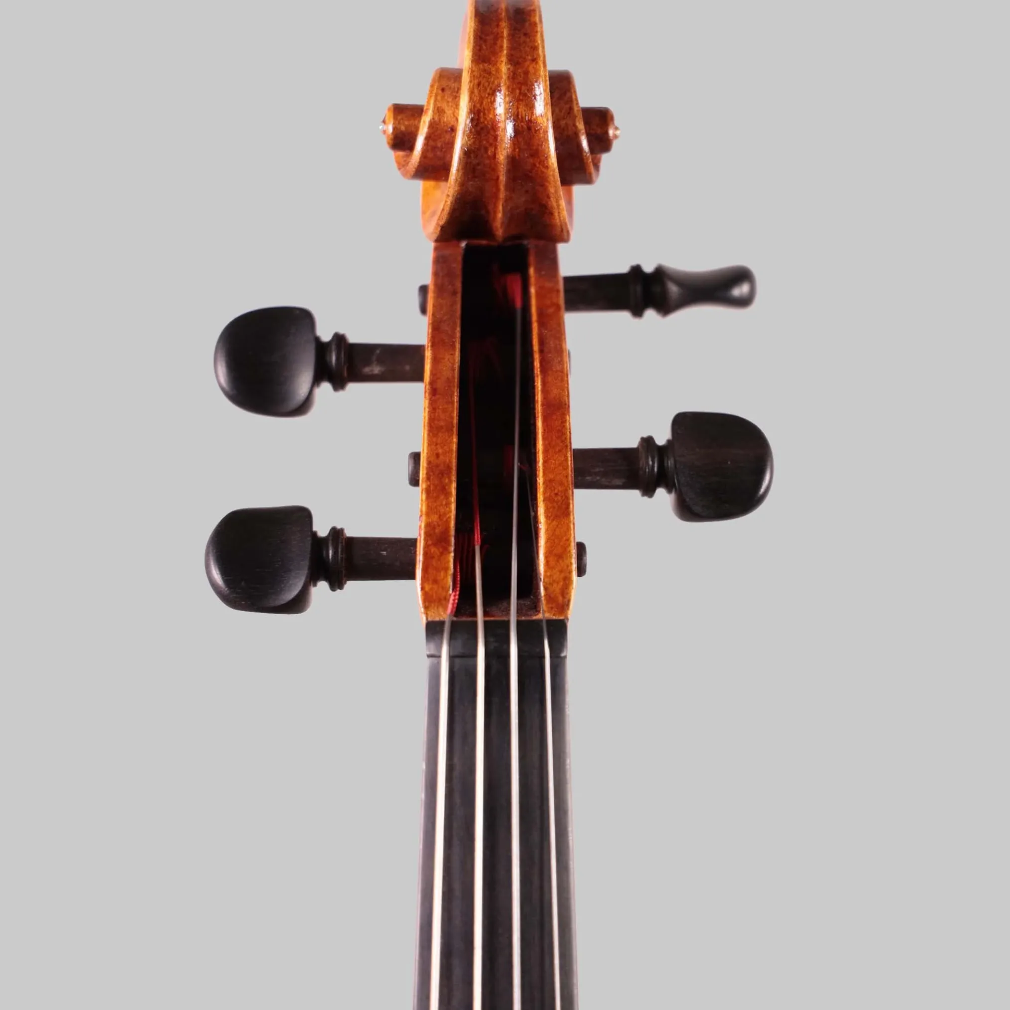 This viola is simply stunning both visually, and in tone. Ithas awarm and sweet tone, strong projection, with a clean and excellent response. The viola has a medium brown varnish, over golden hues, gorgeousone-piece maple back, and wide grain spruce top.