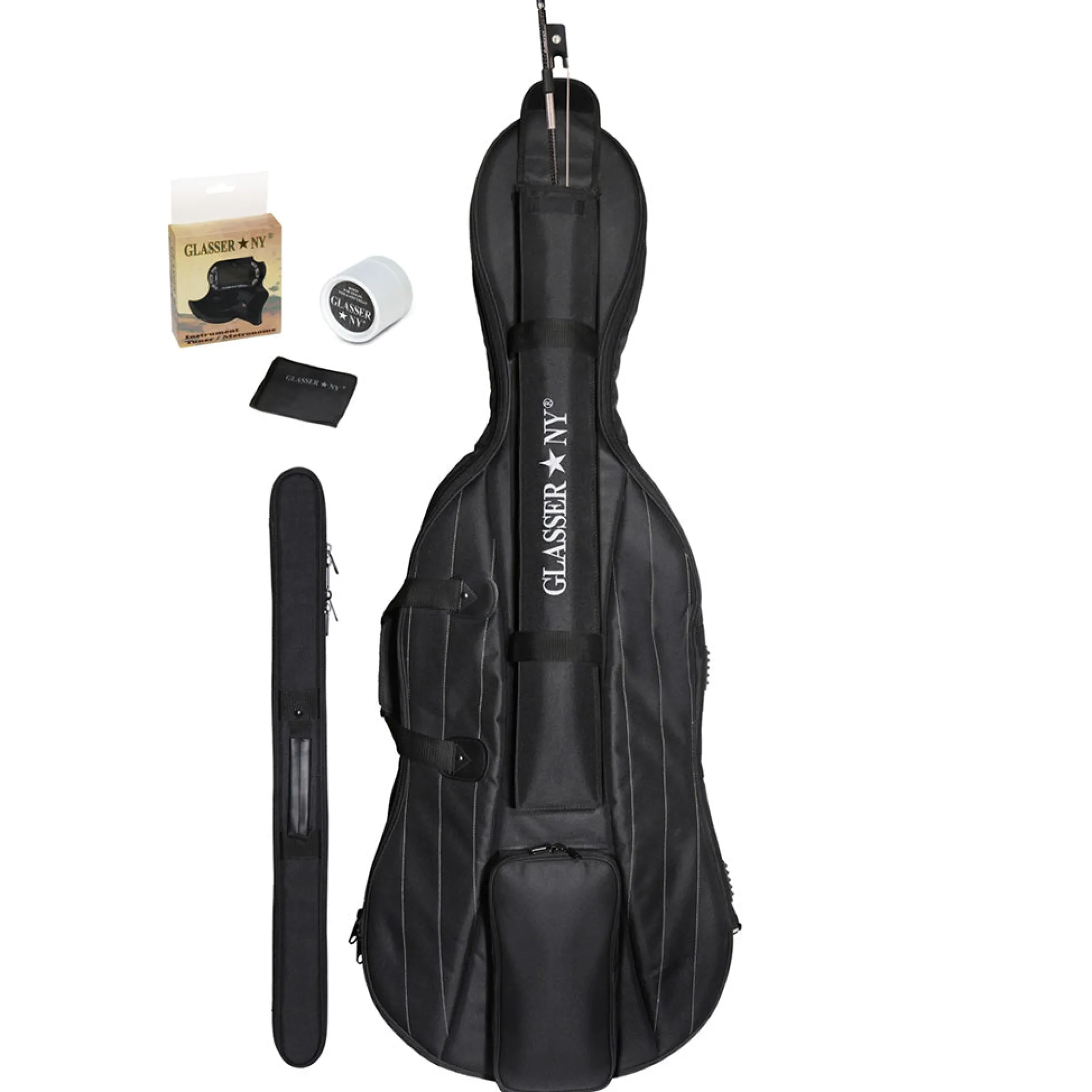 The standard Glasser Carbon Composite cello arrives fully set-up with Larsen strings, Planetary Tuning Pegs, and a carbon composite Glasser tailpiece with 4 fine tuners for the ultimate tunability.