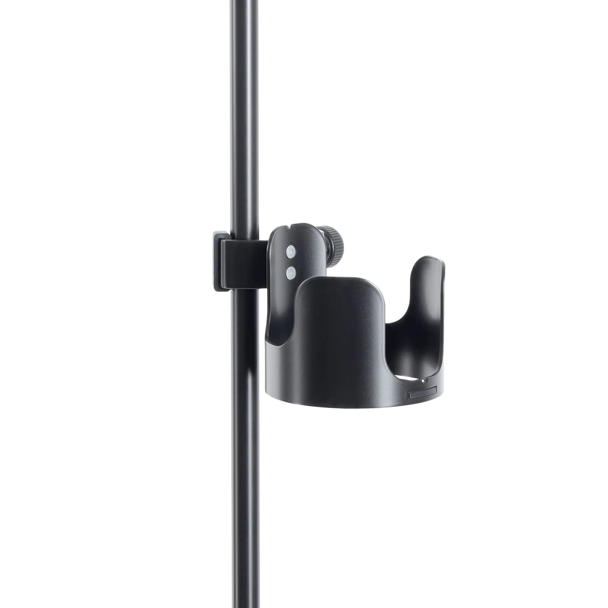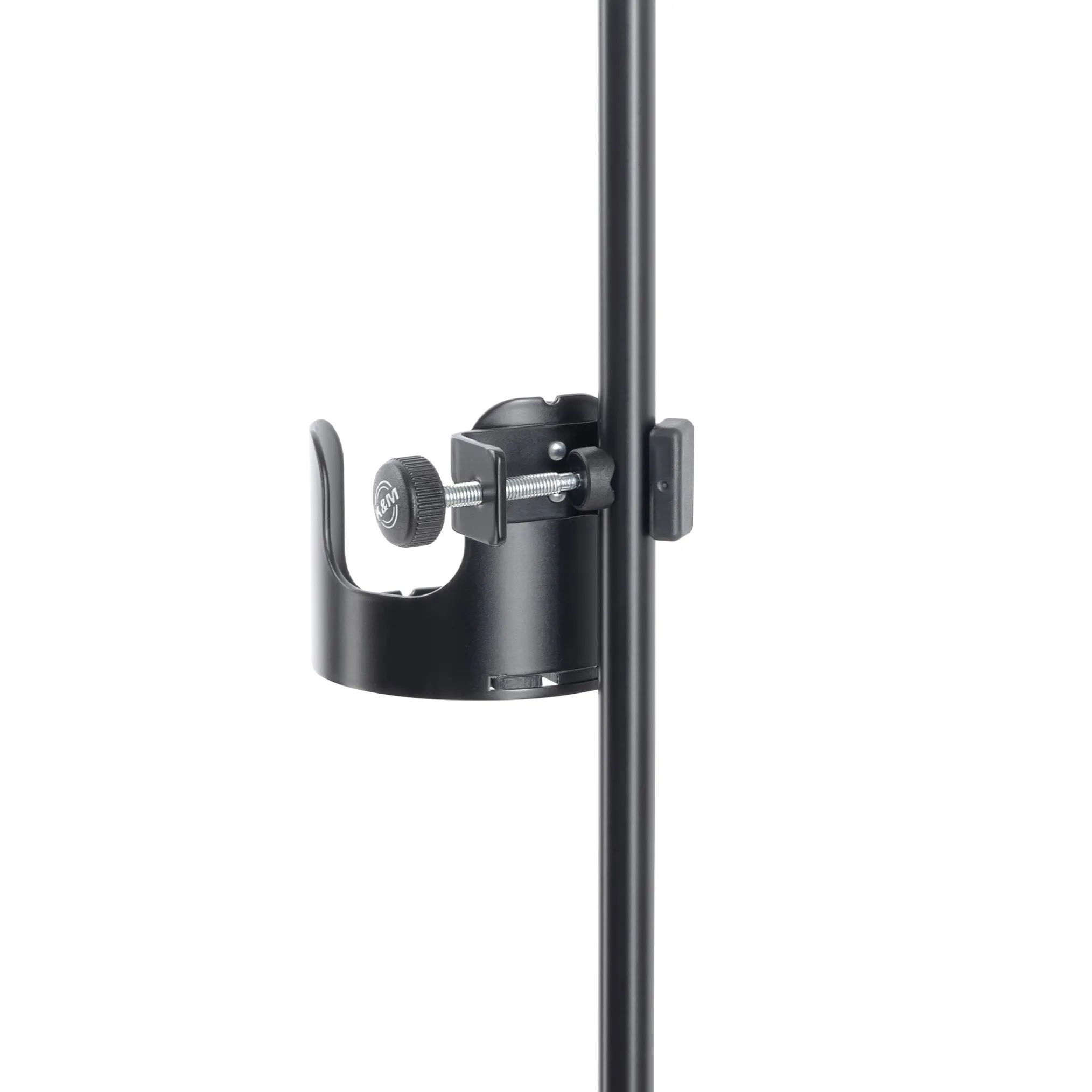 The K&M Drink Holder attaches to the tube of most music, microphone, or instrument stands. Suitable for bottles, glasses and cups. The clamping element protects the finish of the tube.