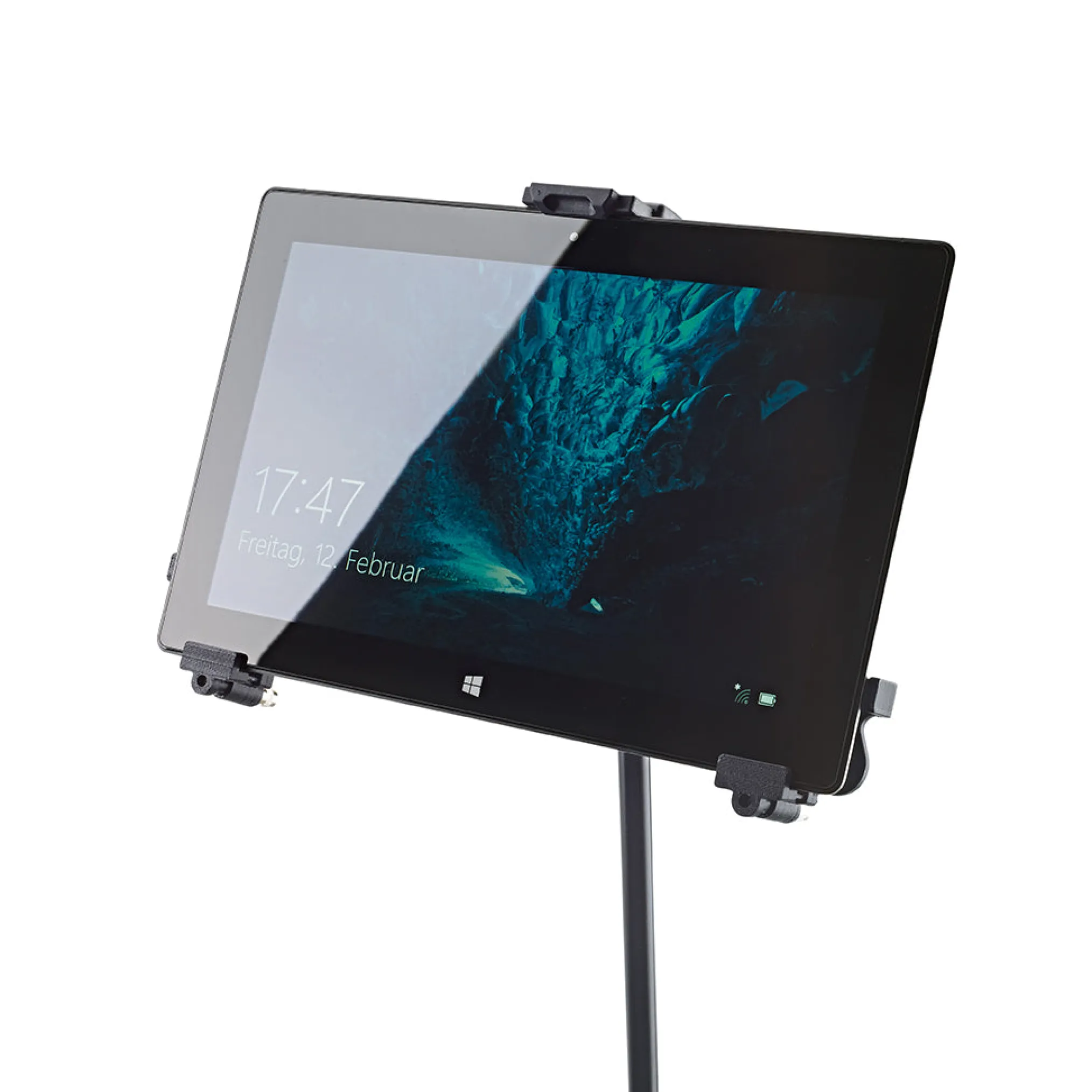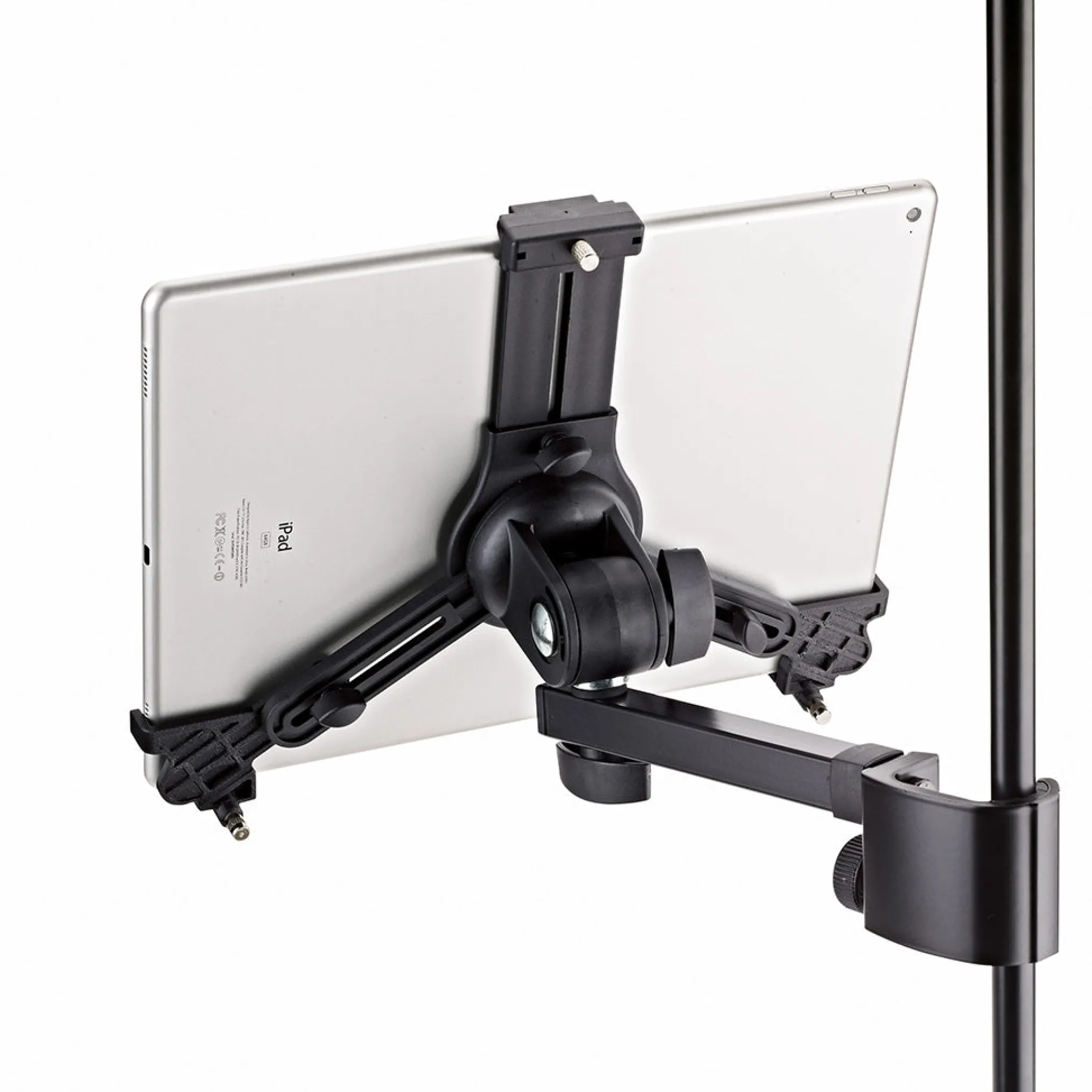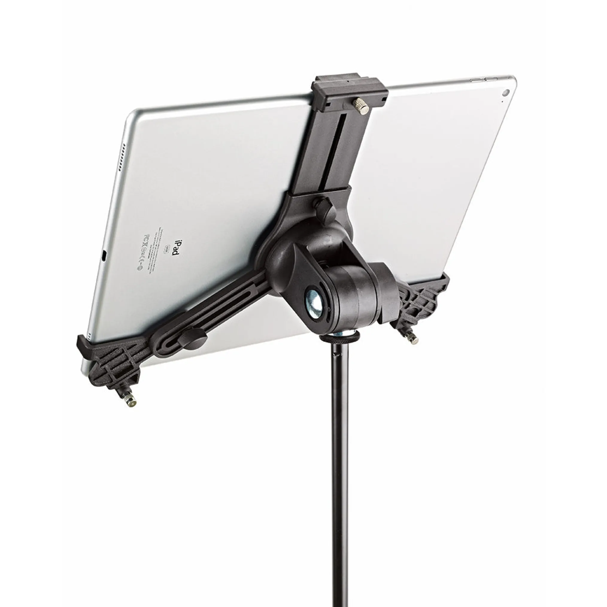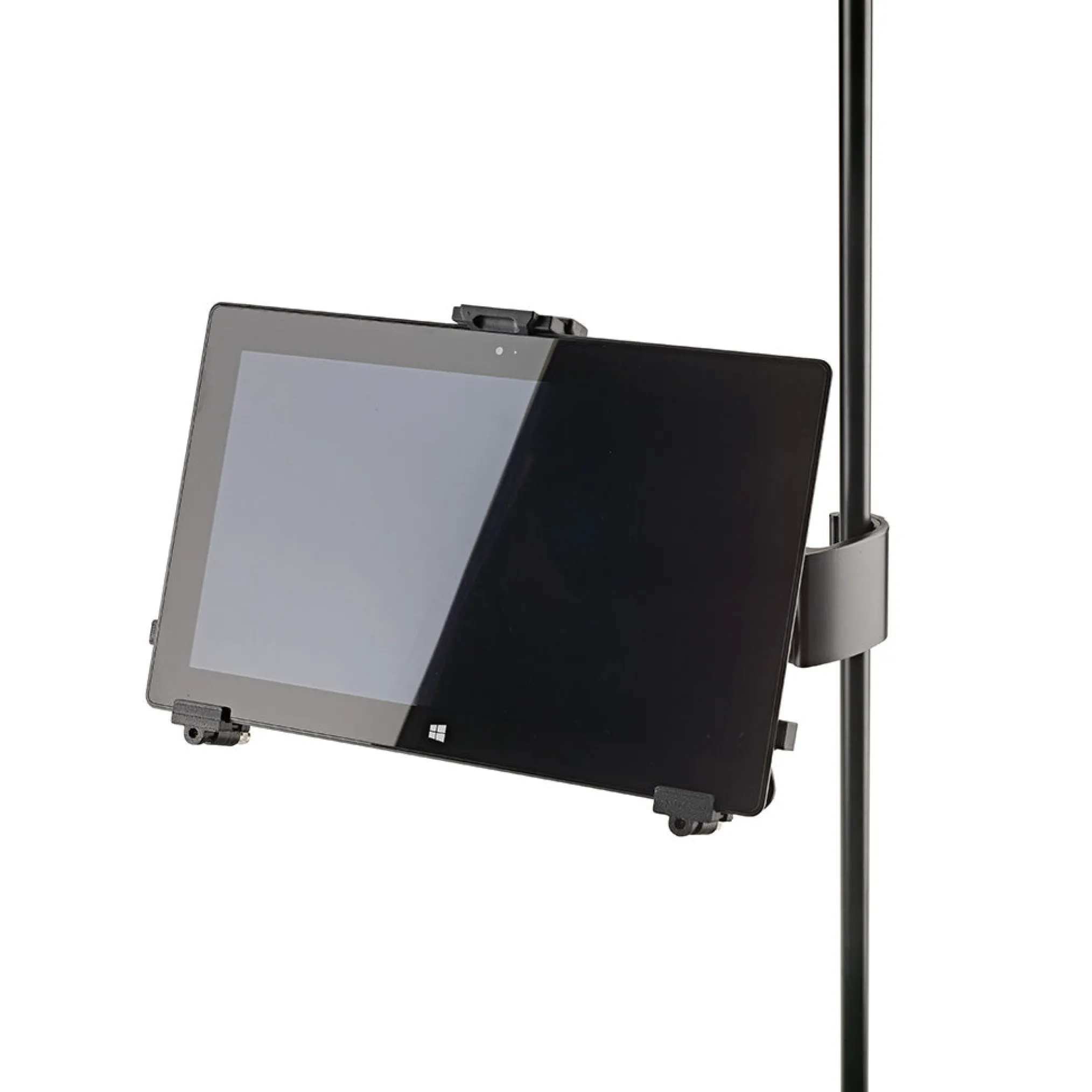 The Universal Tablet Holder can be adjusted variably to accommodate different tablet sizes without needing tools and holds the devices securely and effectively for many different situations. The holder supports both horizontal and vertical mounting of the tablet.