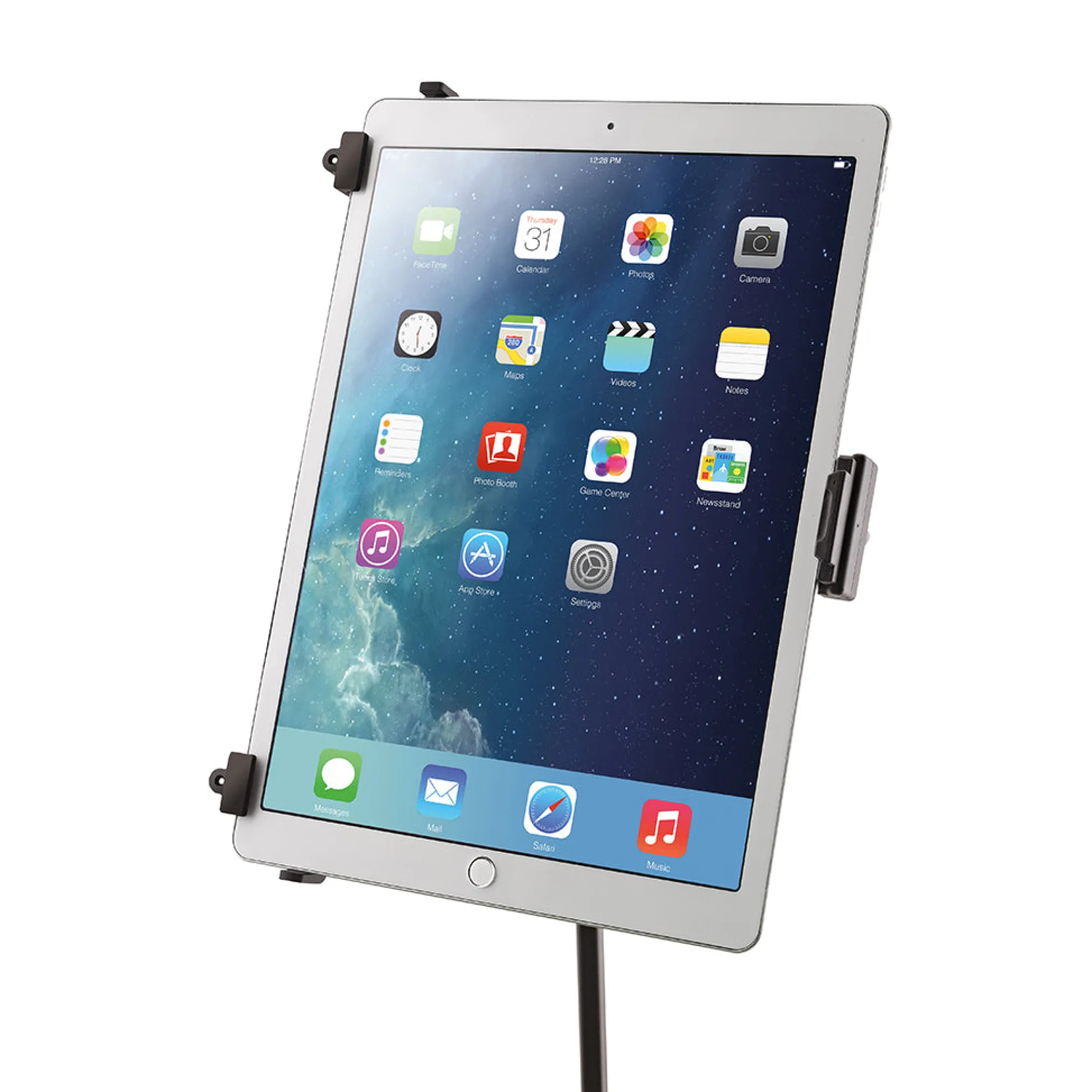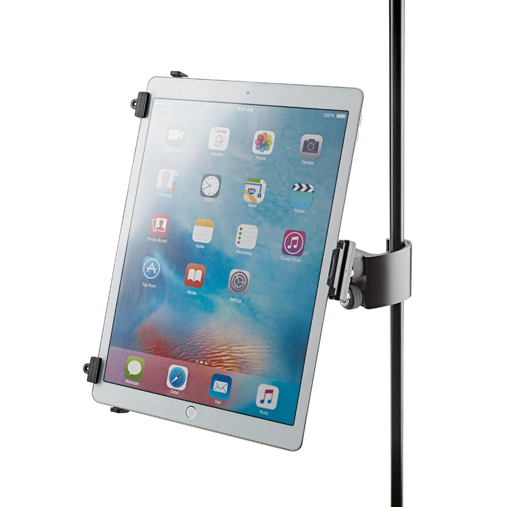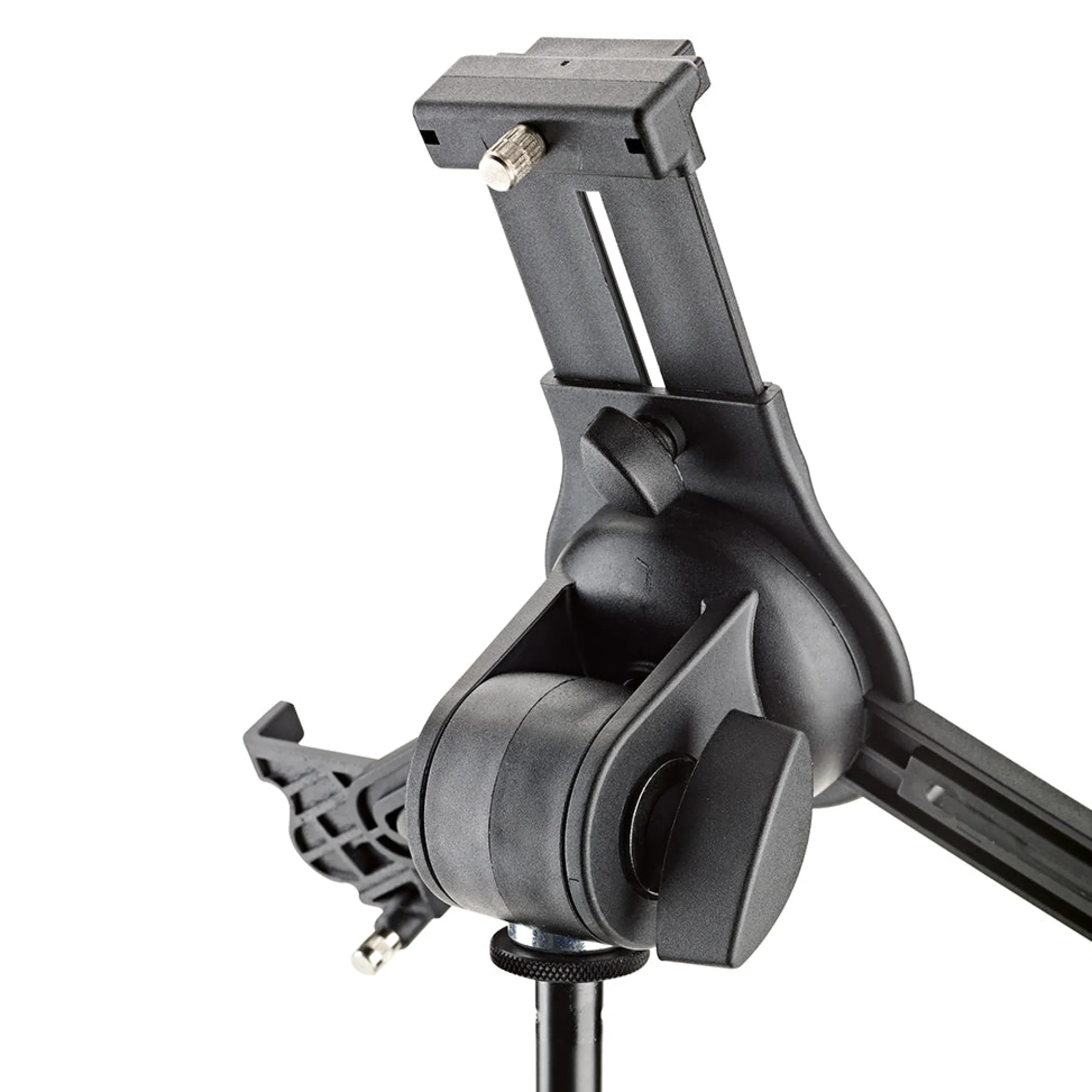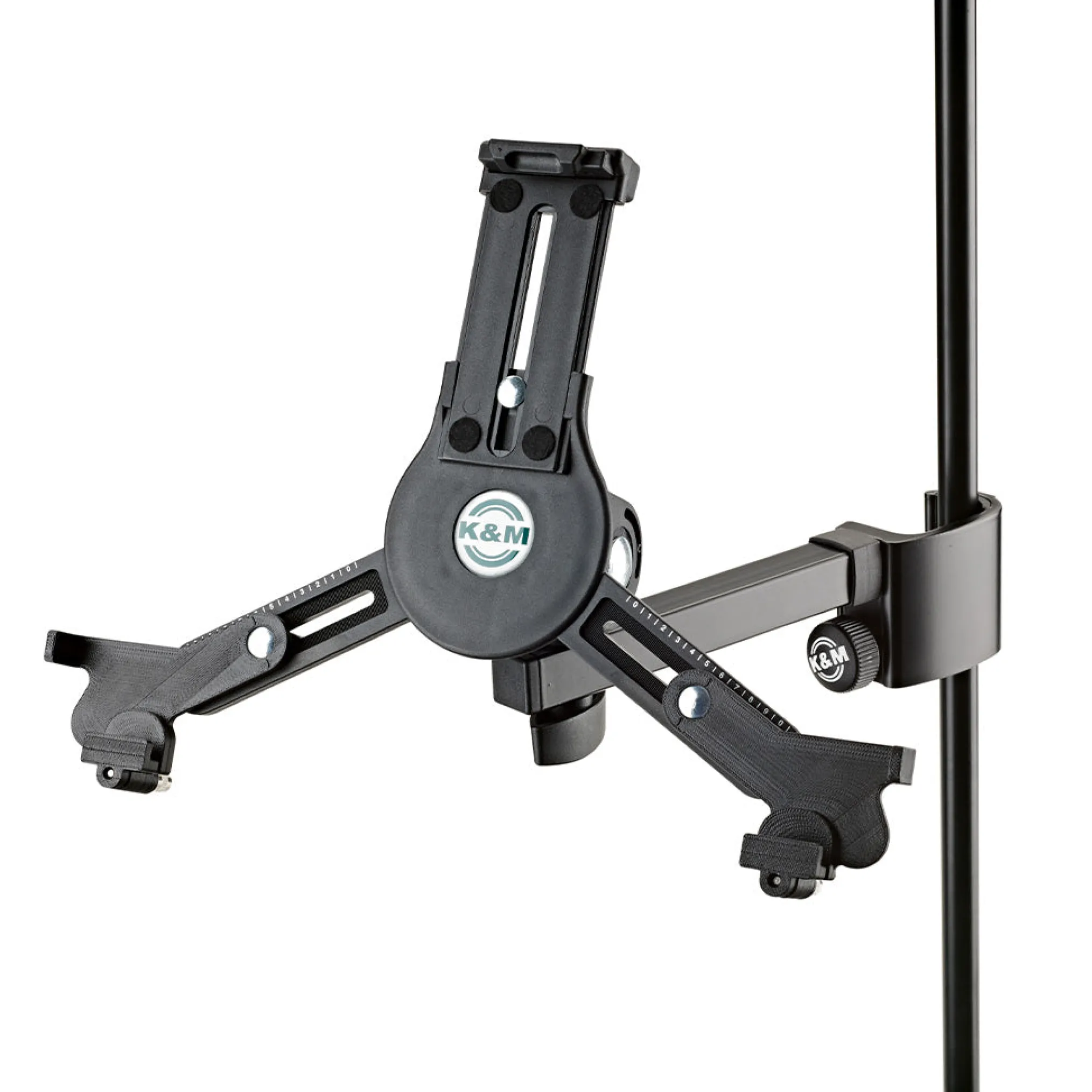 The Universal Tablet Holder can be adjusted variably to accommodate different tablet sizes without needing tools and holds the devices securely and effectively for many different situations. The holder supports both horizontal and vertical mounting of the tablet.