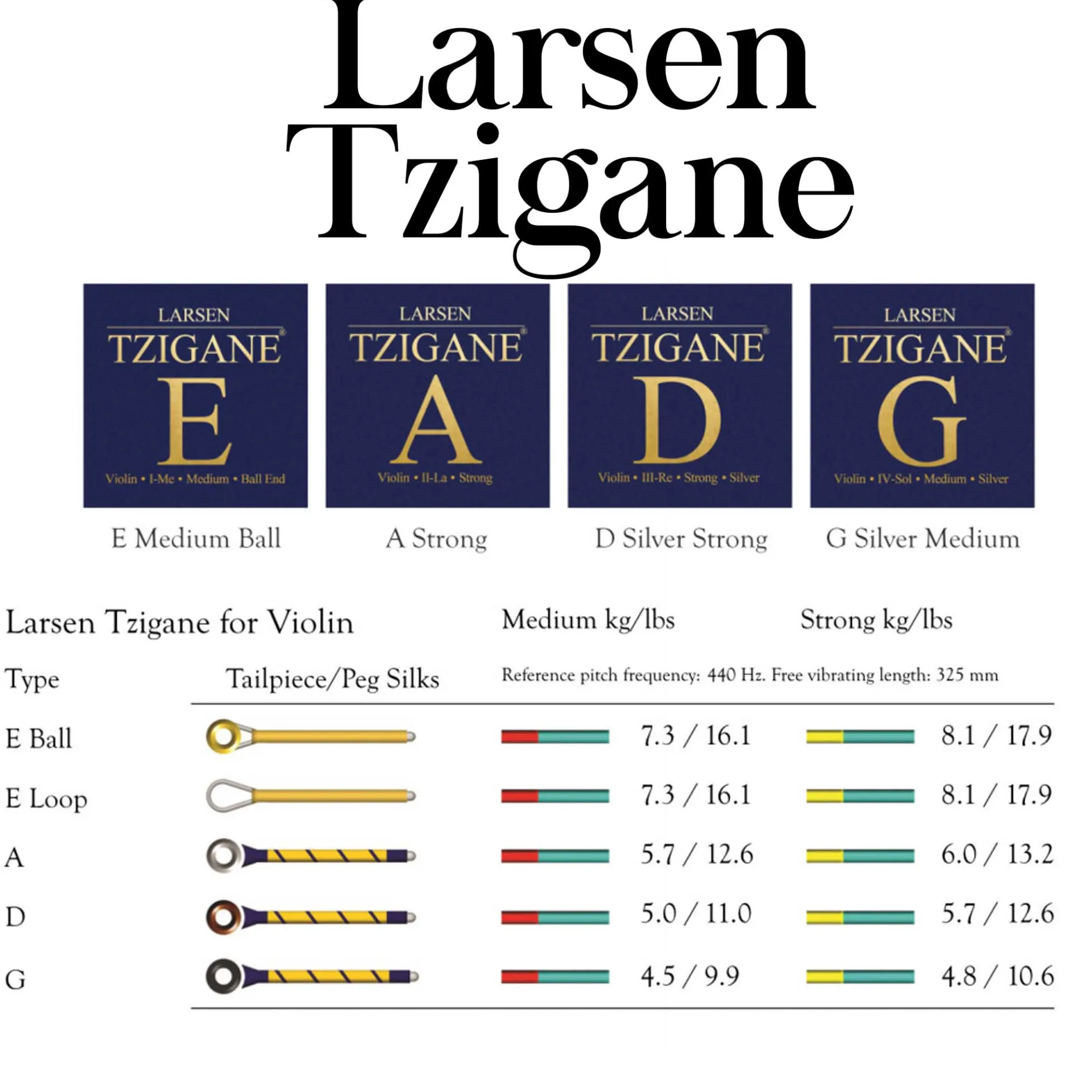 Larsen Tzigane violin strings, without exaggerated tension, are built on a newly developed multi-filament nylon core. Tension creates volume rather than carrying power. The unique combination of overtones makes for a quality sound not unlike that of a great singer – a sound that carries while, at the same time, is pleasant to the ear of the player.