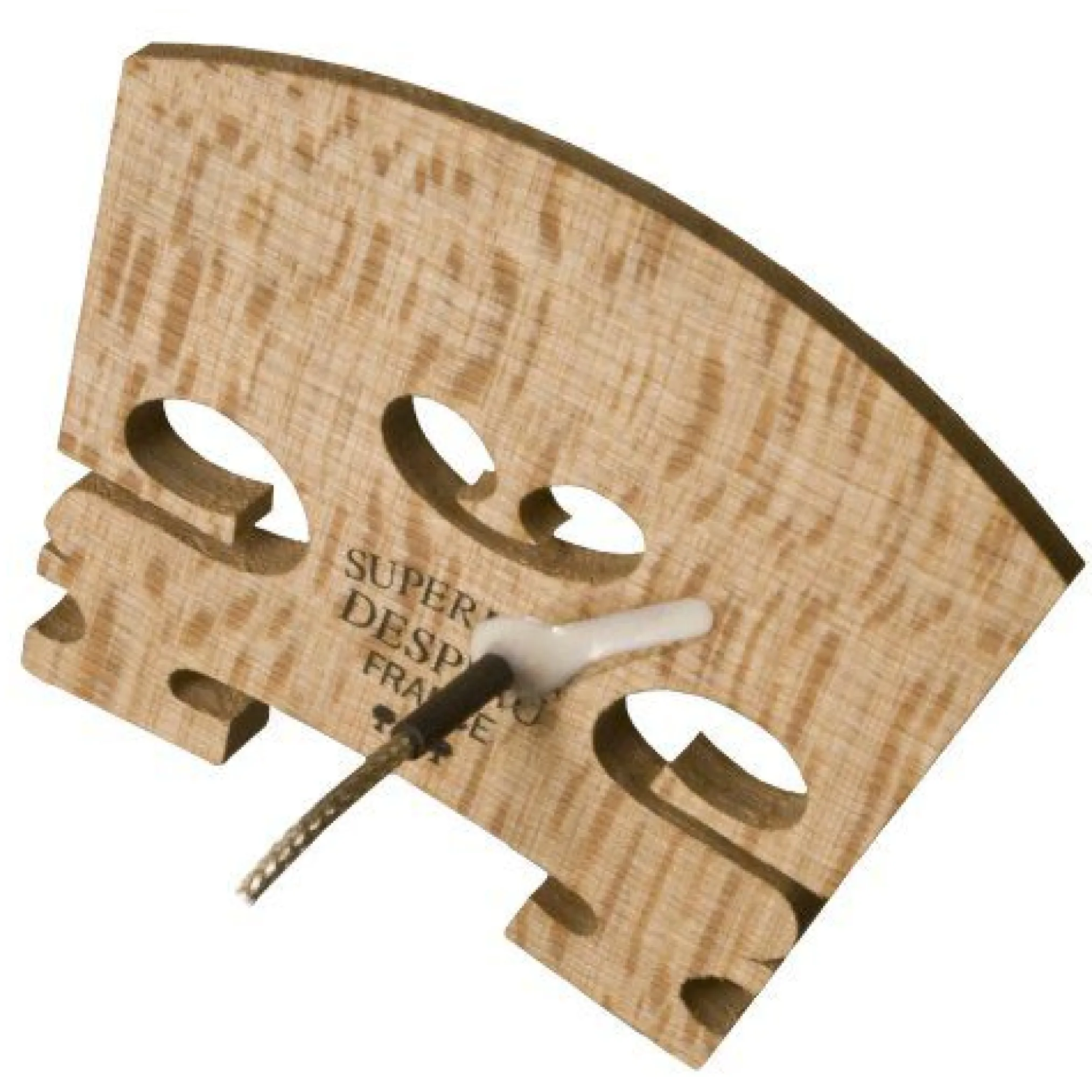 This Violin Pickup is a miniature vibration sensor cast directly into a Superieur Despiau “Two Tree” maple bridge for maximum sensitivity and signal transfer. As an integral part of the bridge, it effortlessly captures the instrument’s inherent dynamics. Furthermore, its selective admittance pattern is aligned so that the signal is generated as the bridge moves in a left-right motion (in response to the string vibrations). The pickup also rejects any impulse directed to the plane of the bridge- minimizing annoying finger squeaks, body noise and feedback. It is the pickup of choice for top pros like Mark O’Connor, Darol Anger, Jean-Luc Ponty and Sara Watkins. An external preamp is recommended.
