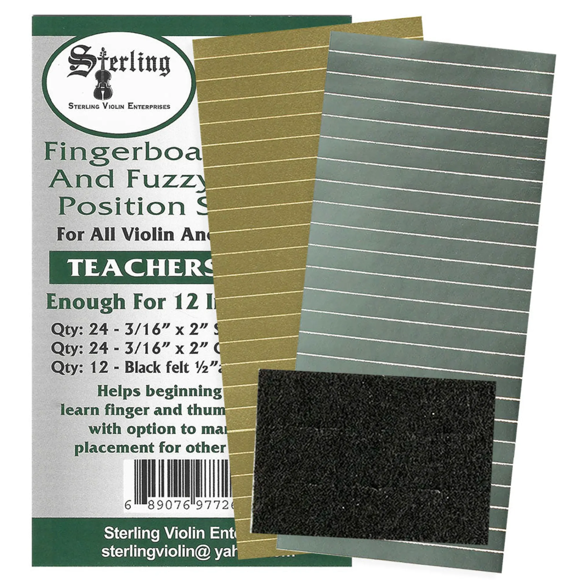 Mark! Set! Go! fingerboard tapes are easy to apply and hold up under constant playing. They are a cost effective way to introduce students to proper finger placement and are more adjustable and accurate than complete fingerboard stickers. This set comes a sheet of each of the gold and silver tapes, as well as the black felt stickers for thumb placement.