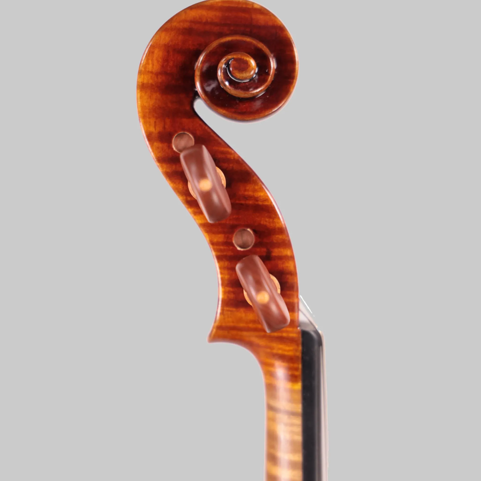 The wood for the top is made from carefully selectedEuropean spruce with fine grain. The wood for the two-piece maple back comes from the south of China and is selected for its vibrant and bold flame. The ribs and scroll are similar to the back.