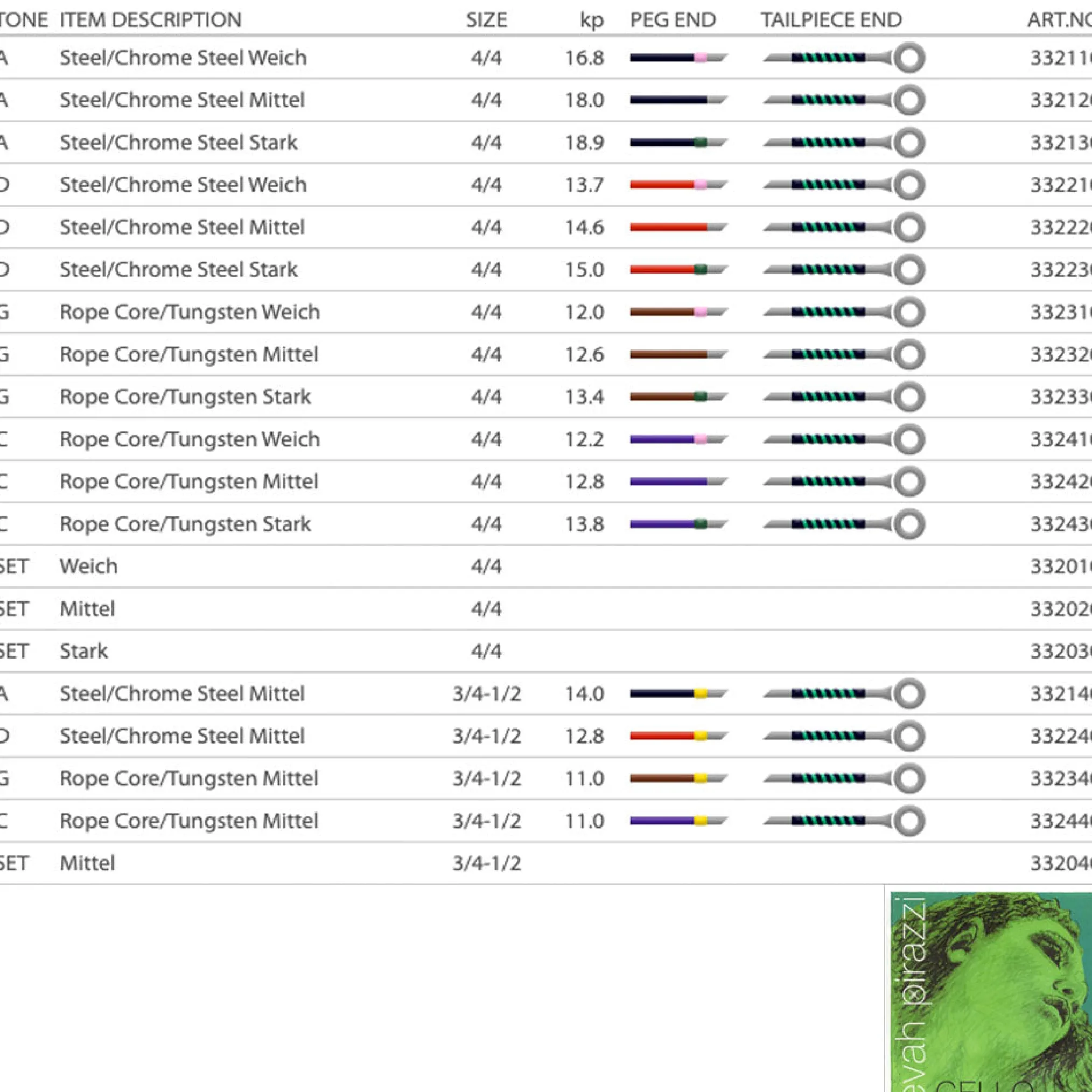 Evah Pirazzi strings are available in 4/4 and 3/4–1/2 size.