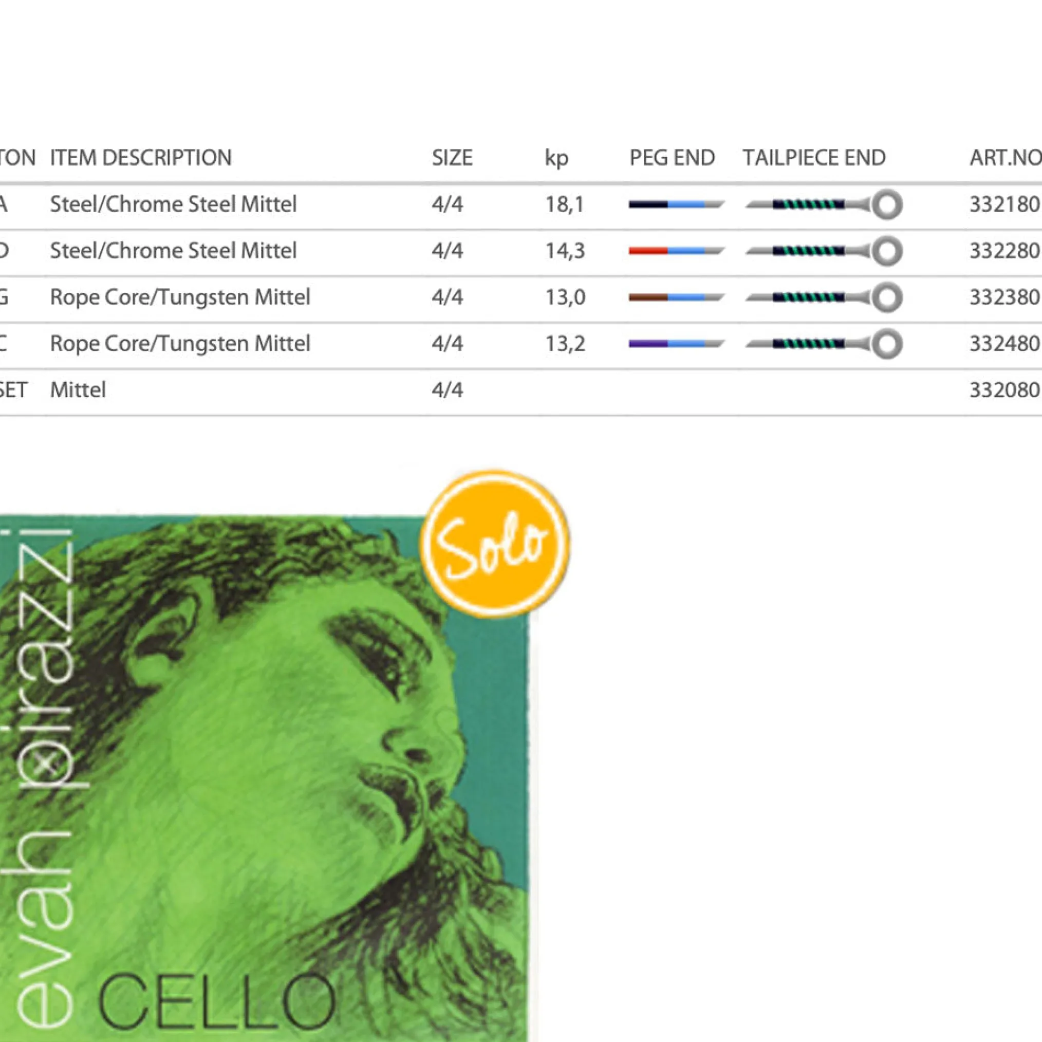 - Passione A medium, Evah Pirazzi Soloist D, Evah Pirazzi G strong, Evah Pirazzi Soloist C – bright and powerful sound