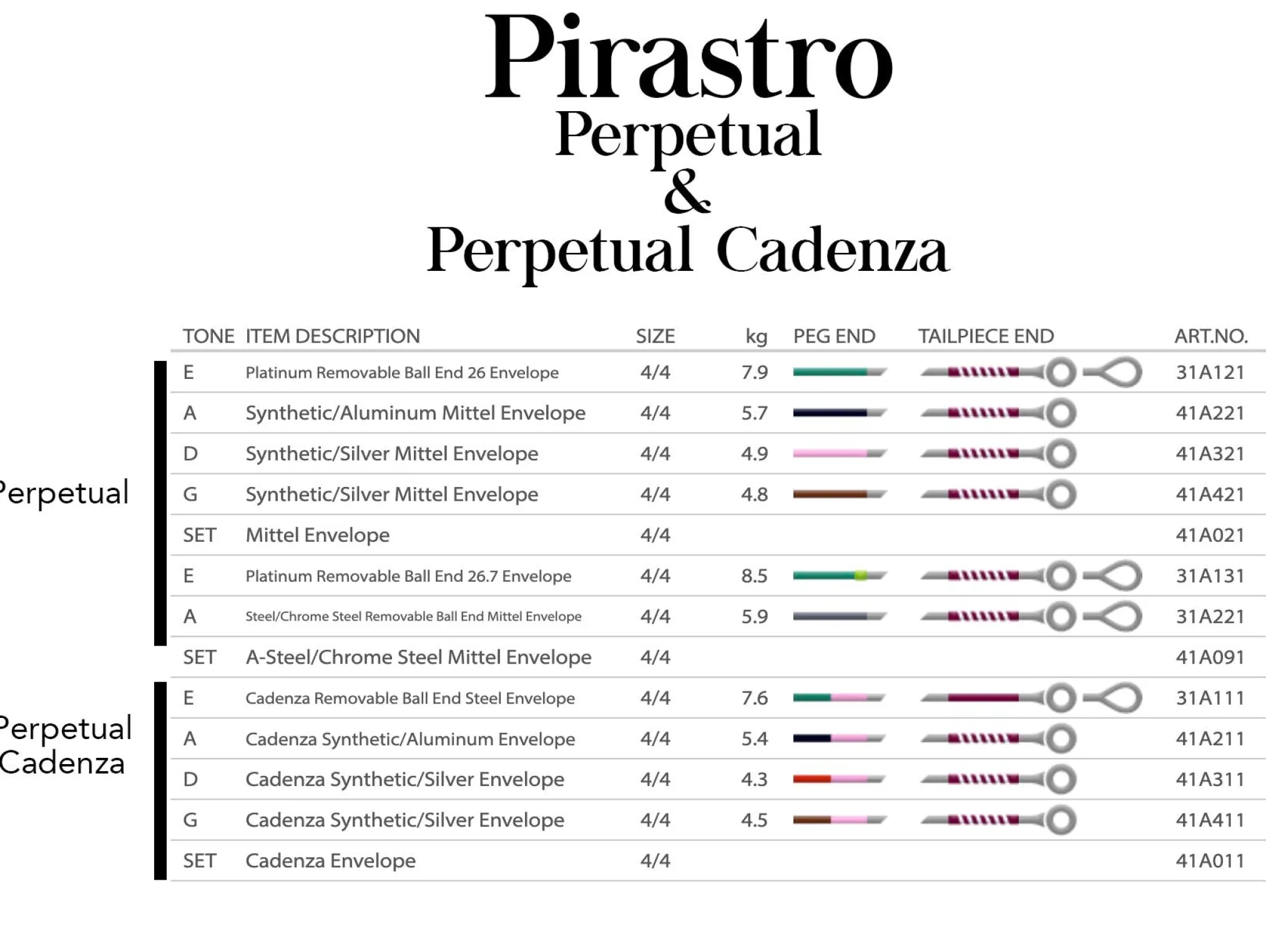The new Perpetual Cadenza violinstrings arecharacterized bytheir warm and very deep sound with a great wealth of colors and noticeably easy to play. In addition, these strings inspire the player with their brilliant, clear, and powerful sound as well as with their optimal response without resistance. The left hand feel is very light and soft due to its lower string tension. Shifting positions and portamenti can be played with noticeably less finger pressure. The overtones are rich and enable a wide range of color nuances while allowing the violin to resonate very freely.