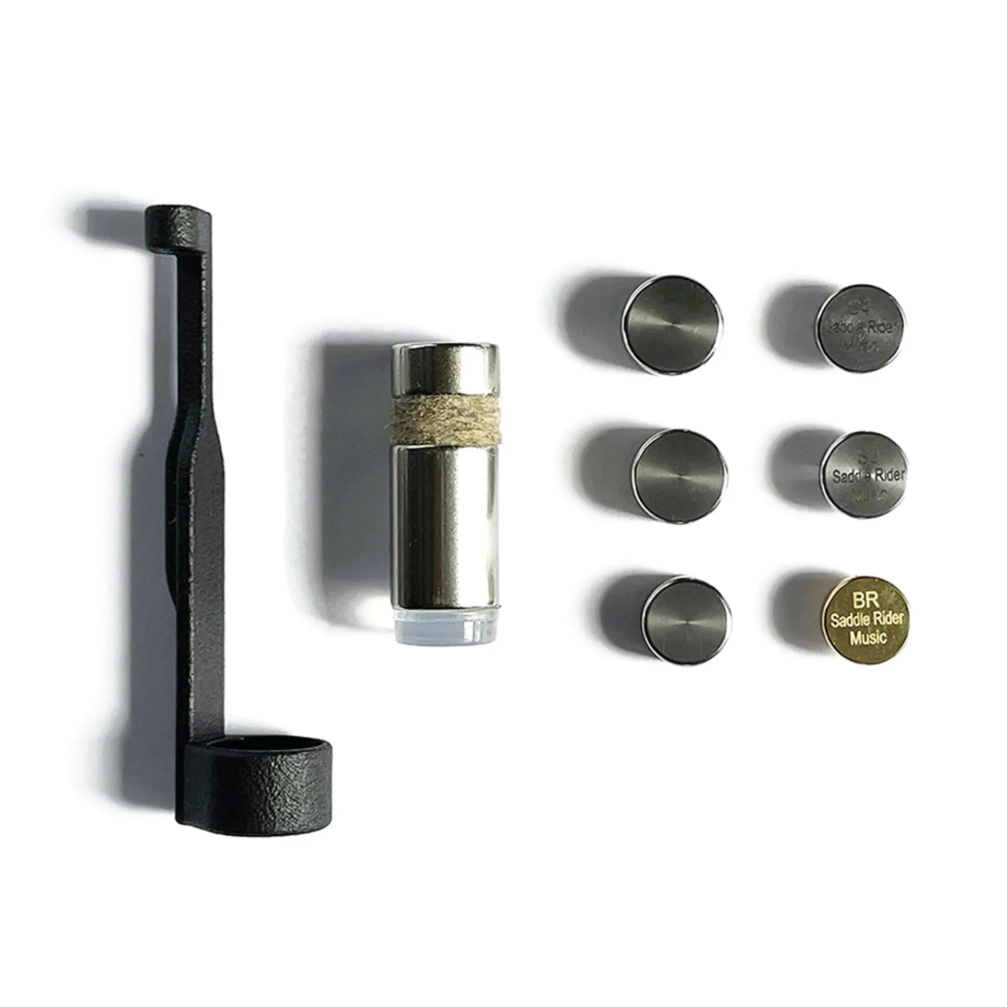 After several years of research including countless iterations of weighted clamps, physics experiments, and many hours of work on lathes and CNC machines, Saddle Rider Music introduces the“Wolf Rehabilitator Set” which includes the following array of wolf-taming tools in a boxed set: