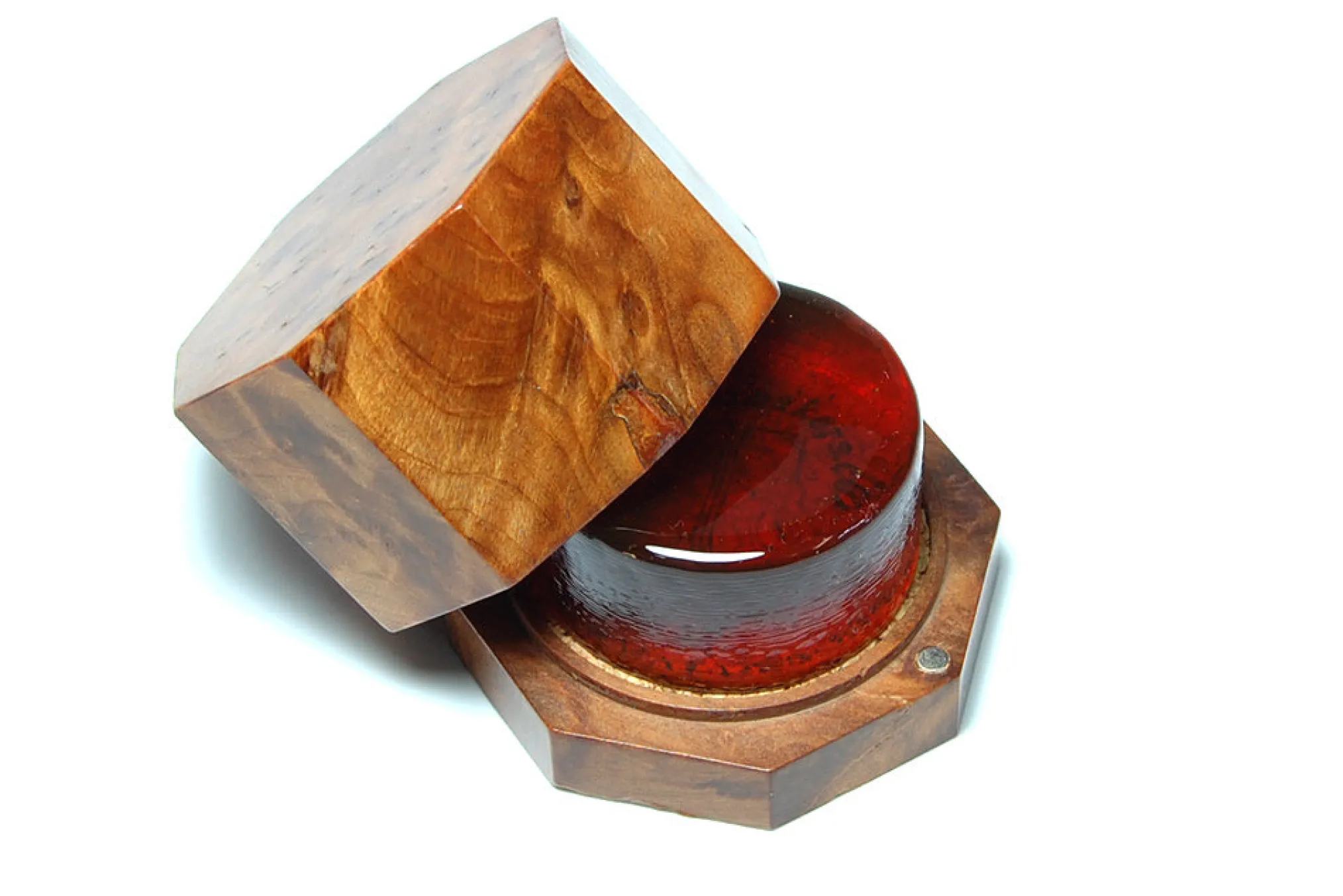 The magical and beautiful hard wood presentation box with magnetic closures, protects the rosin while in your case or on your music stand. The generous sized cake ensures a long life (dropping and shattering notwithstanding) It is mounted on natural cork to protect from the elements.