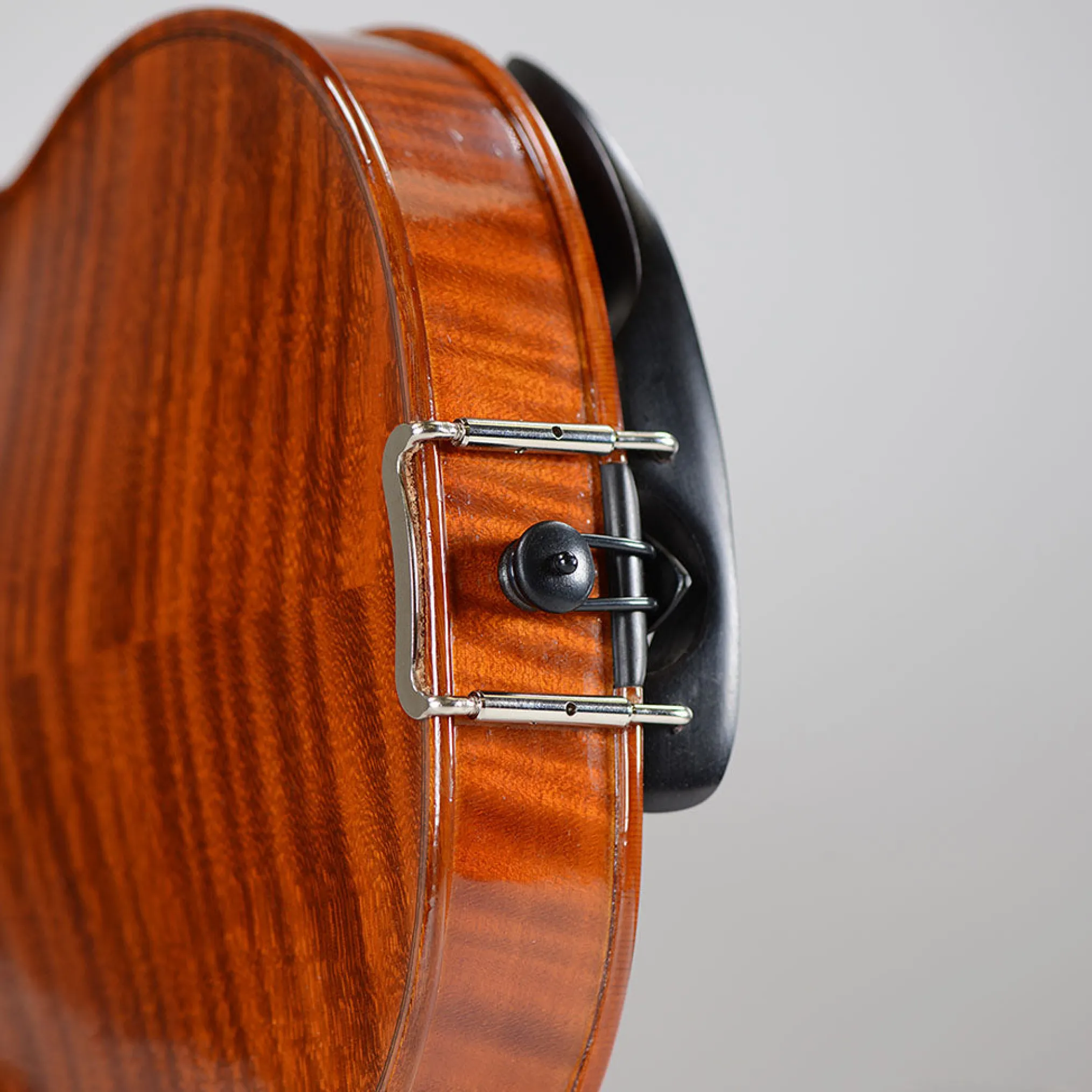 The end button is found at the end or bottom of the violin body and can be made from almost any type of wood, (or also more recently in Titanium). The tail gut of the modern violin attaches at the end of the tailpiece and loops around the end button so it has a secure anchor point to hold the tailpiece in place.