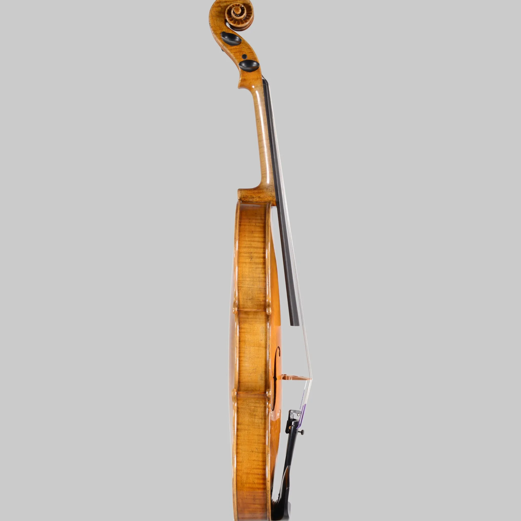 A fine violin made by Taras Andrash in 2024 using well-seasoned European tonewoods. This instrument features a golden yellow oil varnish with brown reflections and light antiquing. It was set up and adjusted by our master luthier, A.M. Bilva. The sound is clear, focused, and sweet with a quick response. This is the second of two violins from the same year.