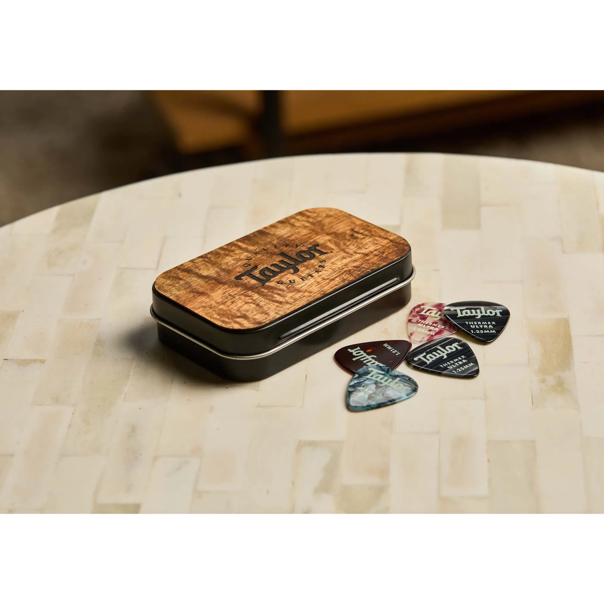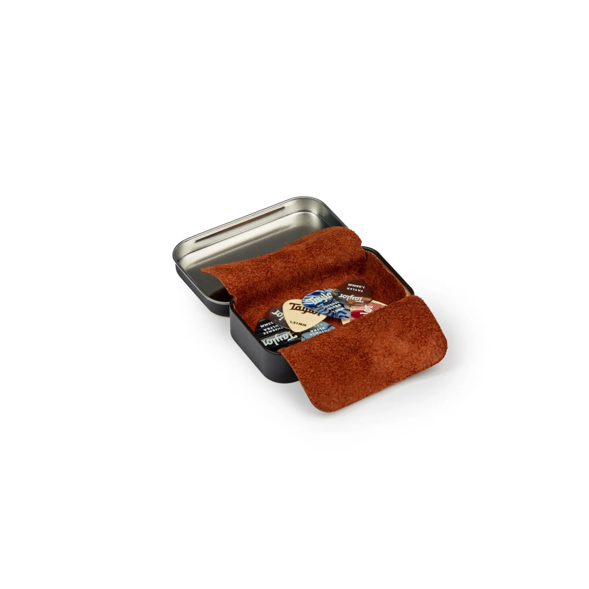 Since the guitar pick as we know it was introduced in 1922, players have been choosing their picks almost entirely on function and feel. Taylor has rethought every aspect of pick design for these DarkTone Series guitar picks, offering players a wider range of musical colors with new materials that emphasize different parts of the frequency range. This sample pack features one pick from each DarkTone family, with varying sizes and materials so that you can experiment with the array of sonic textures that your guitar can produce. Try these tone-enhancing picks and hear what you’ve been missing. This Collector’s Edition DarkTone pick pack features a genuine Hawaiian koa wood top and classic brown leather lining. As functional as it is beautiful, this pick tin is a striking addition to any space where you make music. Model # 2601