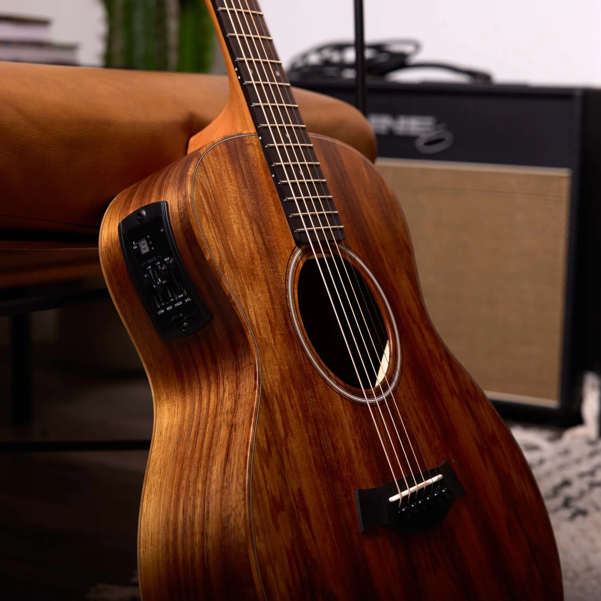 Travel & Small-Body Guitar | Hawaiian Koa Top | Layered Koa Back and Sides | Sapele Neck | West African Crelicam Ebony Fretboard | ES-B Electronics | Non-cutaway | Structured Gig Bag Case
