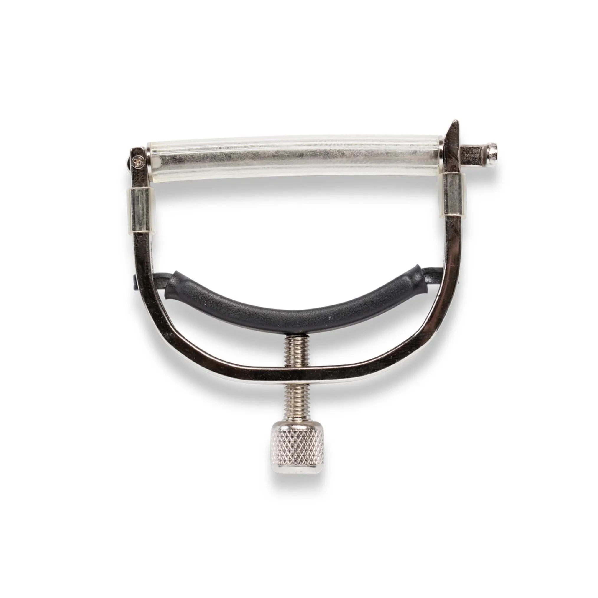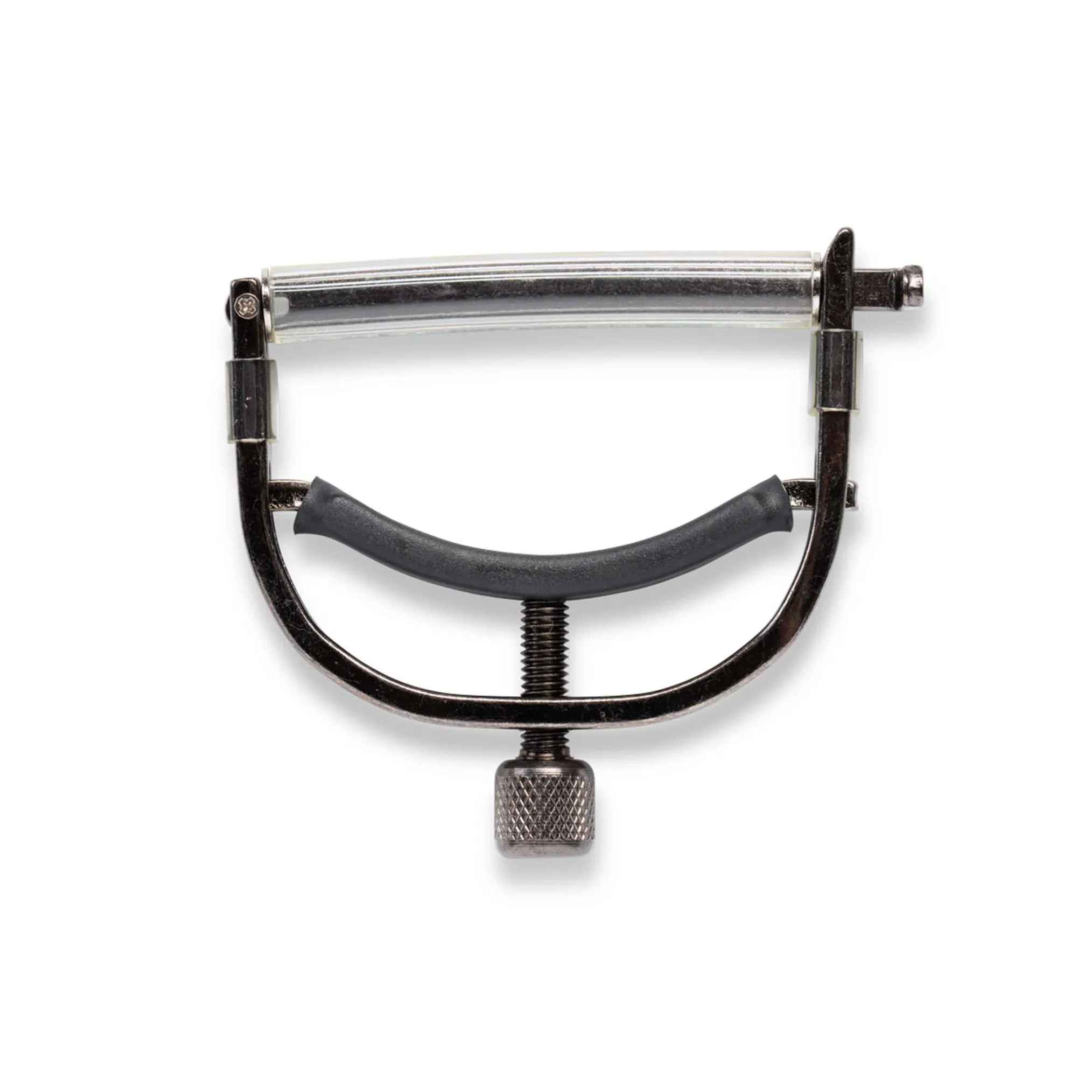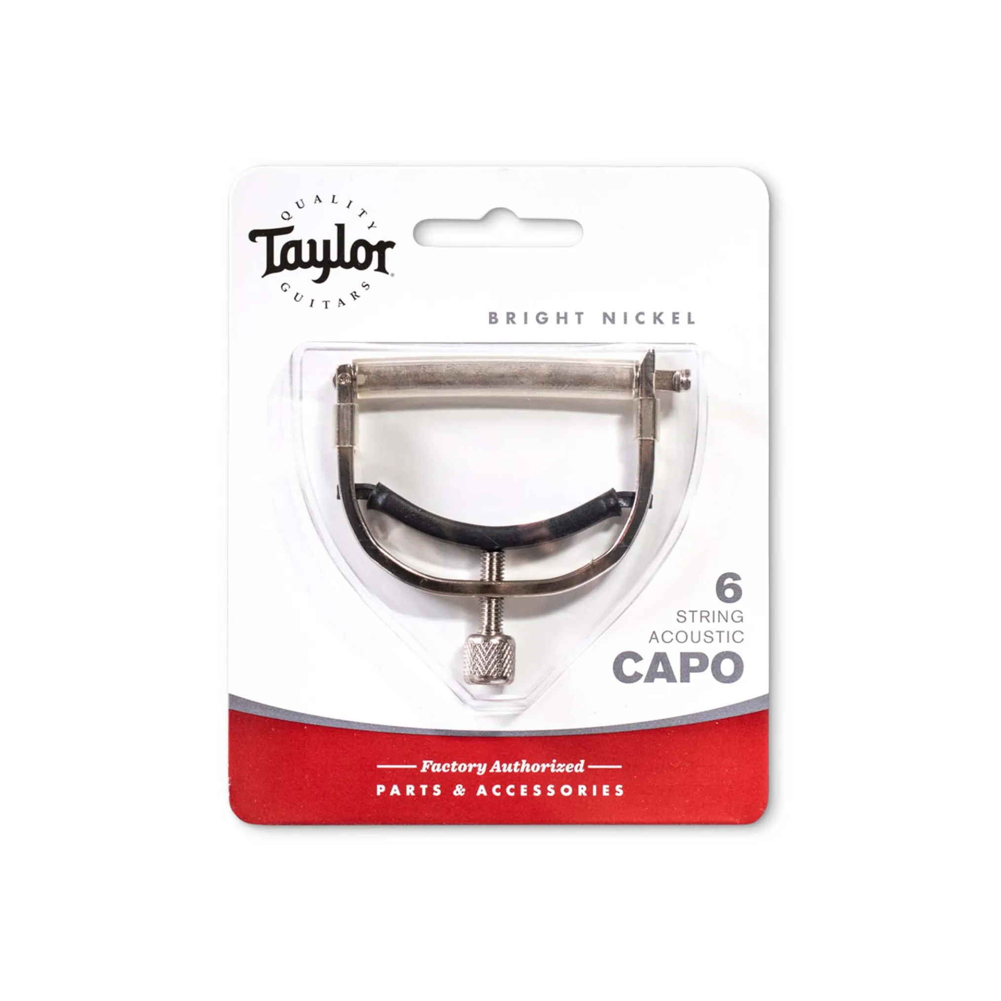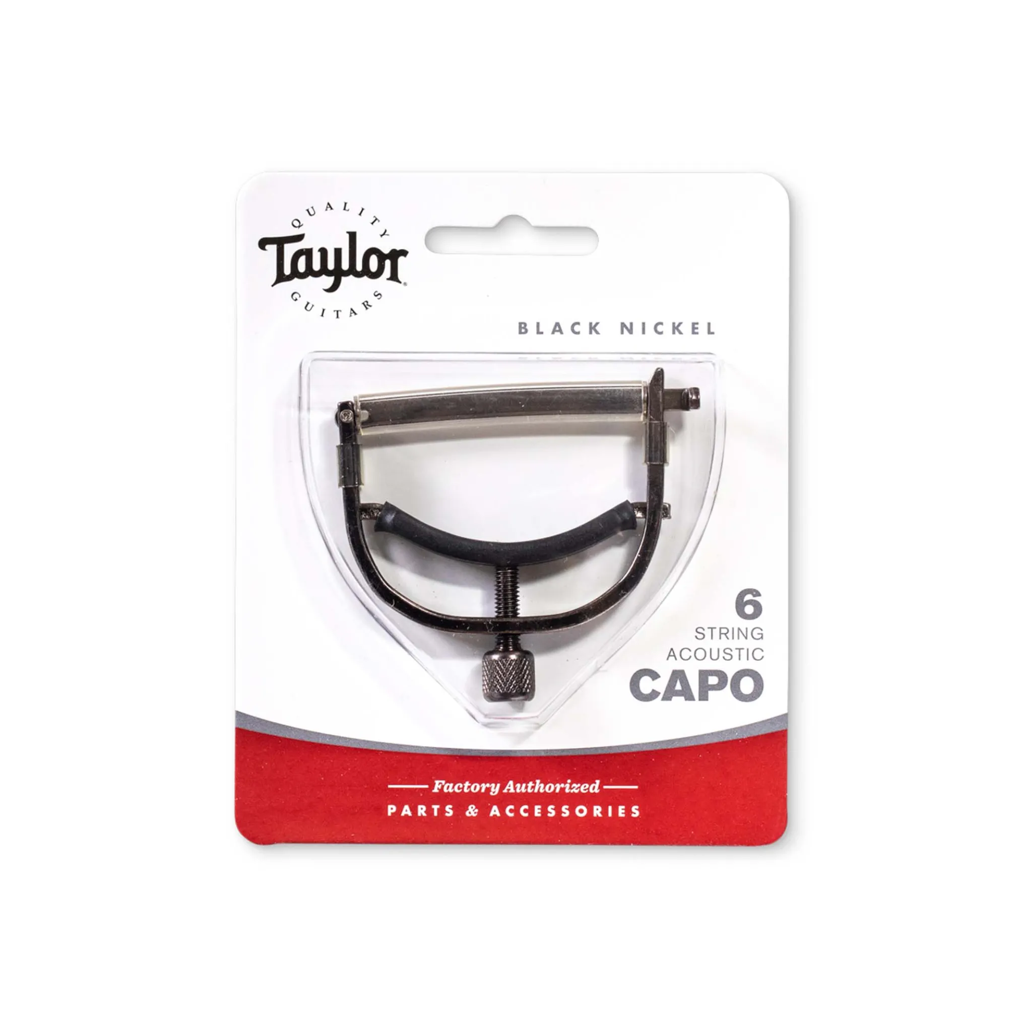 Guitar capo with around-the-neck yoke design to ensure superior tone, intonation and tuning stability. Easily stored behind the nut when not in use. Black or bright nickel finish. Made in USA. Taylor Model #80491 (Black Nickel) & Model 80492 (Bright Nickel)