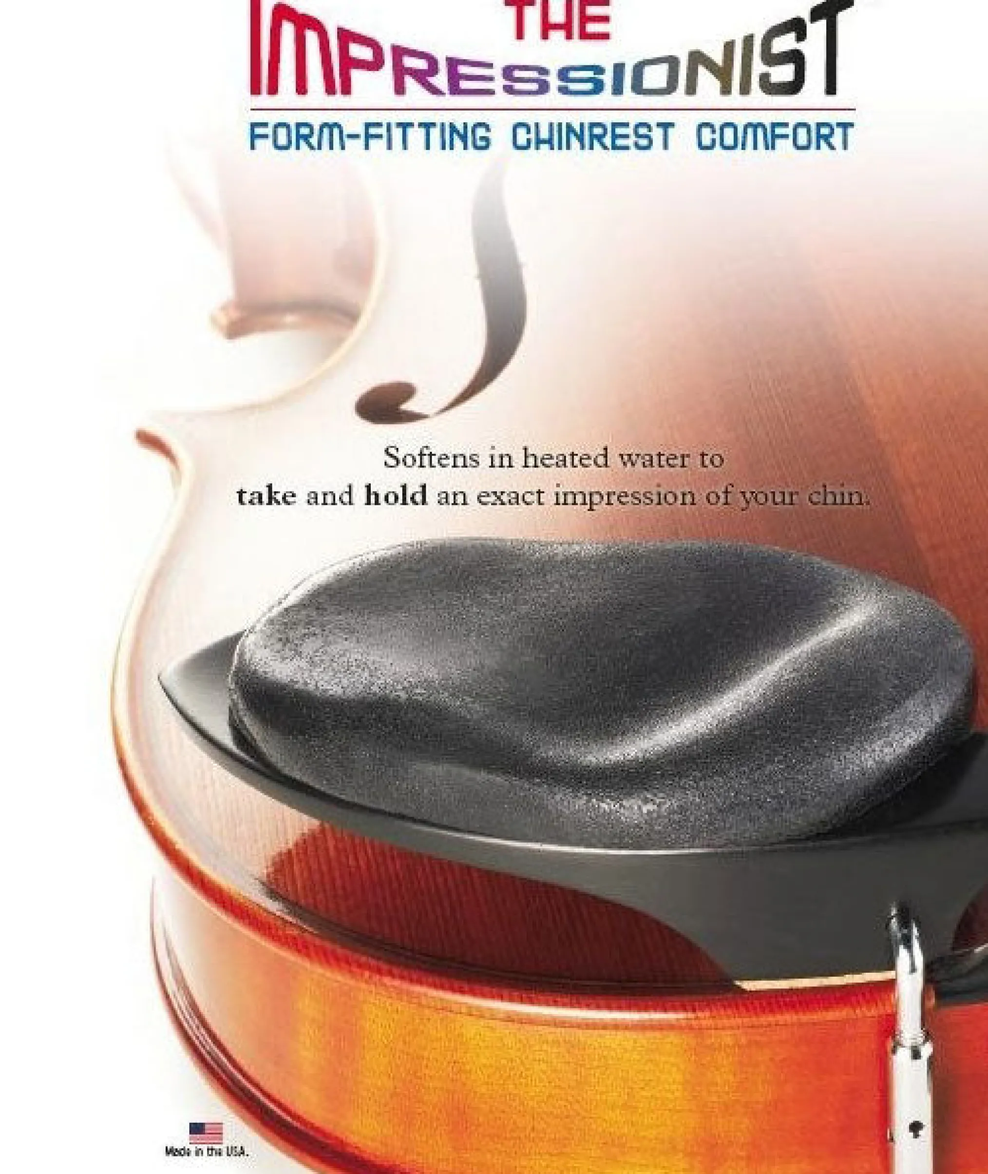 The Impressionist – The Most Revolutionary Advance in Violin Comfort Since… the Chinrest! The Impressionist is the first real improvement in chinrest comfort in 177 years. Just soften in hot water, towel-dry, and place it on top of your violin or viola chinrest. Holding the instrument normally for five seconds allows The Impressionist to take an exact impression of your jaw. Give it fifteen minutes to cool, and that’s all there is to it. You can reshape it as many times as you wish!