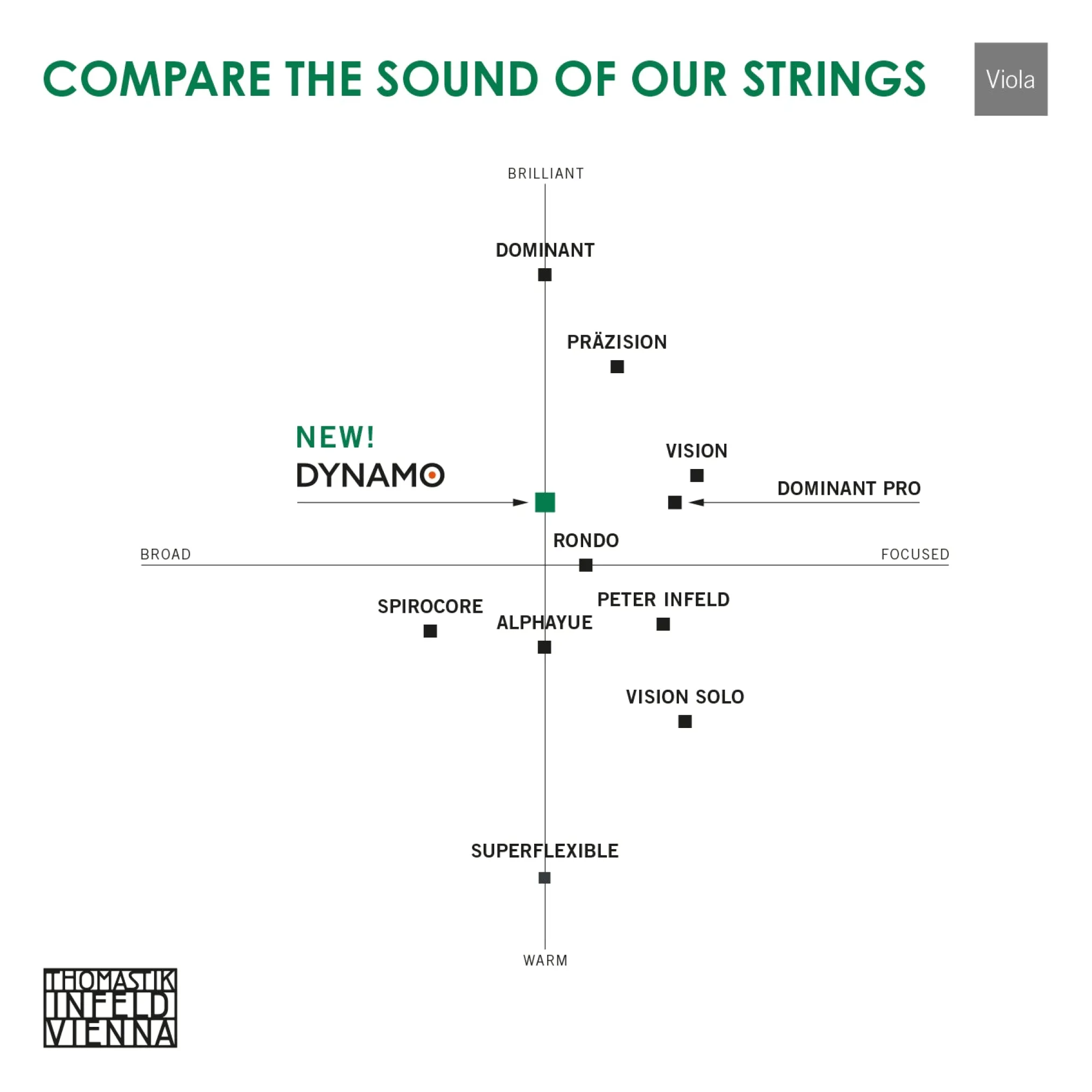 Introducing ThomastikDYNAMO Strings for viola, a testament to passion and patience, merging qualities previously unattainable in a single set. The big core design produces a dark and powerful sound with a broad profile and excellent response, offering a wide dynamic range and an easily modulated color palette.
