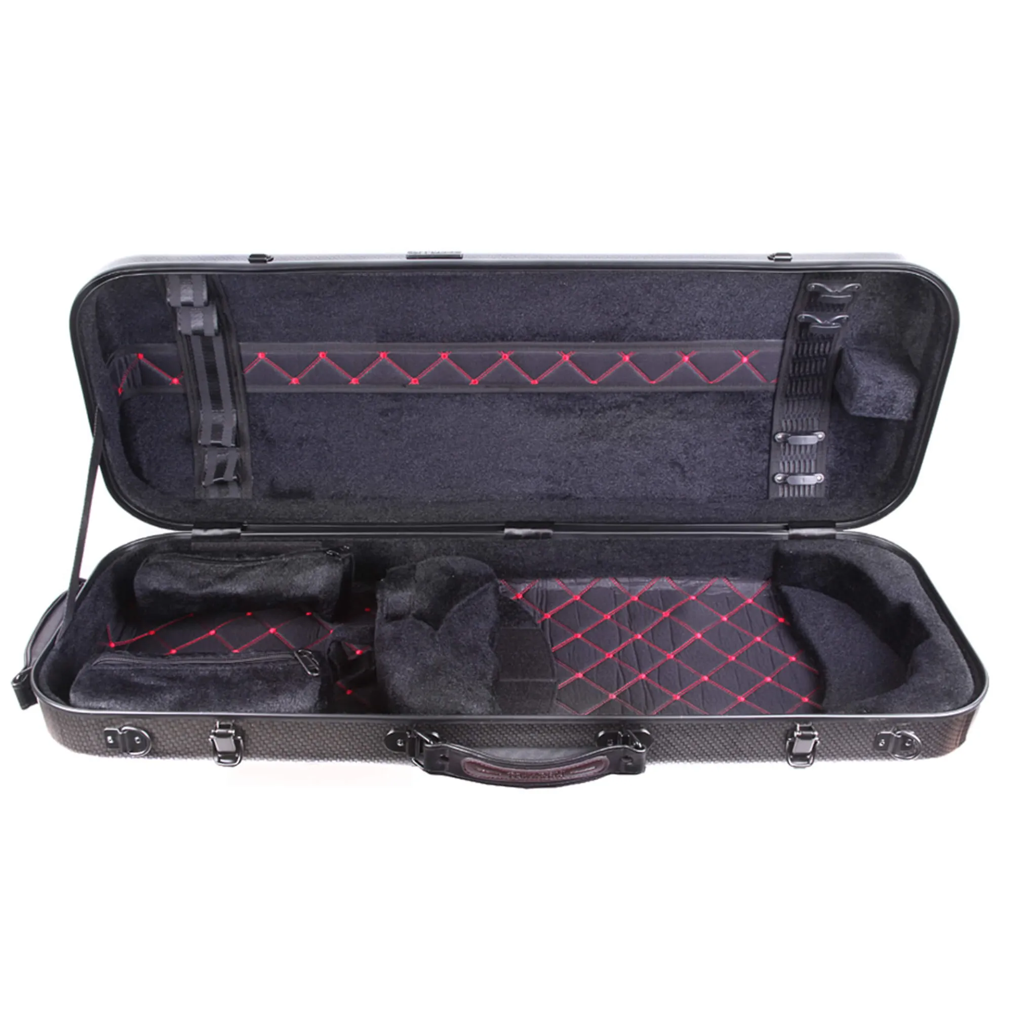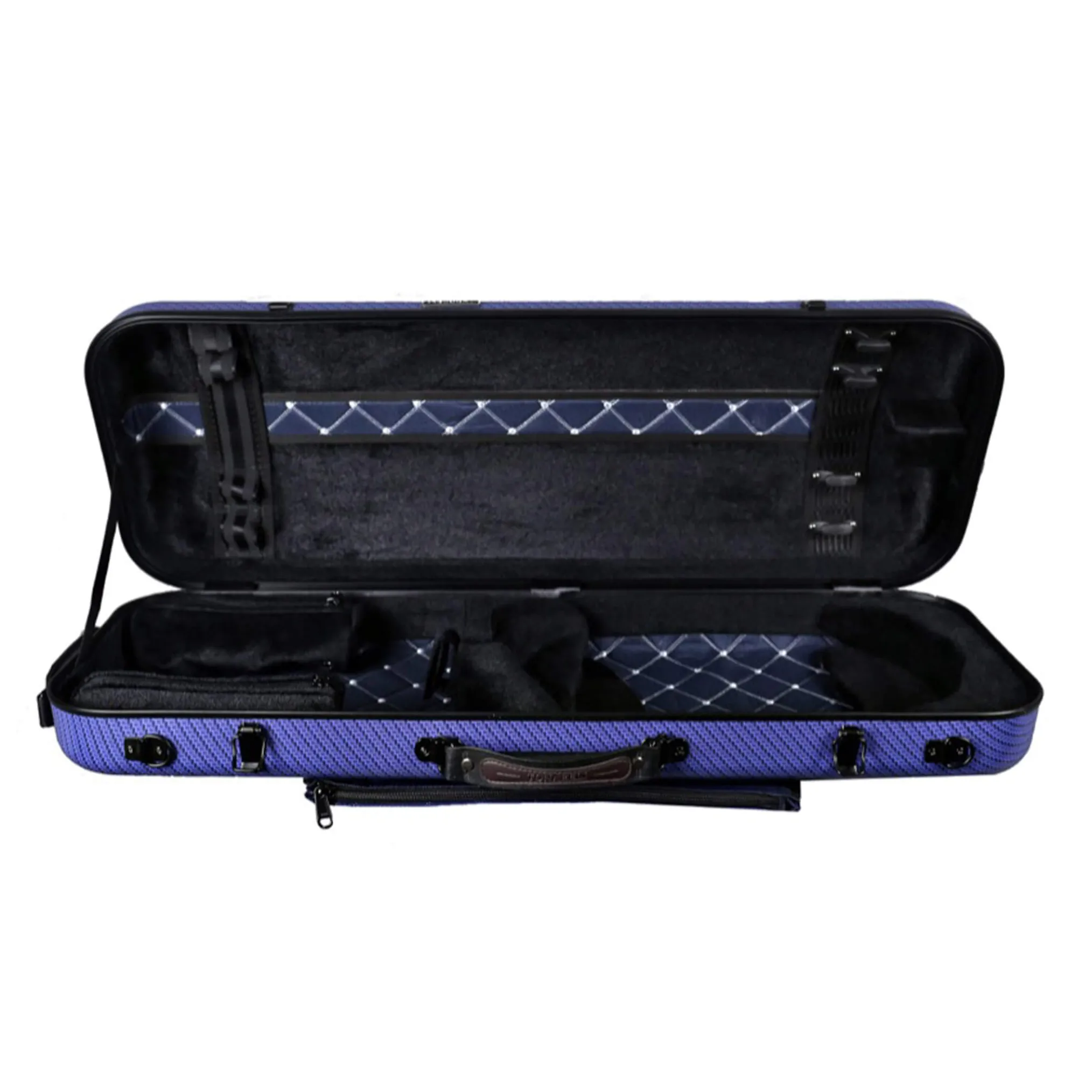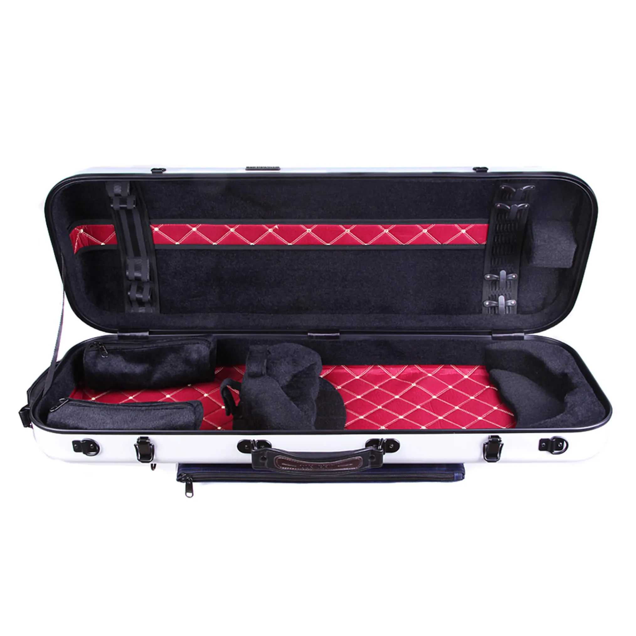 An absolutely stunning fiberglass shell not only protects your instrument from inclement weather and sudden temperature changes, but also gives the case a vibrant and colorful finish. Its interior design features a beautifully padded burgundy cushion with diamond-pattern stitching along the bottom of the case, and sturdy black padding on the sides to keep your viola nice and snug.