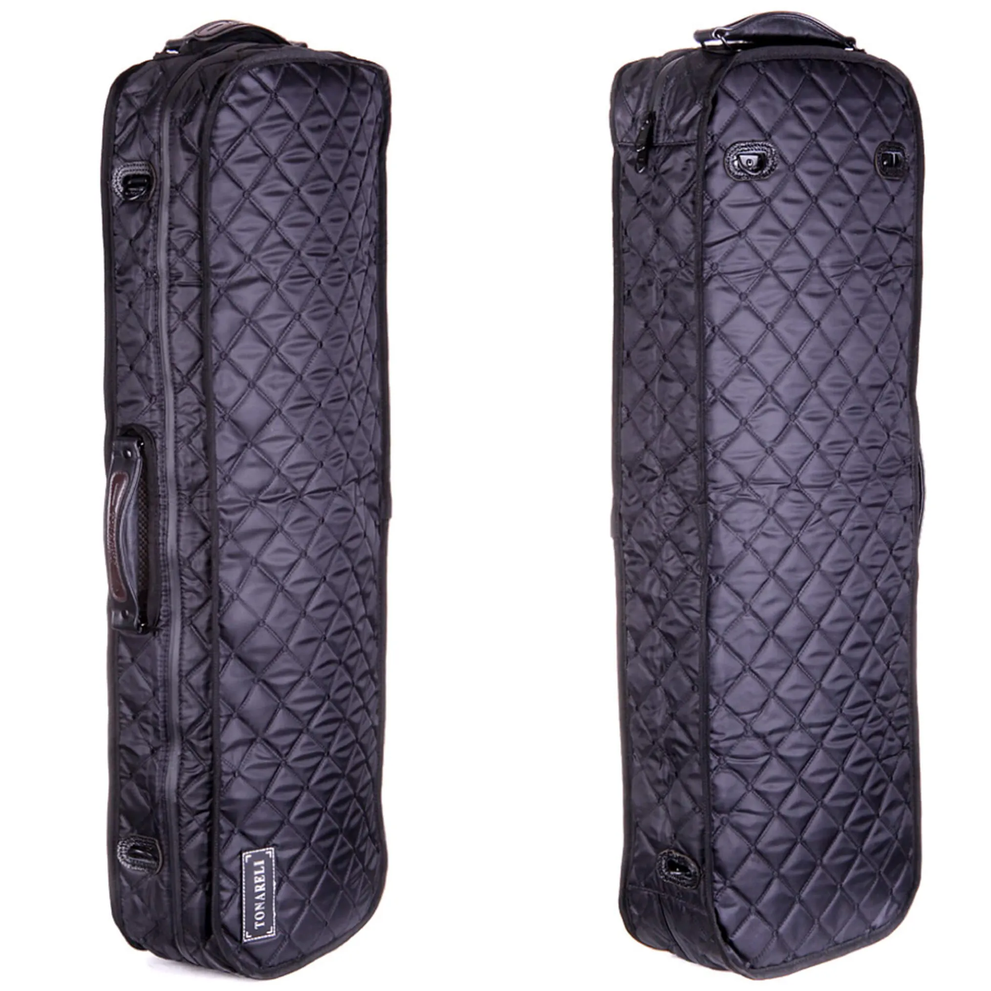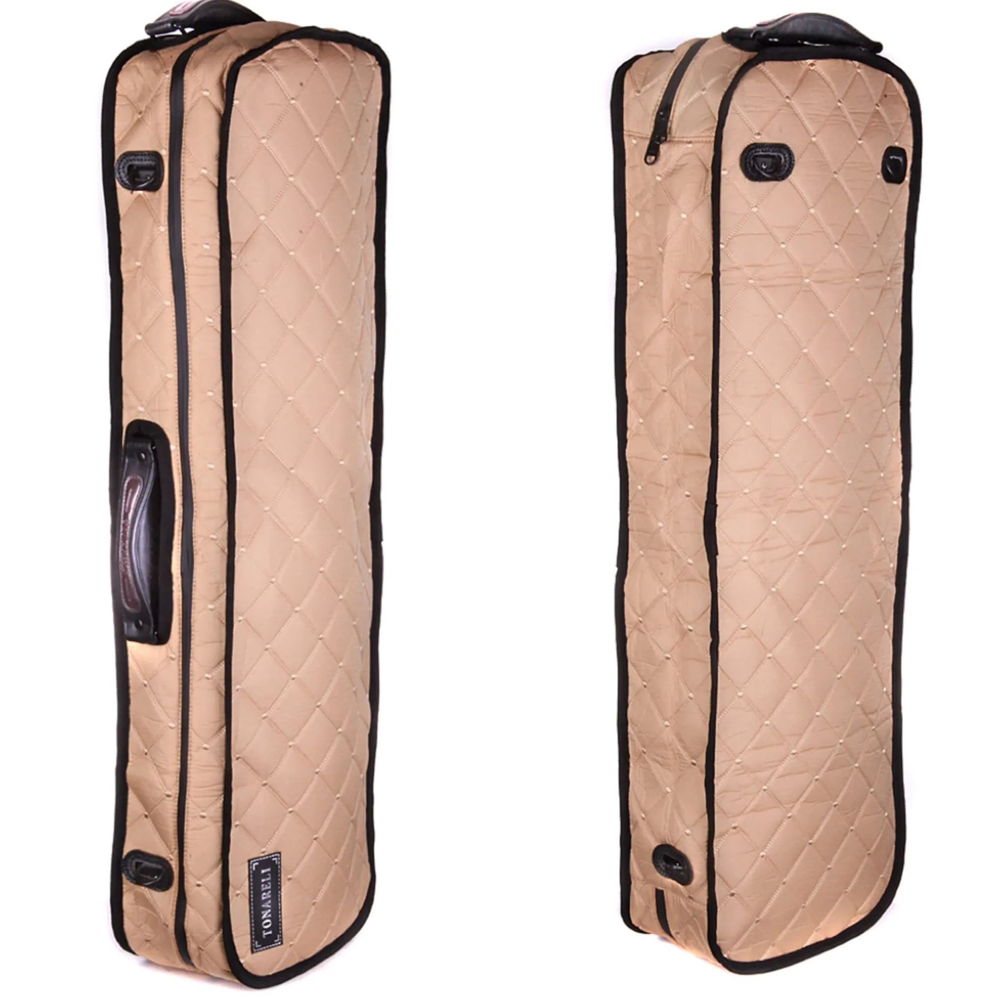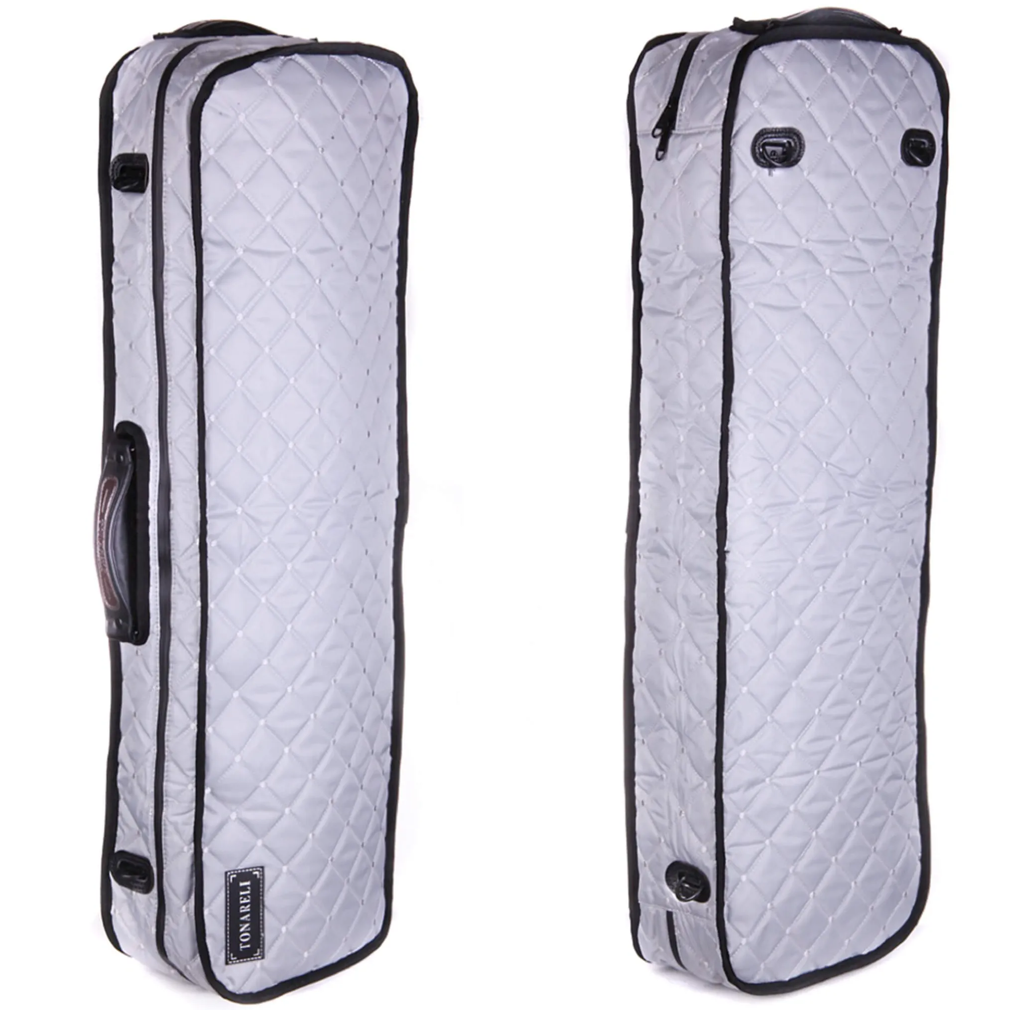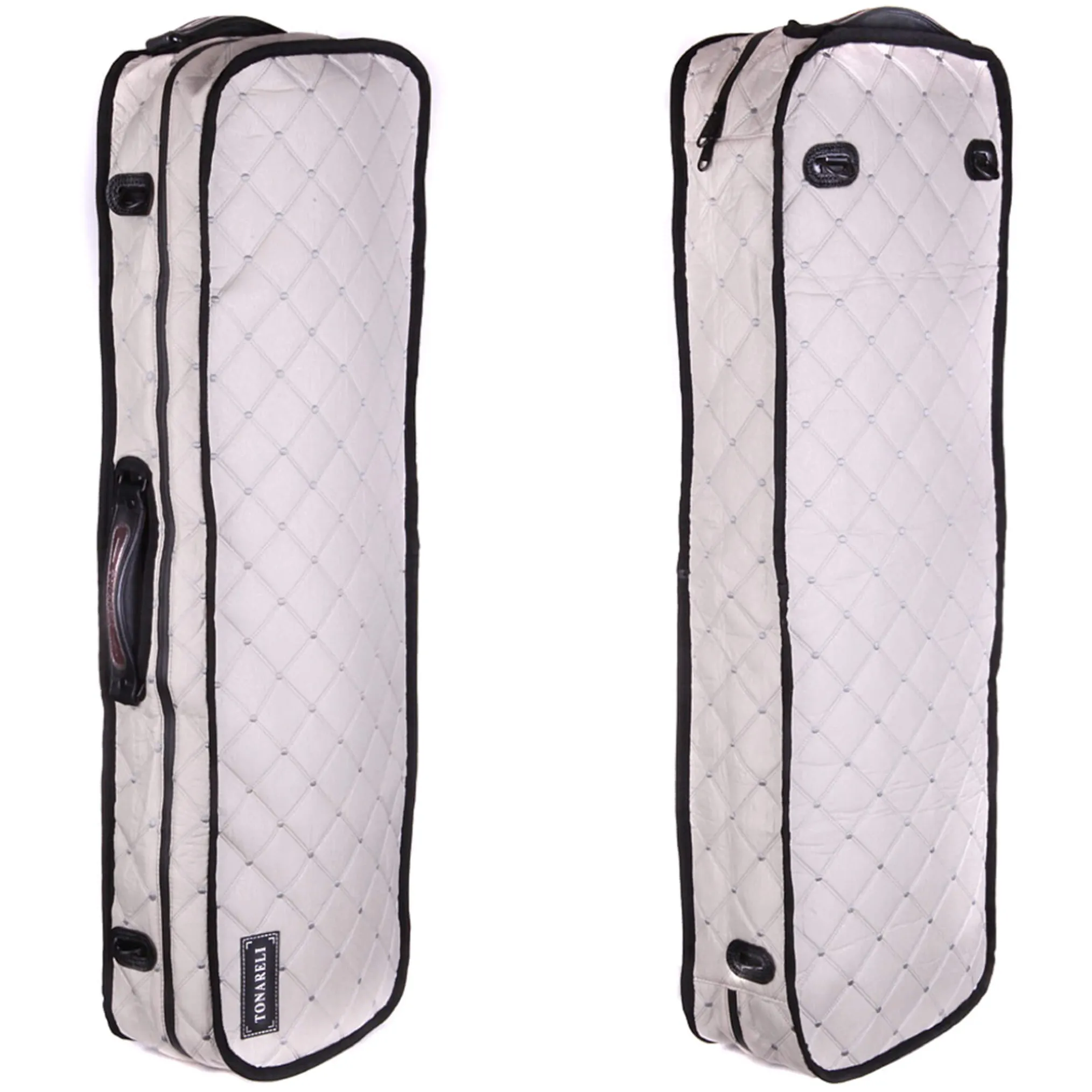 Tonareli case cover made specifically for the Tonareli VNFO series of oblong fiberglass violin cases. Made of water-resistant nylon and features a special water-resistant zipper. Has openings for all handles and D-rings so case can still be carried with straps when the cover is installed.