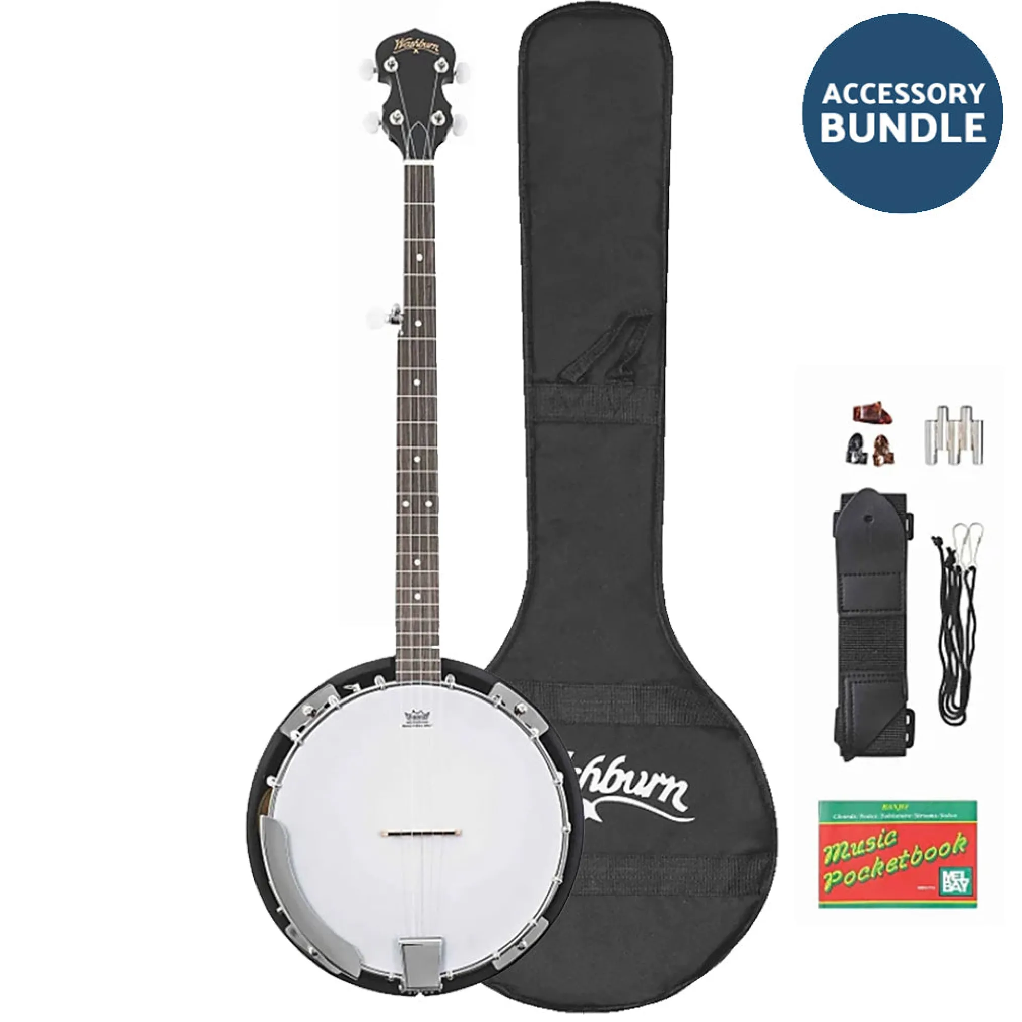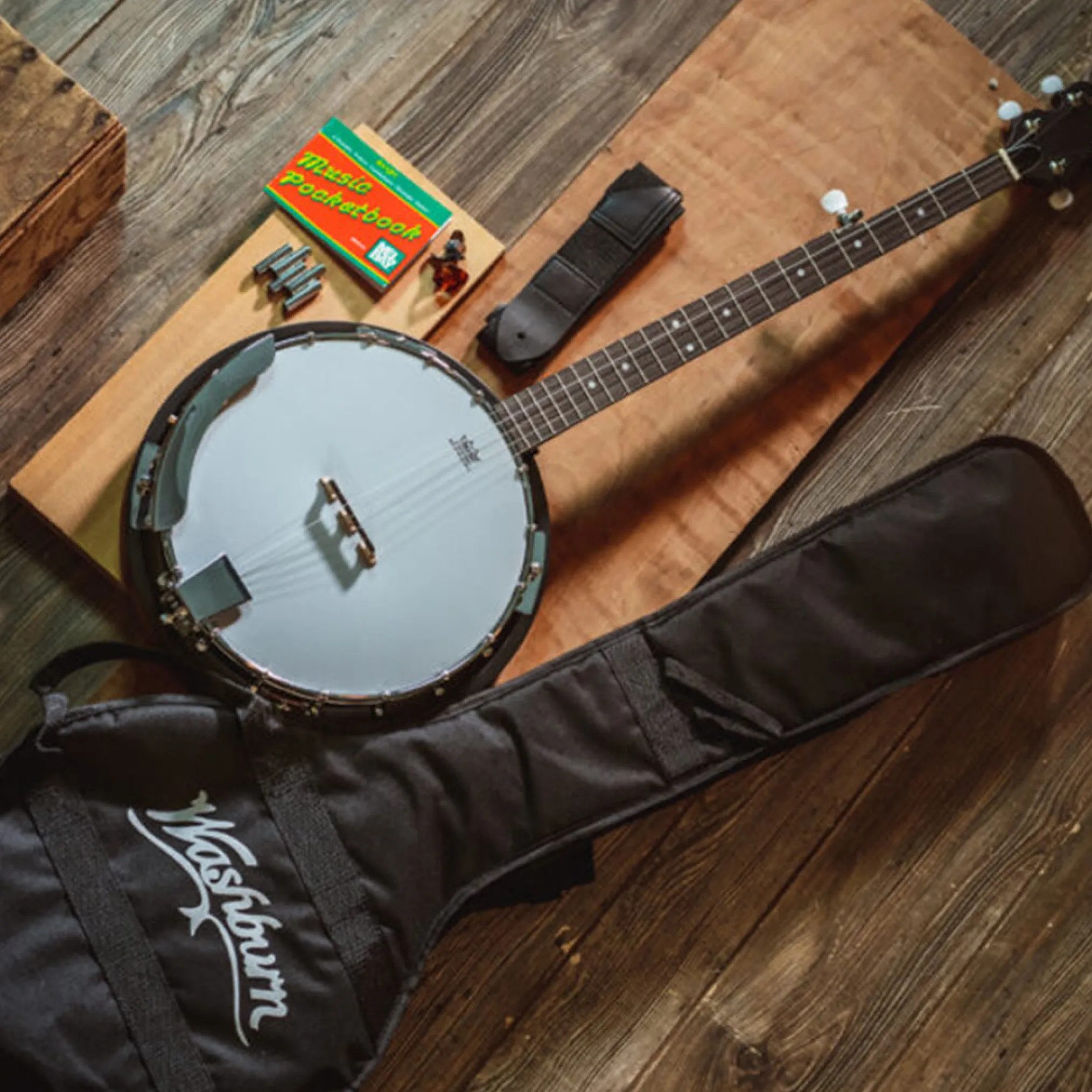 The B8 outfit includes a Washburn B8 Banjo, gig bag, pitch pipe, picks, instructional book, and strap.