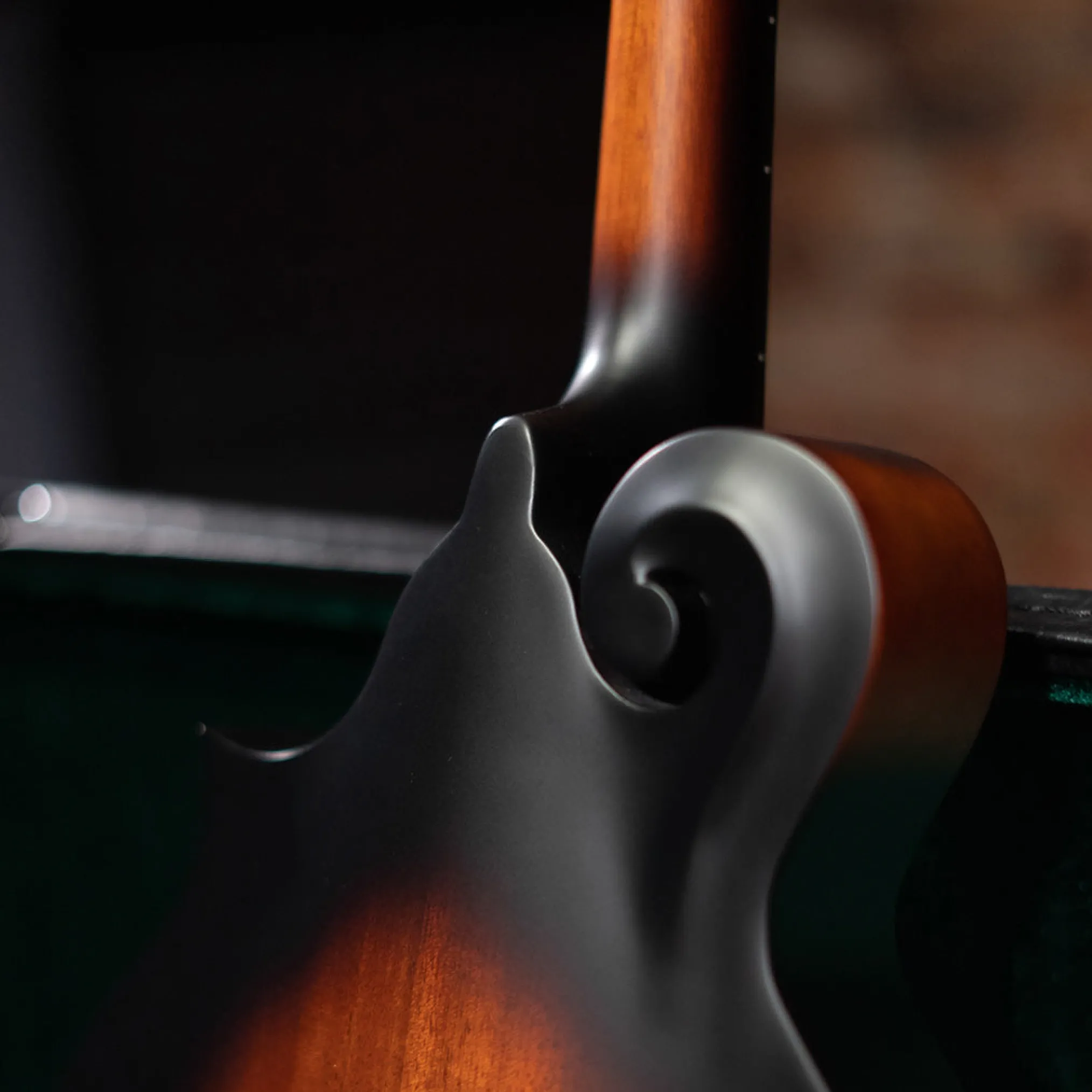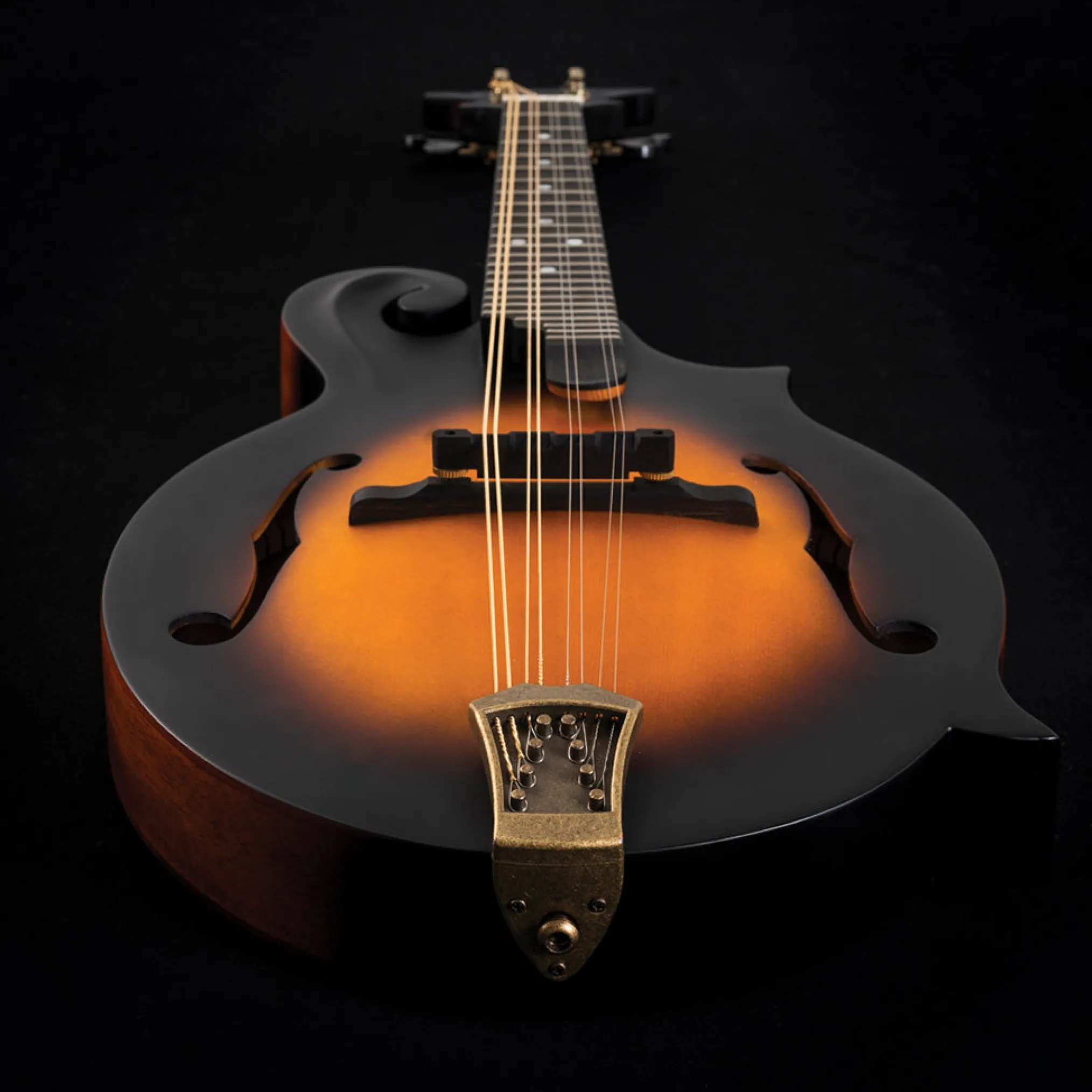 Washburn Americana Series all-solid F-Style Mandolin with solid carved European spruce top, and carved solid Mahogany back and sides, 1 1/4″ bone nut, distressed satin finish. Hard shell case included.