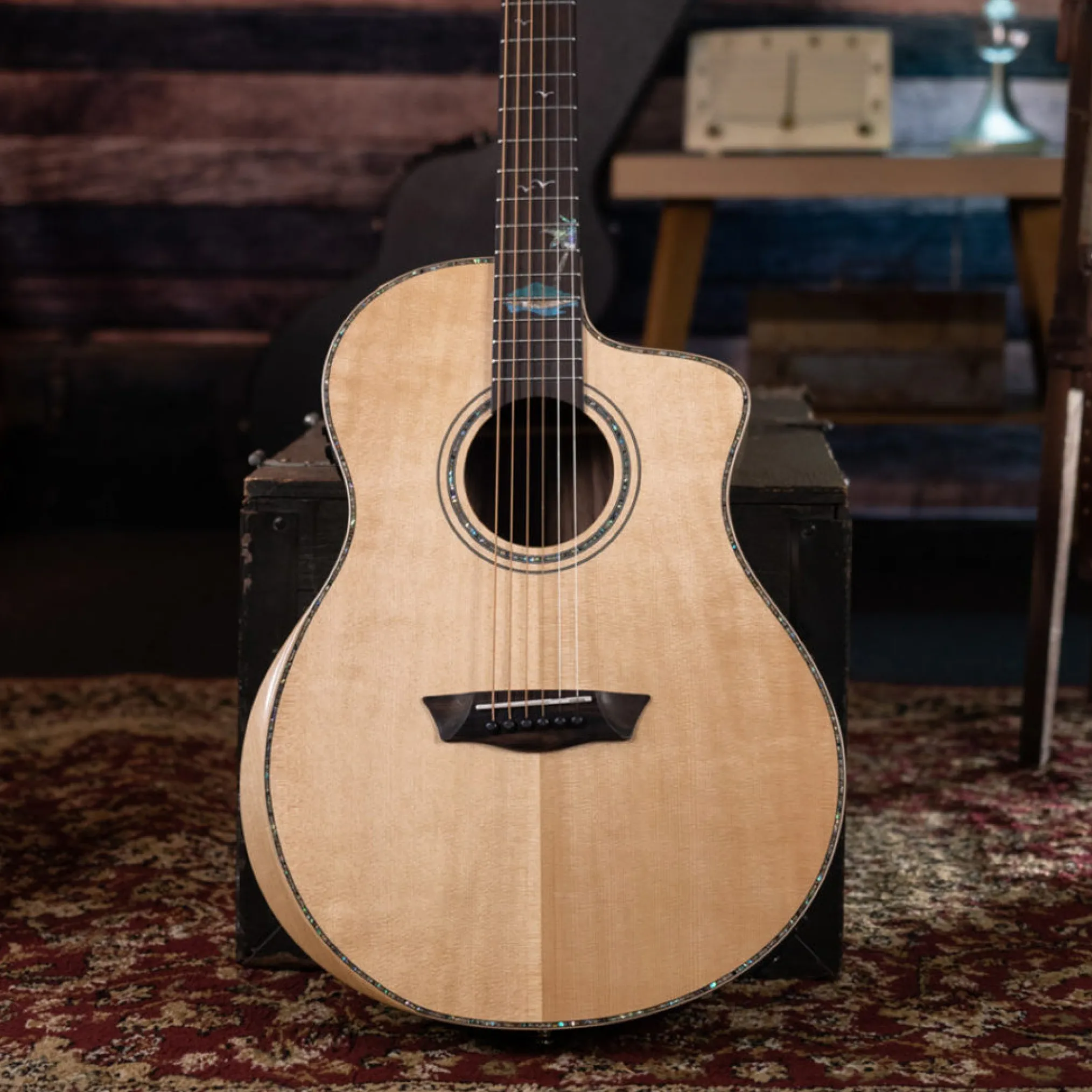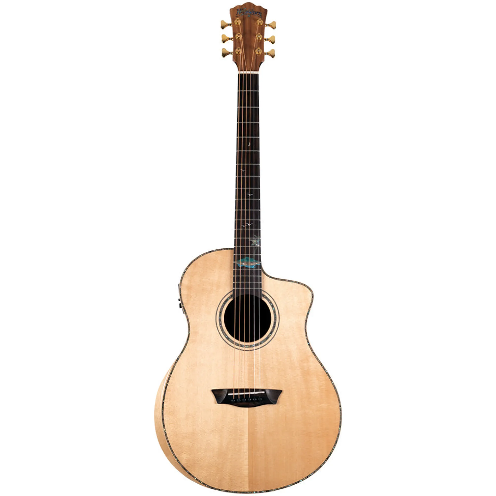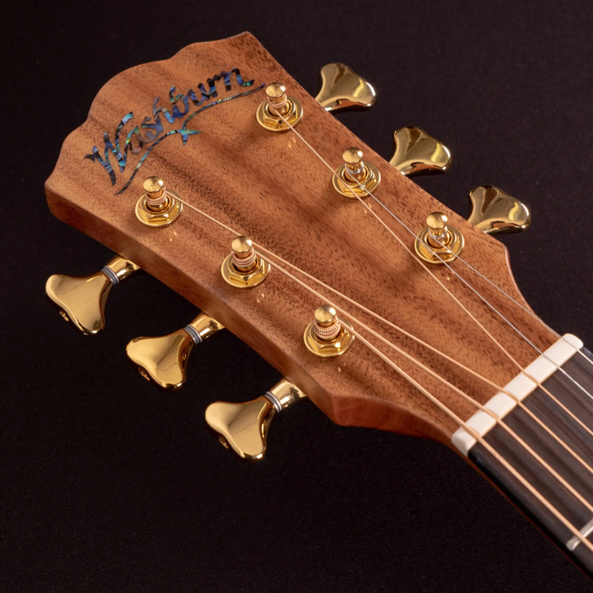 The Washburn Studio body design makes for an incredibly comfortable playing experience while managing to maintain the tight lows, focused mids and clear highs commonly associated with larger body sizes. The solid Spruce top helps define sonic nuances throughout the entire register of the instrument and showcases Washburn’s Comfort Arm Rest. Its full 25.5″ scale length extends an undeniable familiarity to the player and the satin finished, modern “C” profile of the Mahogany neck is smooth and cozy feeling in the hands.