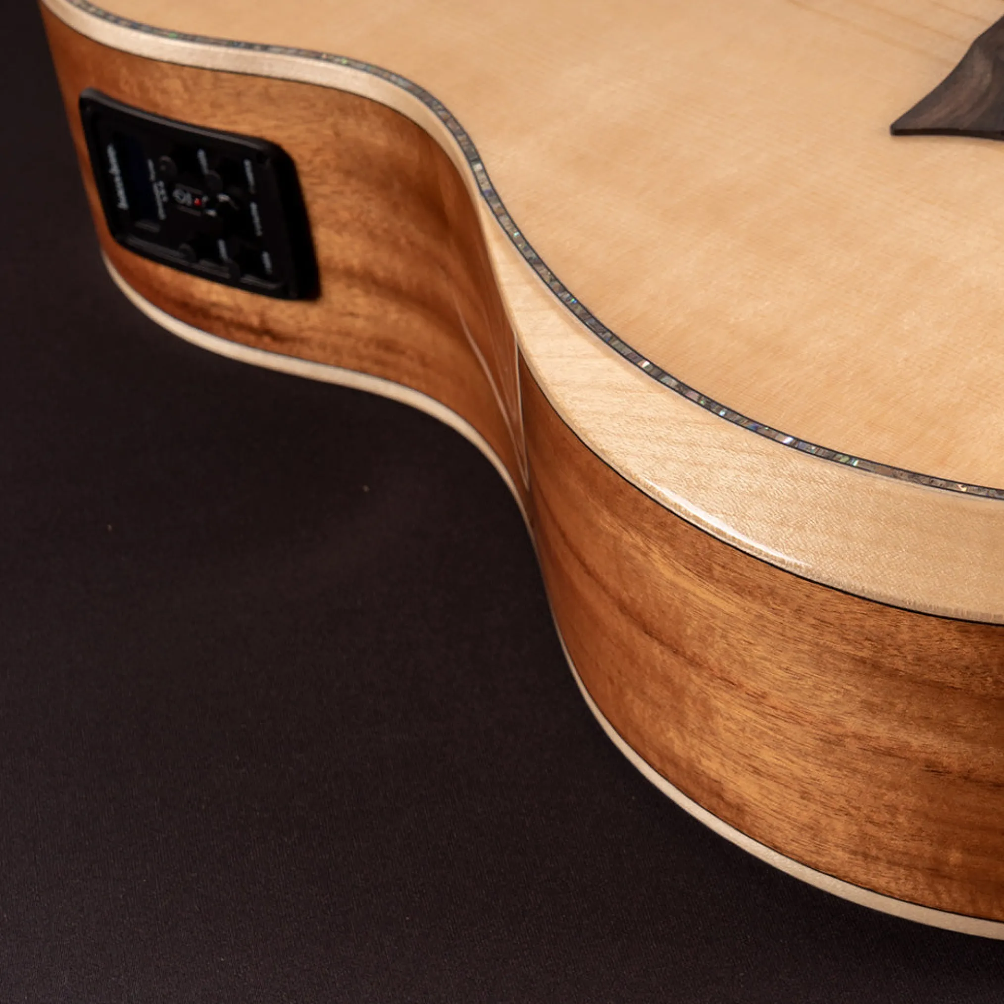 The flagship offering in the Bella Tono series is the SC56S Allure; pulling out all the stops and ticking off all the boxes. This model features a solid Spruce top, gorgeous Acacia back & sides and cutaway body design for easy access to the upper frets. The soundboard is adorned with stunning abalone for both the rosette and purfling and is bound in maple. The ebony fingerboard continues with the lush appointments; depicting a beach island scene of a palm tree and birds in flight which are inlaid in exquisite abalone and turquoise.