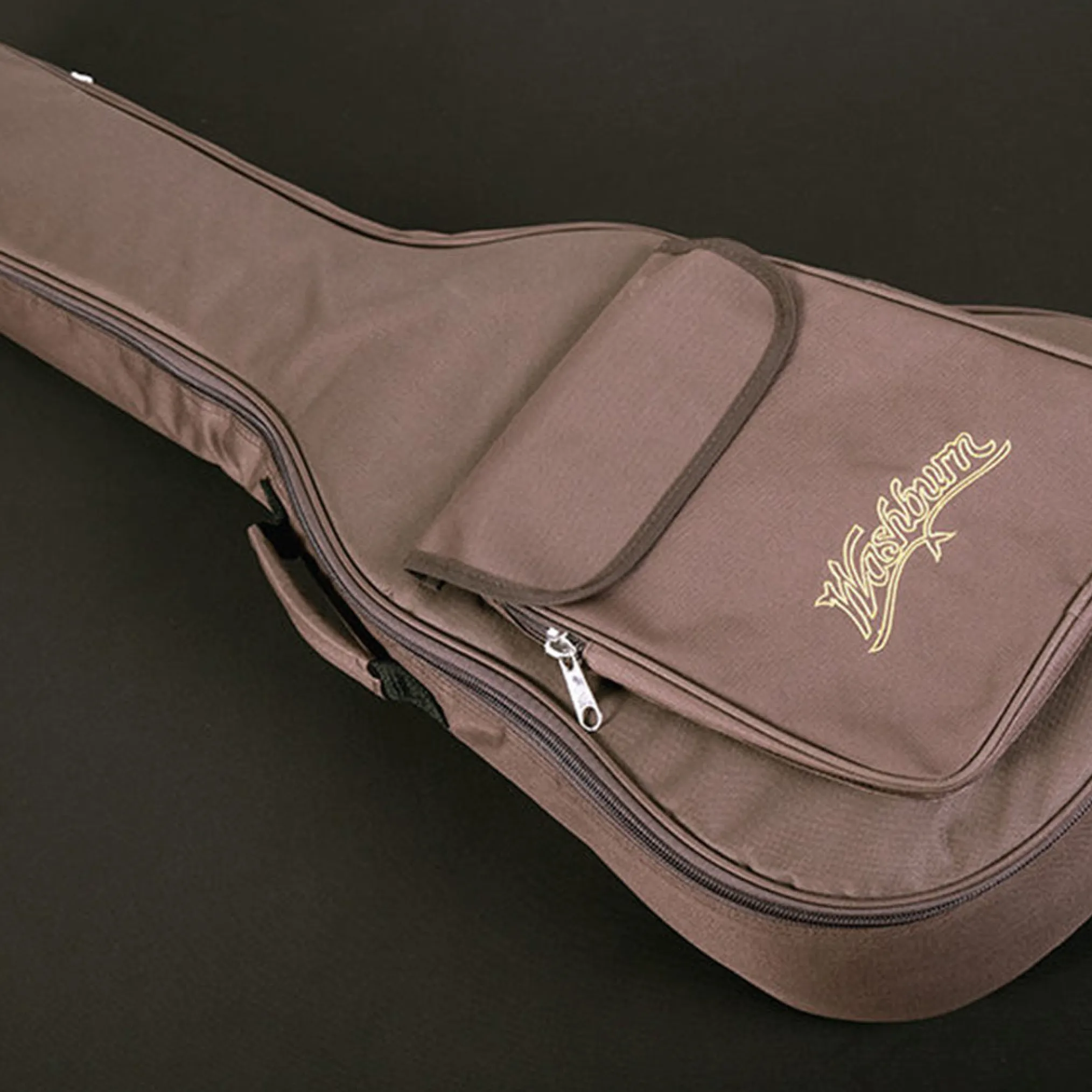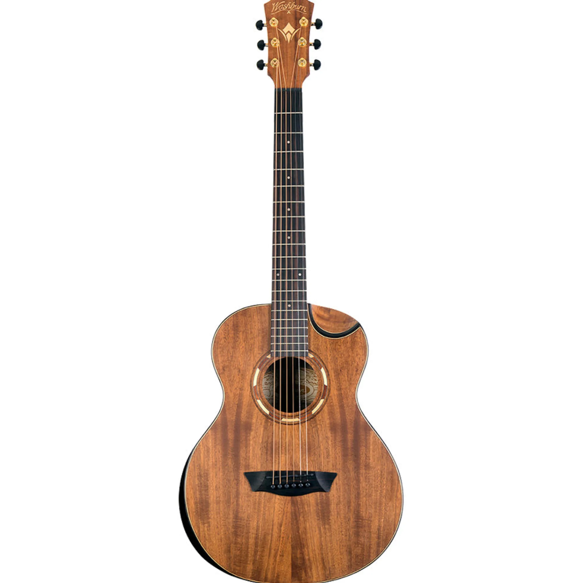 Washburn’s Comfort Series all consider ergonomic solutions to make the playing experience more comfortable. The Comfort G-Mini 55 Koa is a 7/8 size, satin finished, “Mini” Grand Auditorium body acoustic guitar with a Koa top, back and sides. Bound in Walnut, it features a rounded over “Binding Relief” underneath the player’s forearm area and a “Comfort Carve-Away” at the upper shoulder which allows for superior access to the higher frets. The mahogany neck has a ebony fingerboard with dot inlays which ties in nicely with the ebony bridge. The headstock features a maple Washburn logo as well as gold tuners with ebonite buttons. The gorgeous parquet rosette is made of alternating maple and mahogany.