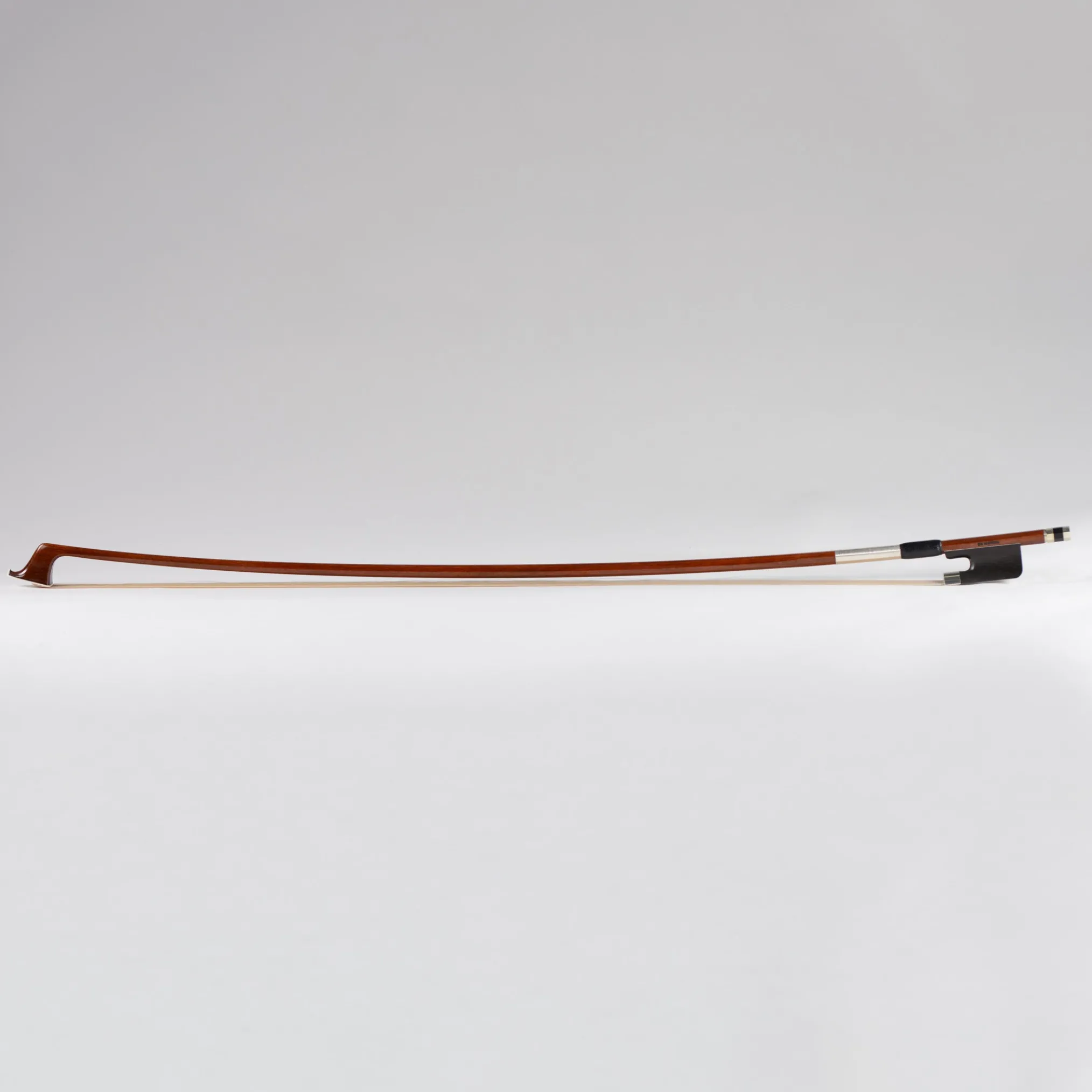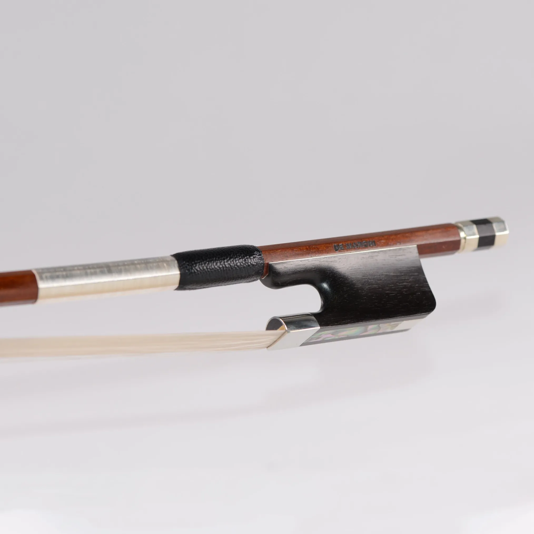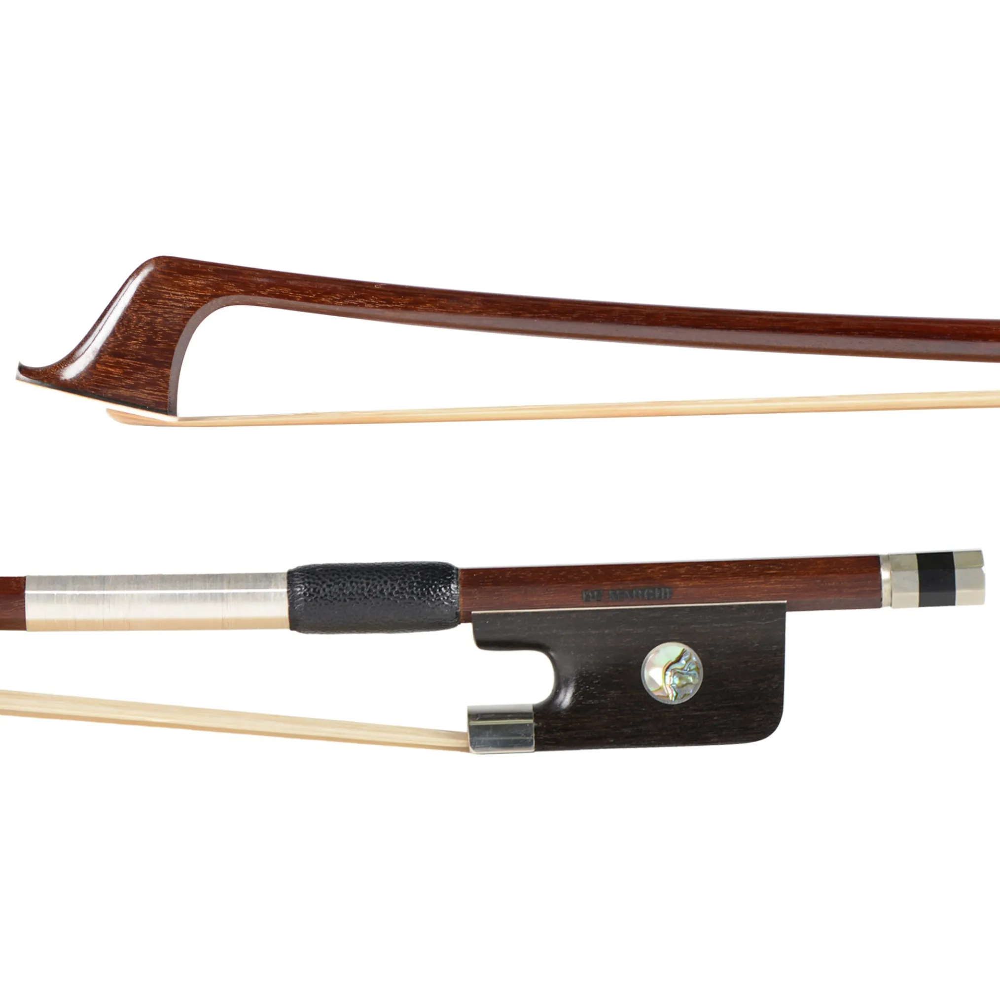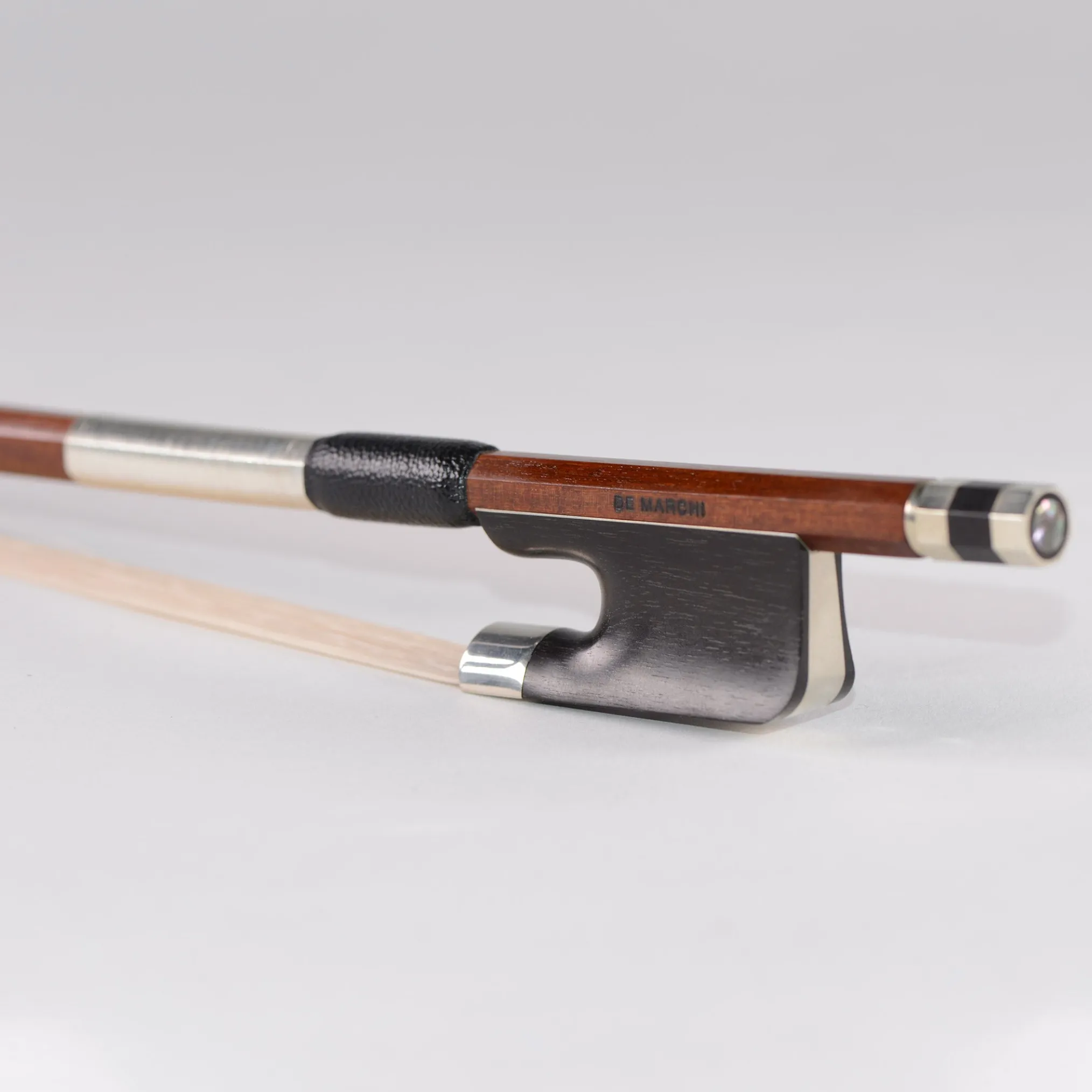 Made from selectBrazilian pernambuco wood. This bow is crafted with precision to perform with high action and response. TheWillian De Marchi NickelCello Bow is a perfectadvancing/advancedcello bow. It comes with a nickel mounted African ebony frog, and sterling silver winding.